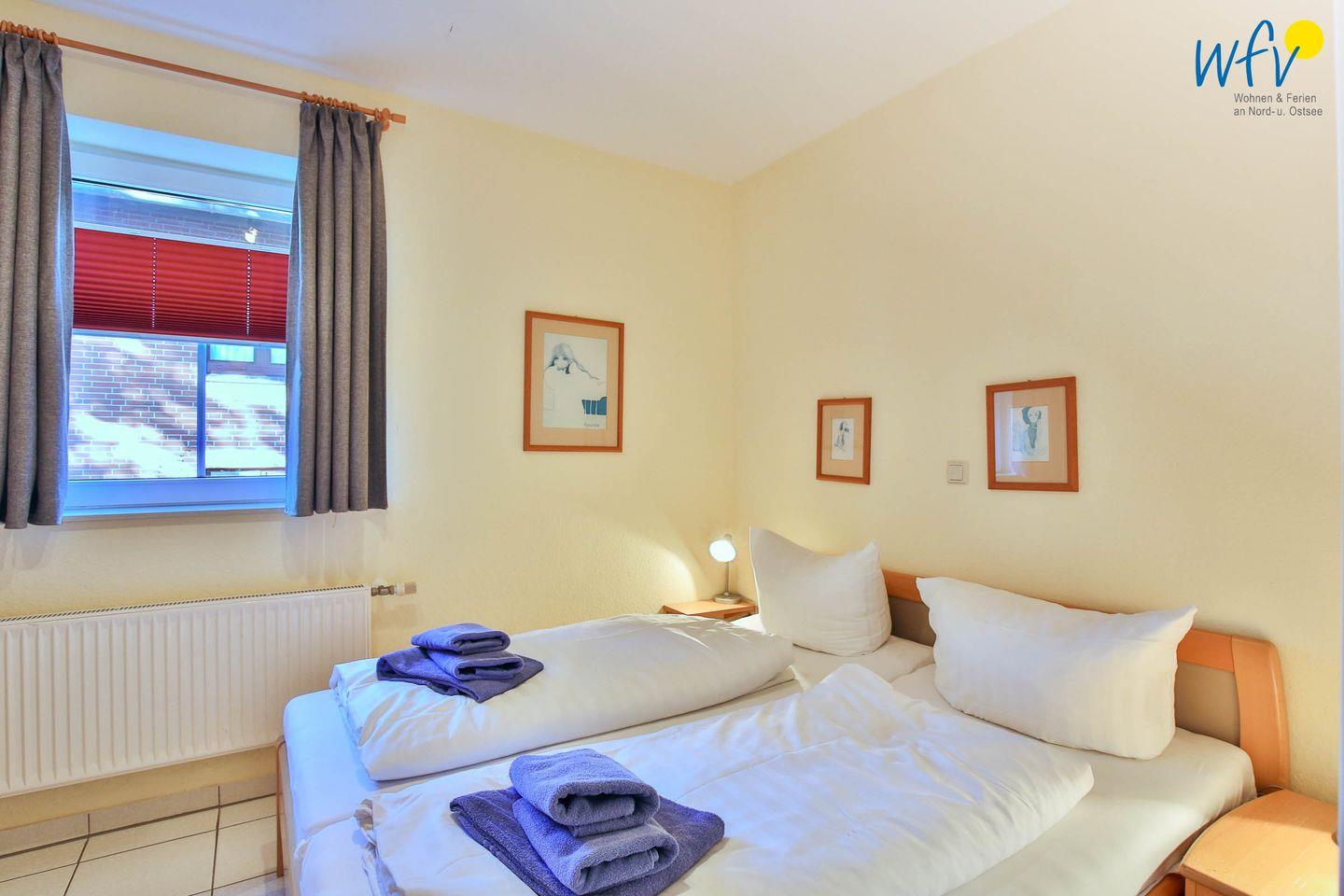 Das separate Schlafzimmer der Wangerooger Ferienwohnung ist mit einem bequemen Doppelbett ausgestattet.