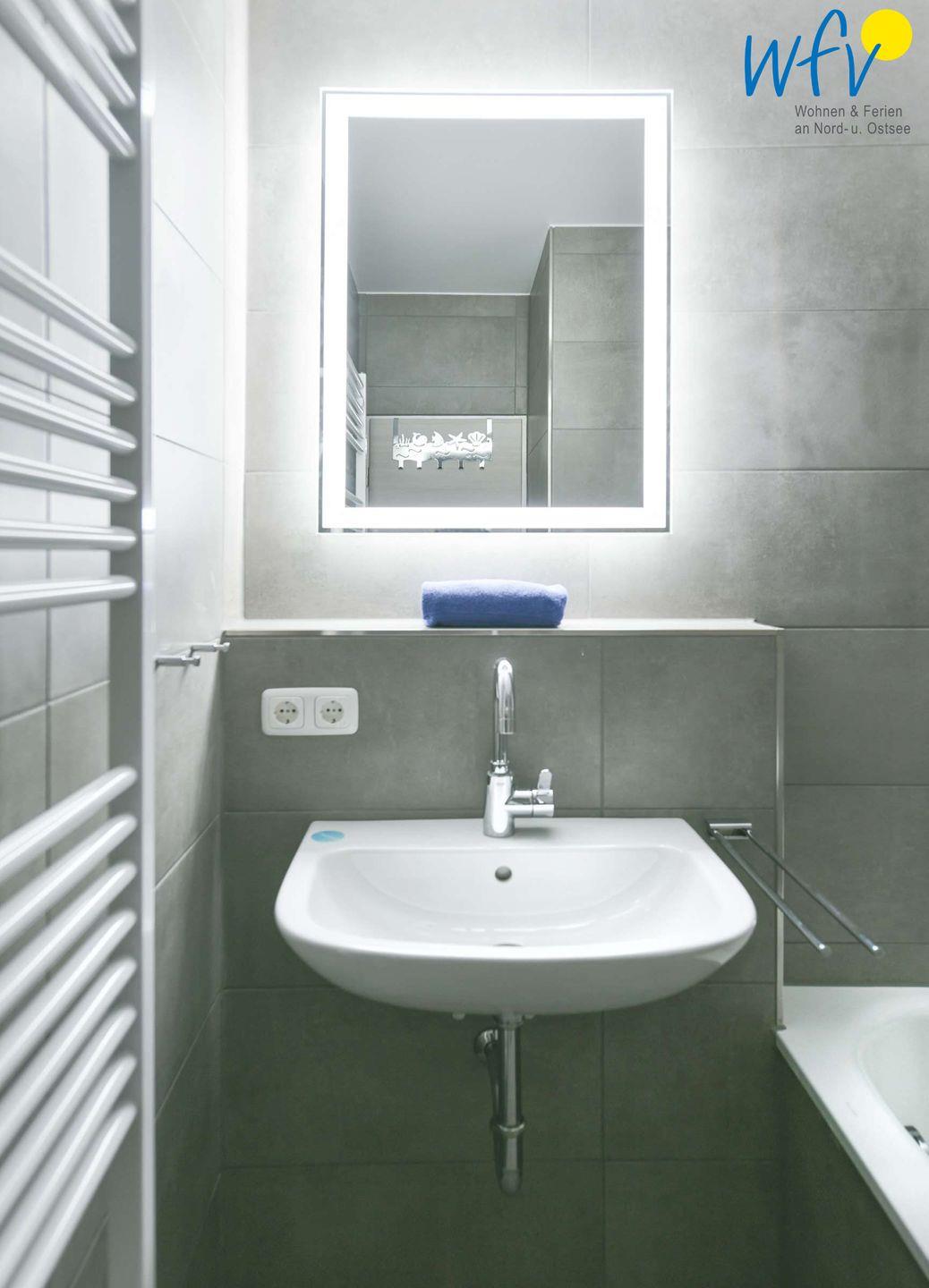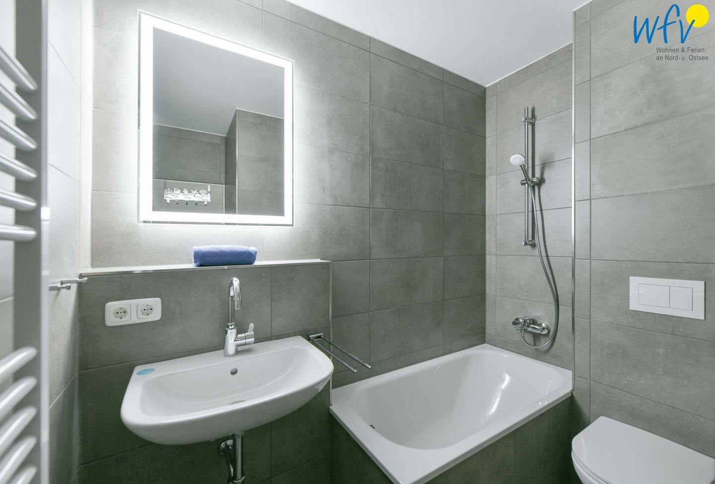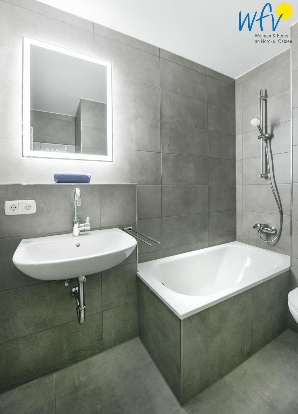 Auch für das Schaumbad zum Relaxen ist in dieser Ferienwohnung gesorgt! In dem modernen Badezimmer mit Badewanne können Sie sich nach dem Strandspaziergang wunderbar erholen.
