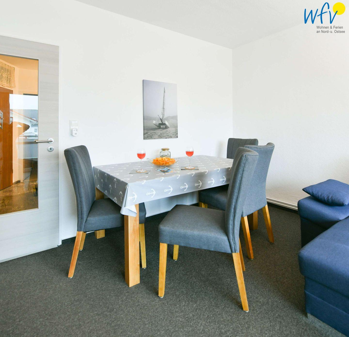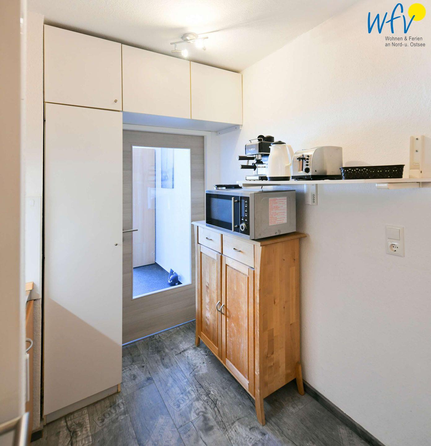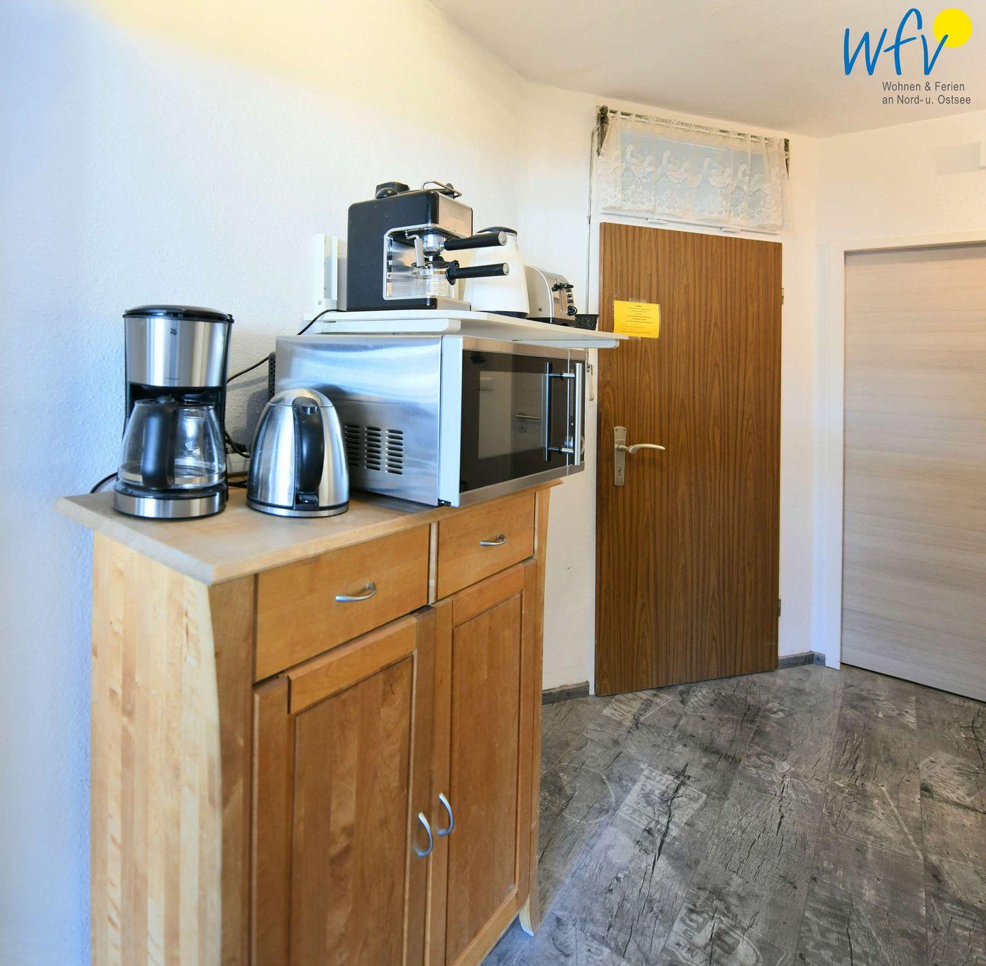 Das Ferienfrühstück und den Snack für zwischendurch können Sie bequem in der Küchenzeile zubereiten! Auch ein leckeres Abendessen lässt sich hier mit einem 2-Plattenherd sowie einer Mikrowelle mit Brat- und Backfunktion zaubern und an dem schönen Esstisch gemeinsam genießen. Oder Sie gehen auswärts essen: Direkt vor Ihrer Haustür befinden sich gemütliche Cafès und Restaurants - teilweise mit sonnigen Terrassen und Meerblick!