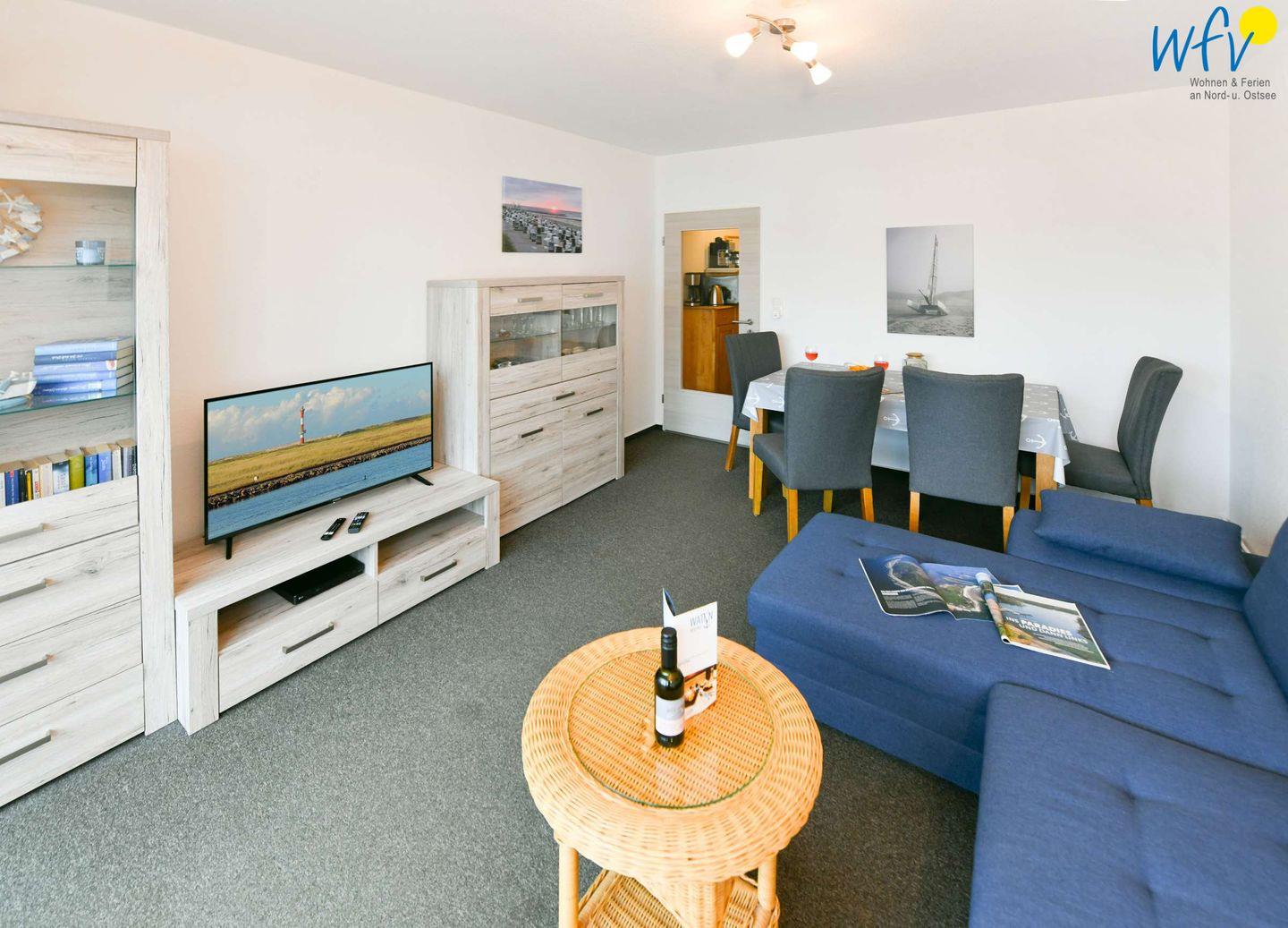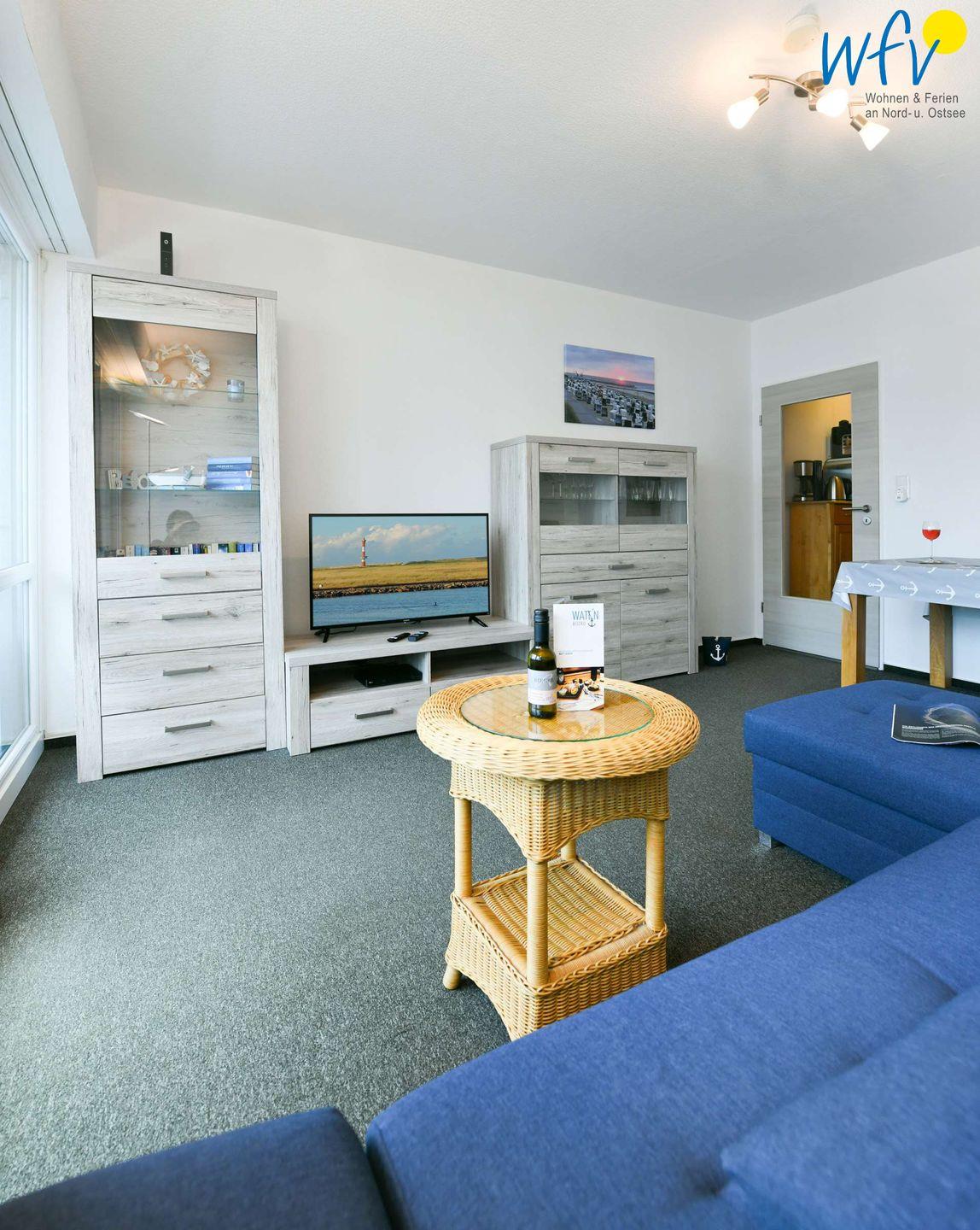 Für entspannte Stunden am Abend lädt der Wohnraum mit Couch und schöner Schrankwand sowie mit TV, DVD-Player und CD-Player zum Fernsehen und Musik hören ein. Zum Surfen vom Smartphone aus empfangen Sie freies WLAN (durch die unbegrenzte Kapazität ist Streamen möglich).