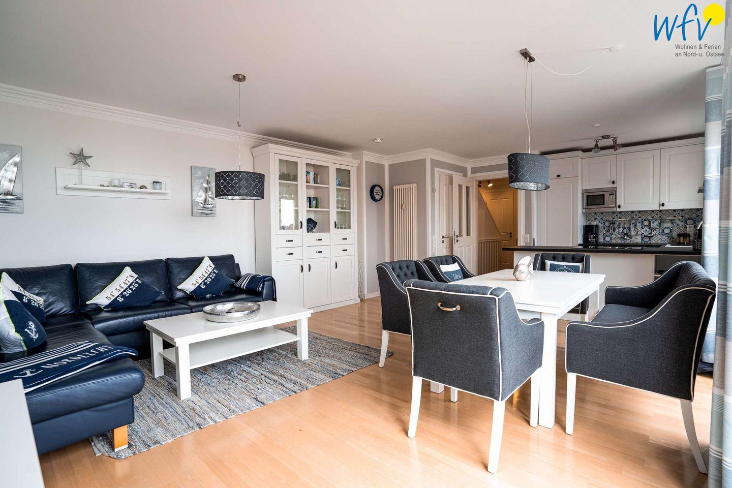 Die komfortable und vollausgestattete Küche - u.a. mit Cerankochfeld, Bora-Dunstabzug, Geschirrspüler und Backofen - lässt Sie auch im Urlaub zu Gourmets werden. An dem großen Esstisch können Sie gemeinsam klönen und genießen. Oder Sie lassen sich verwöhnen und speisen auf der schönen Meerblickterrasse des hauseigenen Restaurants "Krüsch". Auf der Terrasse in direkter Promenaden- und Strandnähe genießen Sie herrliche Stunden mit Meeresbrise.