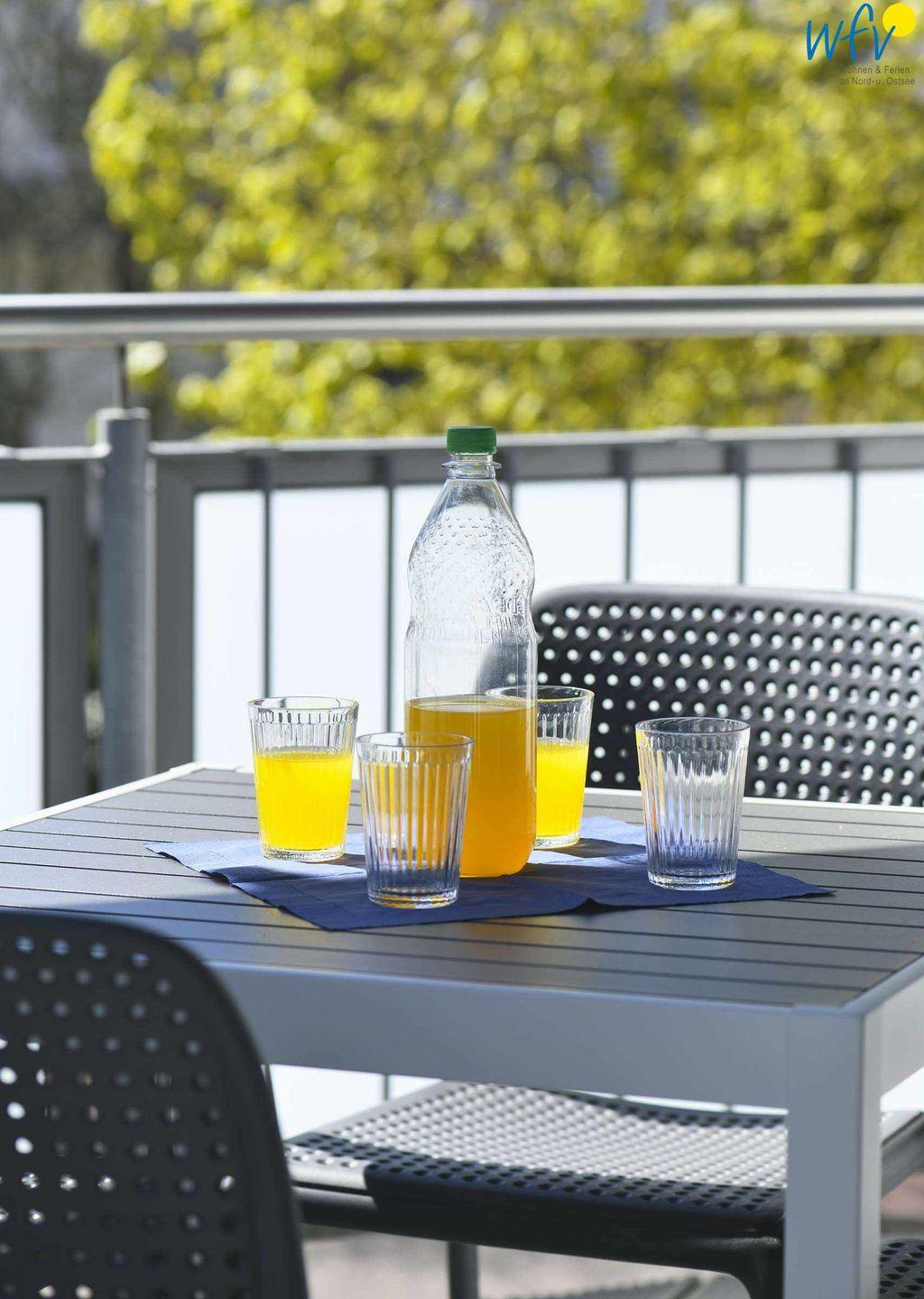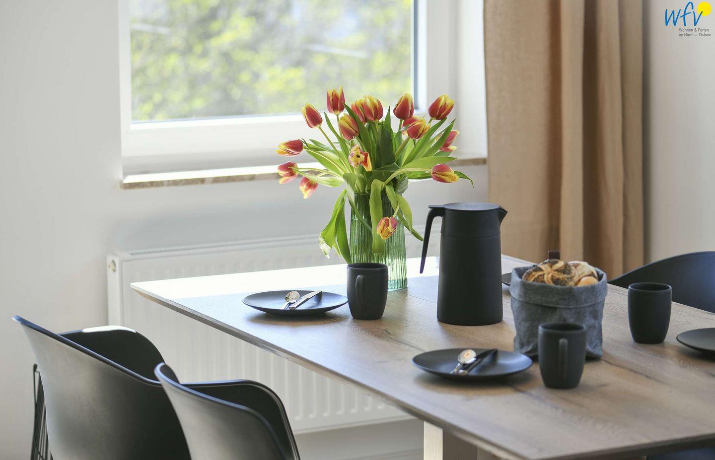 Schlicht und elegant überzeugt das Wohnzimmer mit schwarzer Küche, edlem Ledersofa und großem Esstisch. Auch von hier kommen Sie direkt auf den Balkon. Die Küche der Ferienwohnung auf Wangerooge ist bestens ausgestattet (Boschgeräte, Alessi, Nespressomaschine, Filterkaffeemaschine etc.) und lässt auch im Urlaub die Kochfreunde zur wahren Gourmets werden.