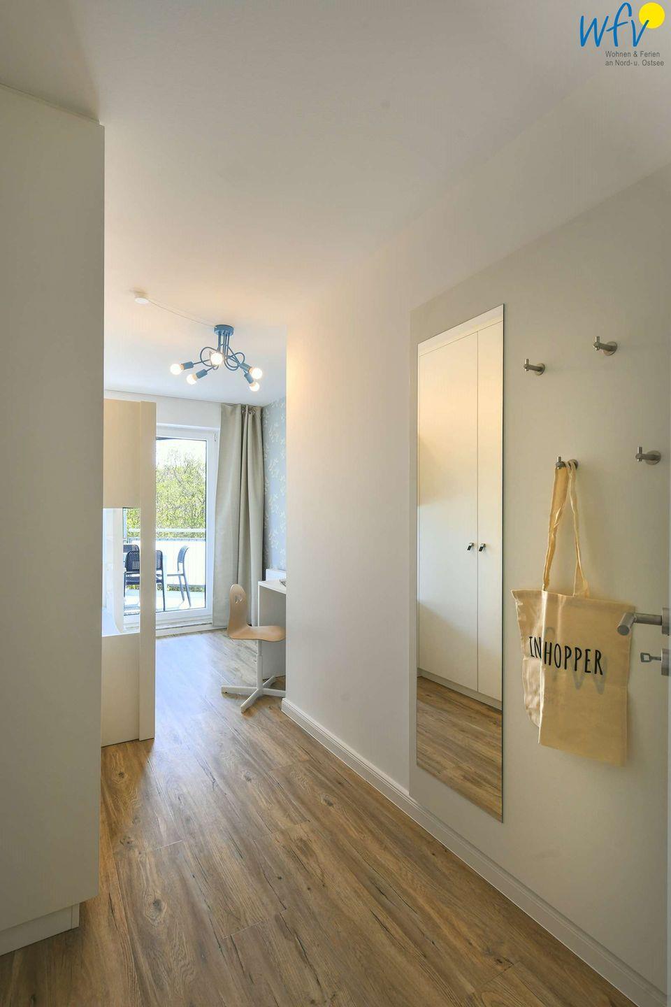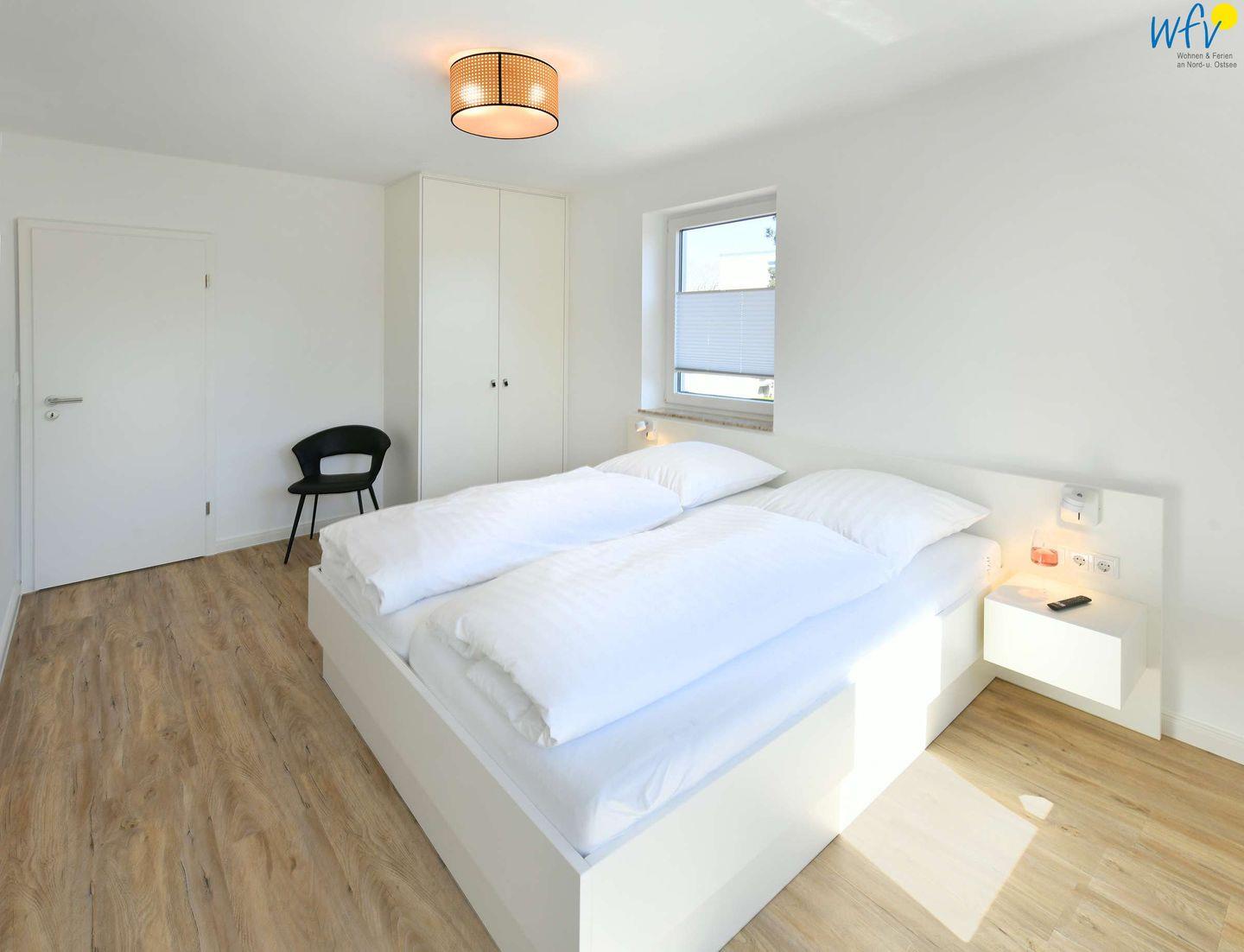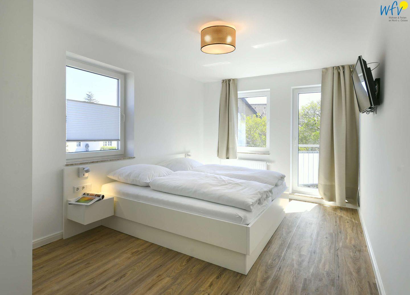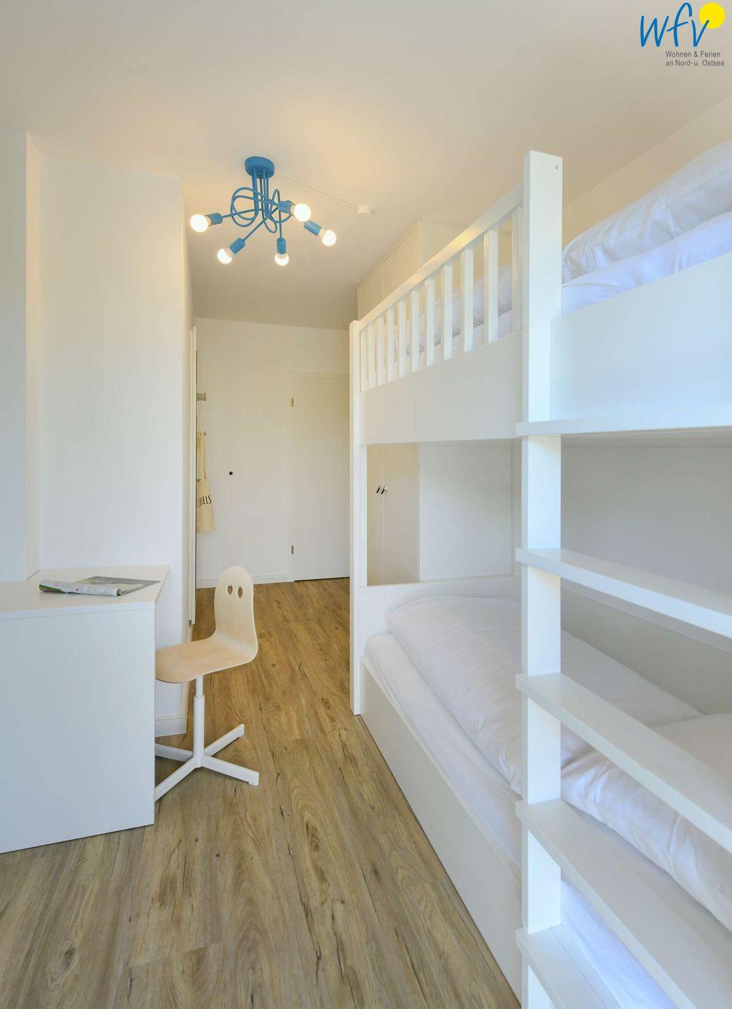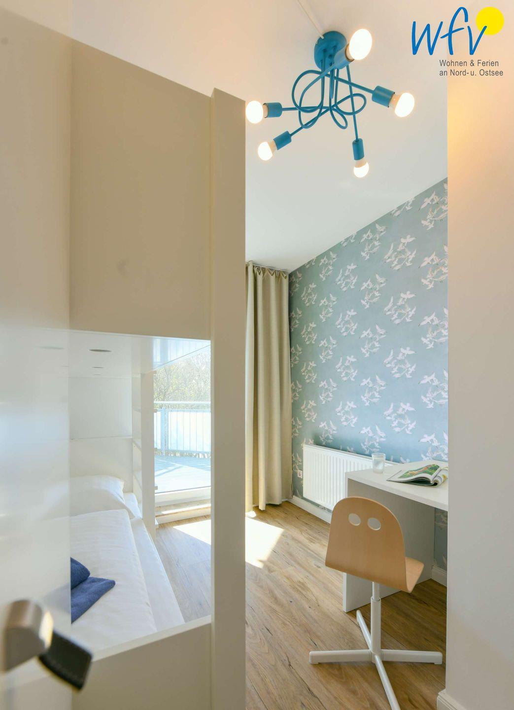Das Elternschlafzimmer ist groß und gemütlich. Das maßgeschneiderte Bett, der SmartTV sowie der direkte Zugang zum Balkon lassen Sie entspannte Tage verbringen. Das Kinderzimmer mit passgenauem Etagenbett und einem kleinen Maltisch für Kinder sowie Möwentapete und Zugang zum Balkon lässt auch die "Kleinen" den Urlaub nicht so schnell vergessen.