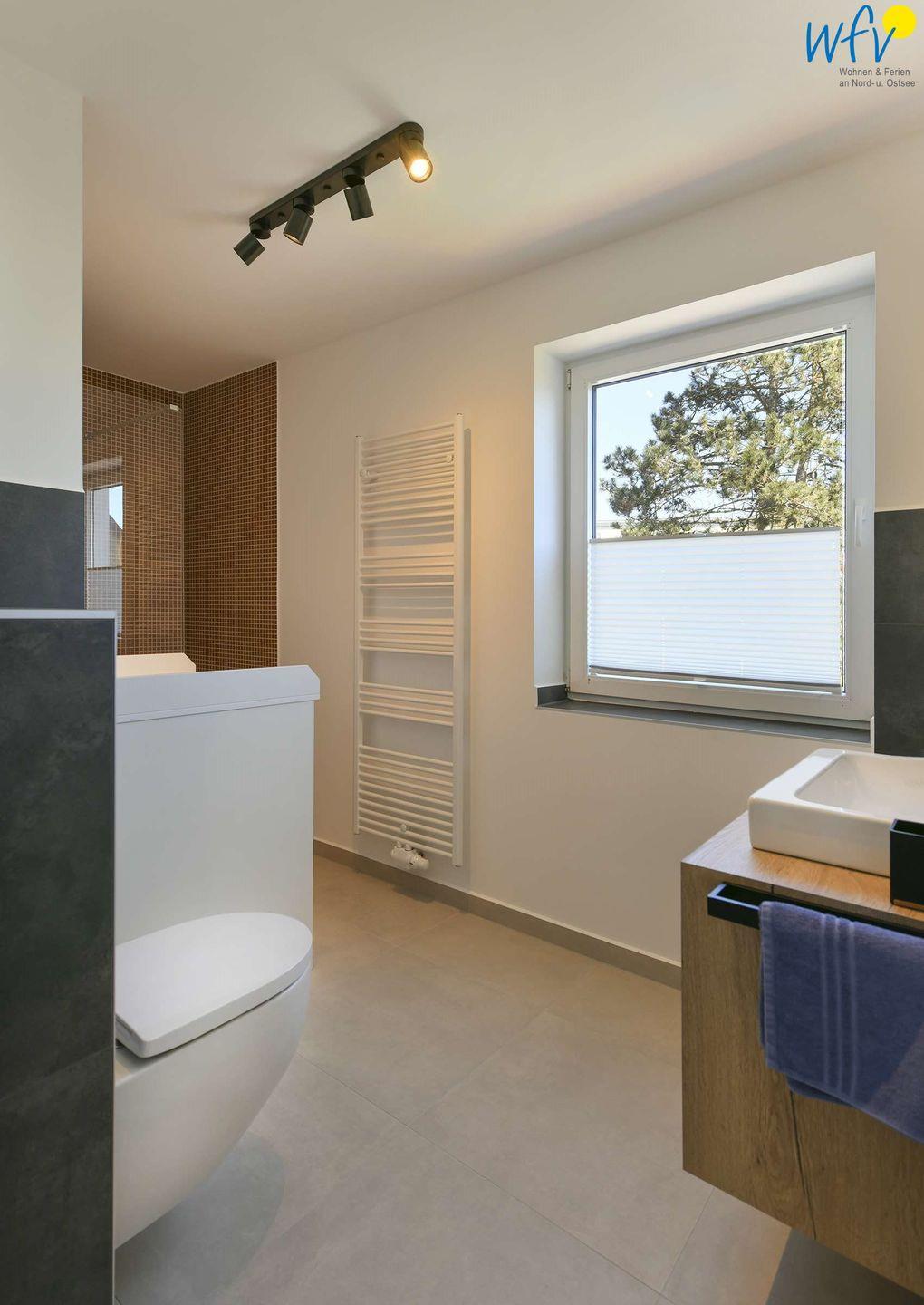 Ein weiteres Highlight ist das Badezimmer. Die große Dusche, der passgenaue Waschtisch und die fein abgestimmte Beleuchtung machen richtig Spaß. Eine Waschmaschine steht zur Verfügung.