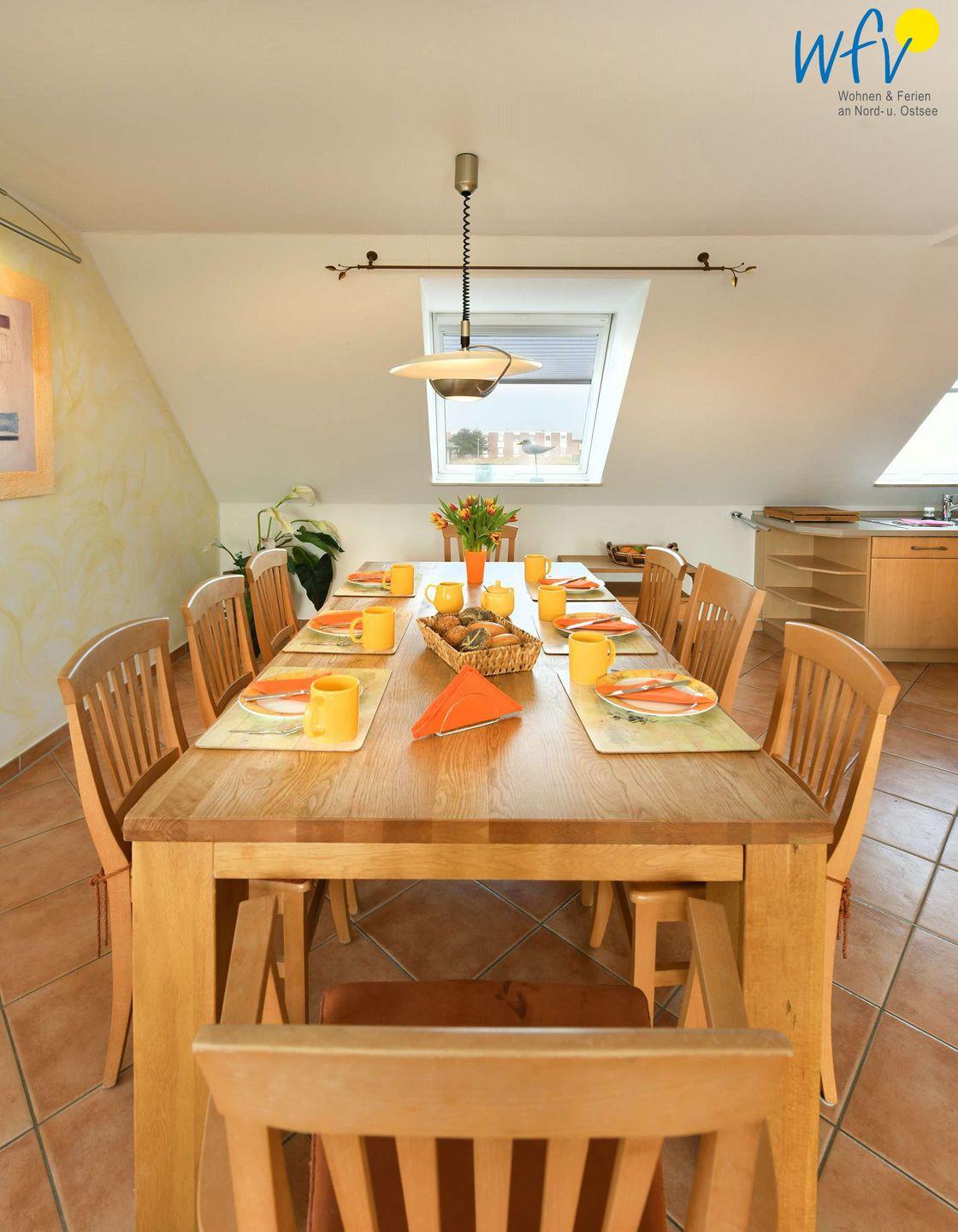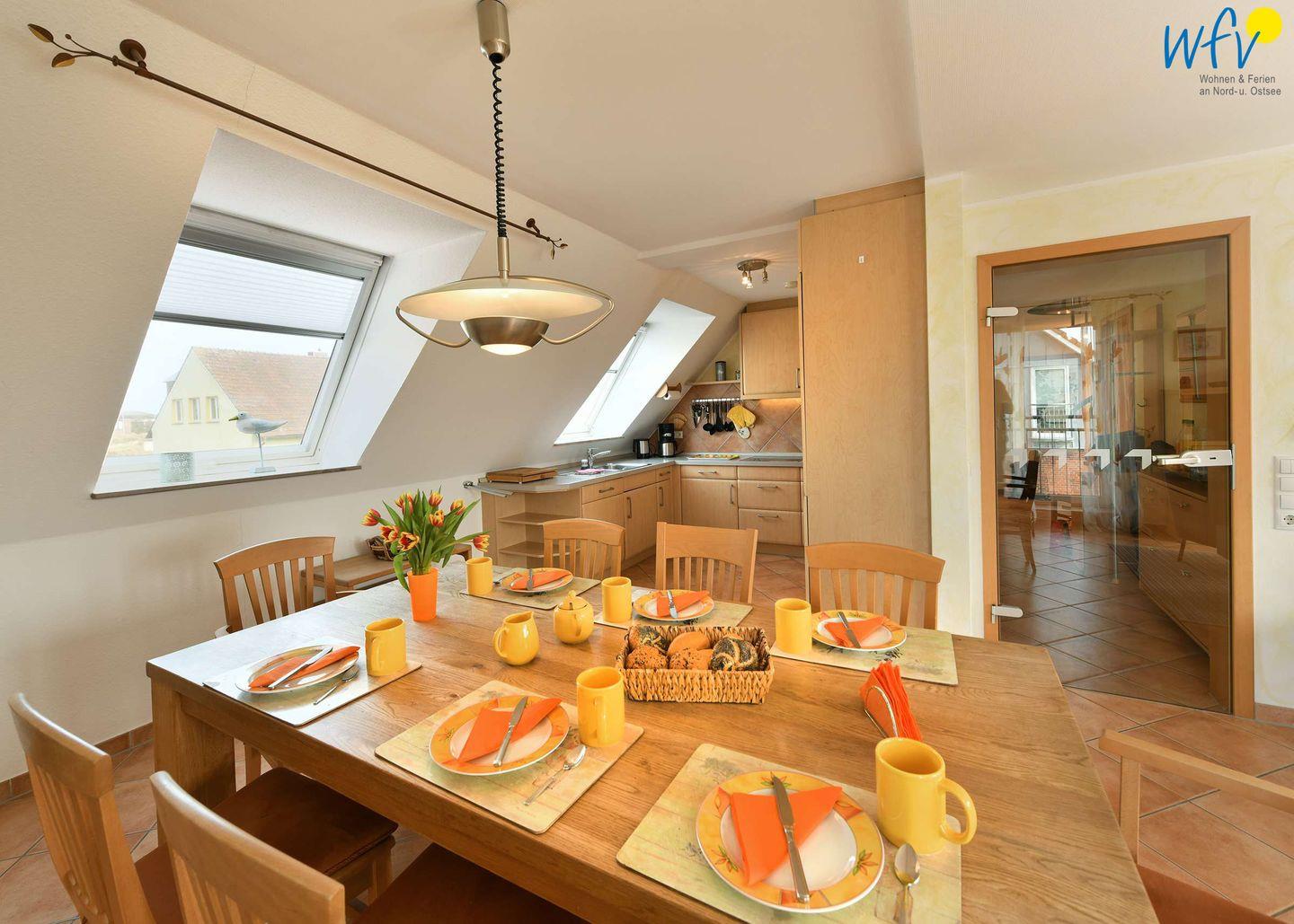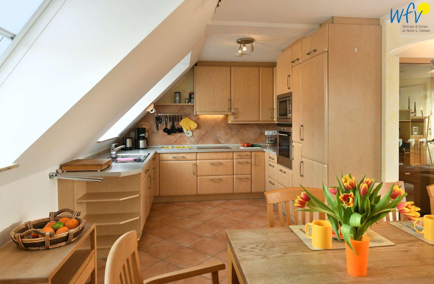 Ausgiebige Kochabende machen in der offenen, modernen und vollausgestatteten Einbauküche richtig Spaß! Auf dem Herd brutzelt der frische Nordseefisch, im Ofen backen die Kroketten. Den Abwasch erledigt für Sie die Spülmaschine.