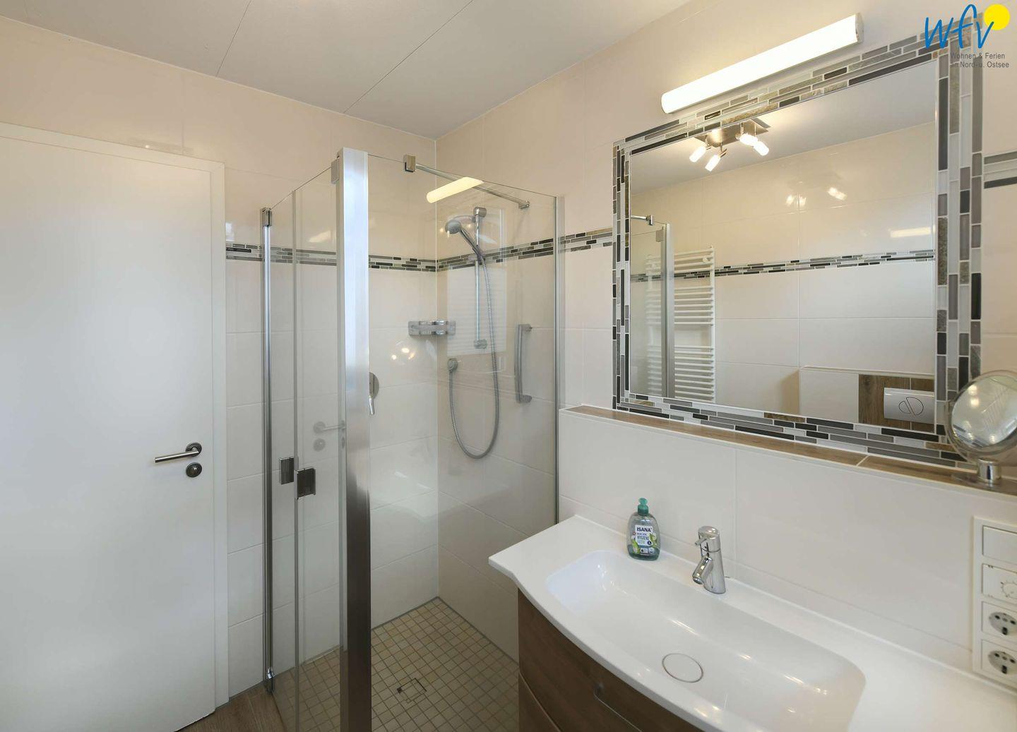 Wohnkomfort erwartet Sie auch in dem gepflegten Badezimmer in stilvollem Design - u.a. mit bodengleicher Dusche, Fenster und großem Spiegel.