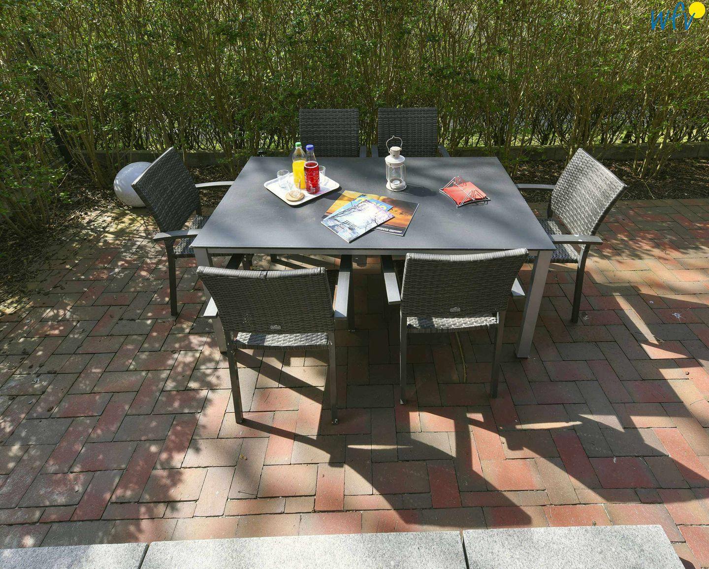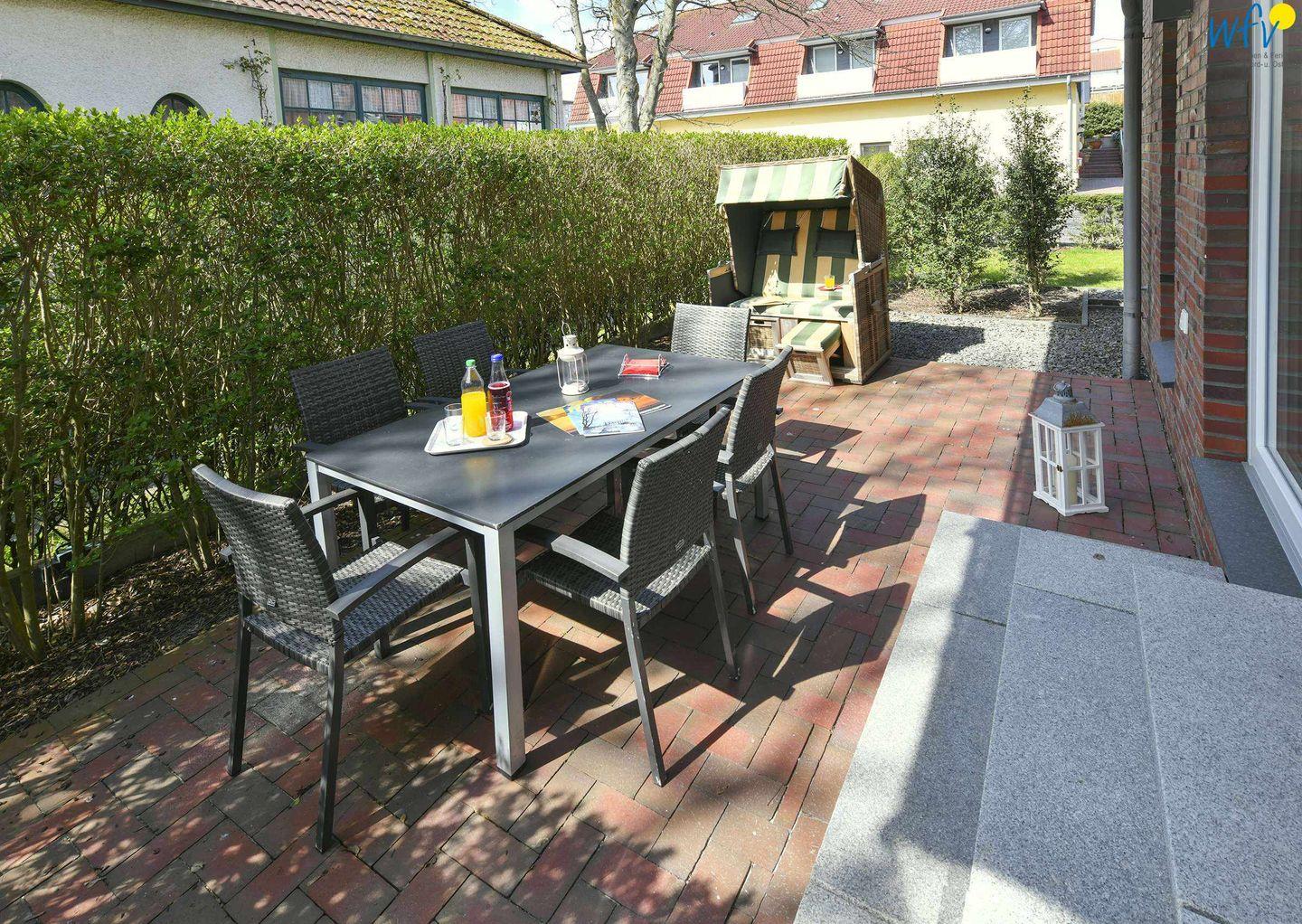 Auf der windgeschützten Terrasse der Wangerooger Ferienwohnung erwarten Sie herrliche Sonnenstunden. Durch Gartenmöbel und Strandkorb können Sie hier mit der gesamten Familie gemütlich zusammensitzen!