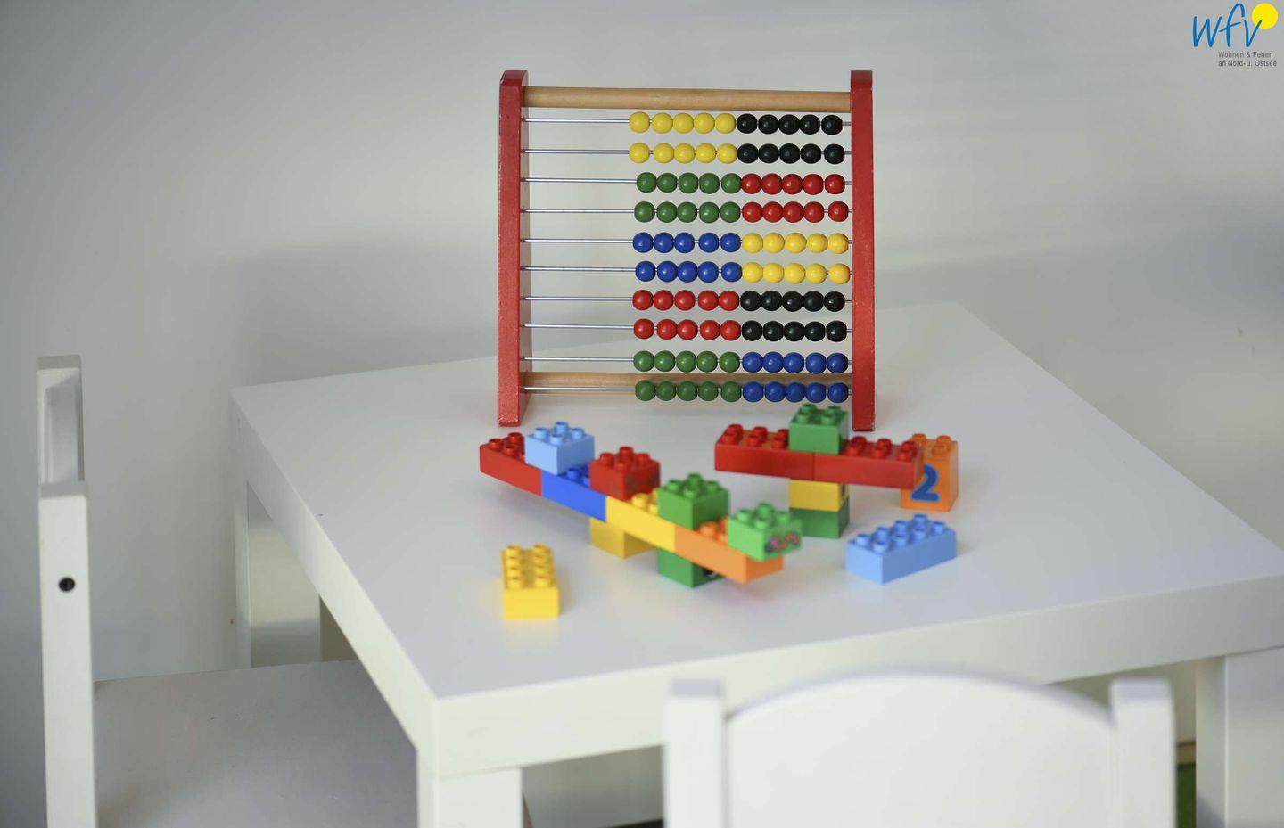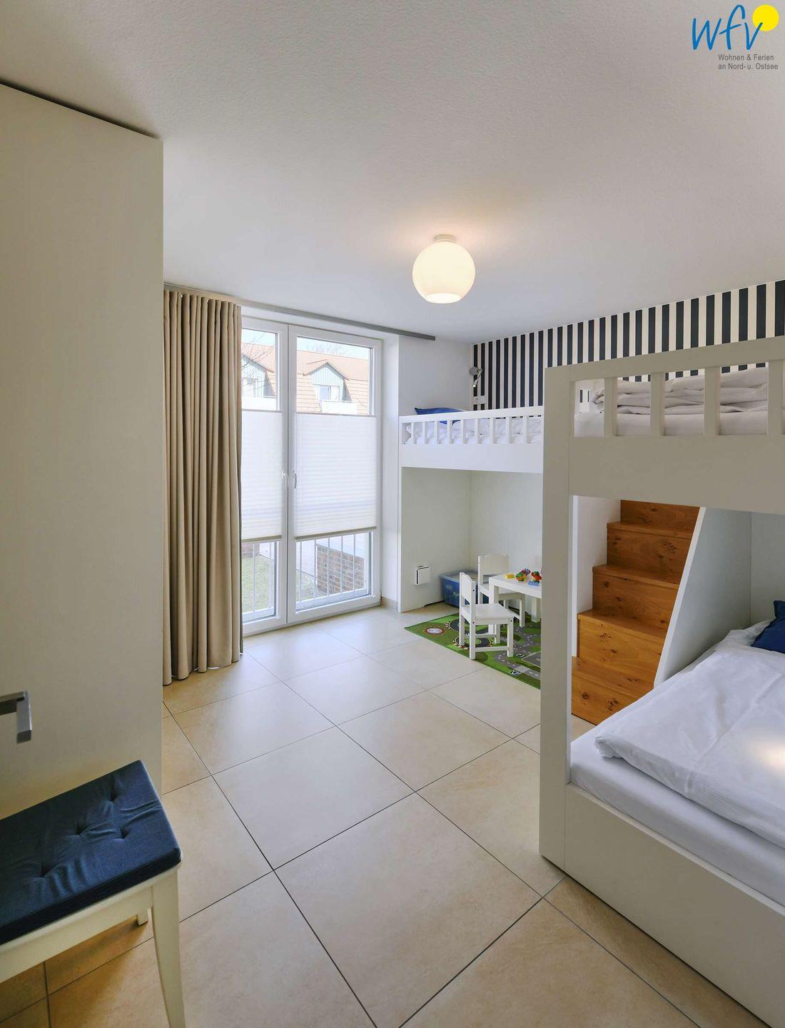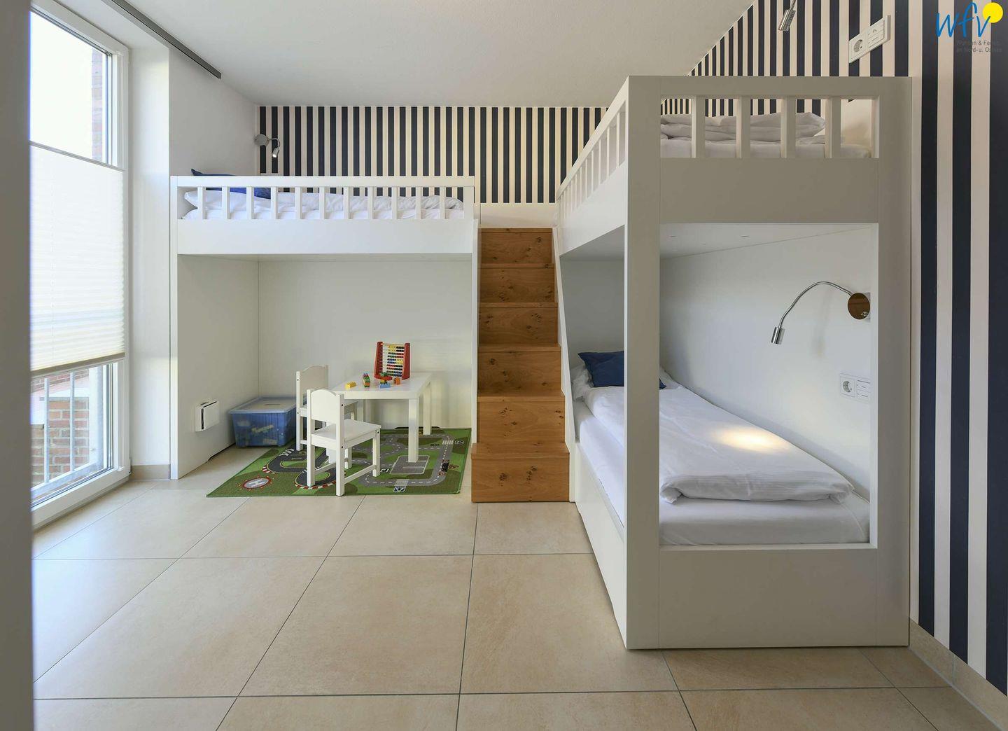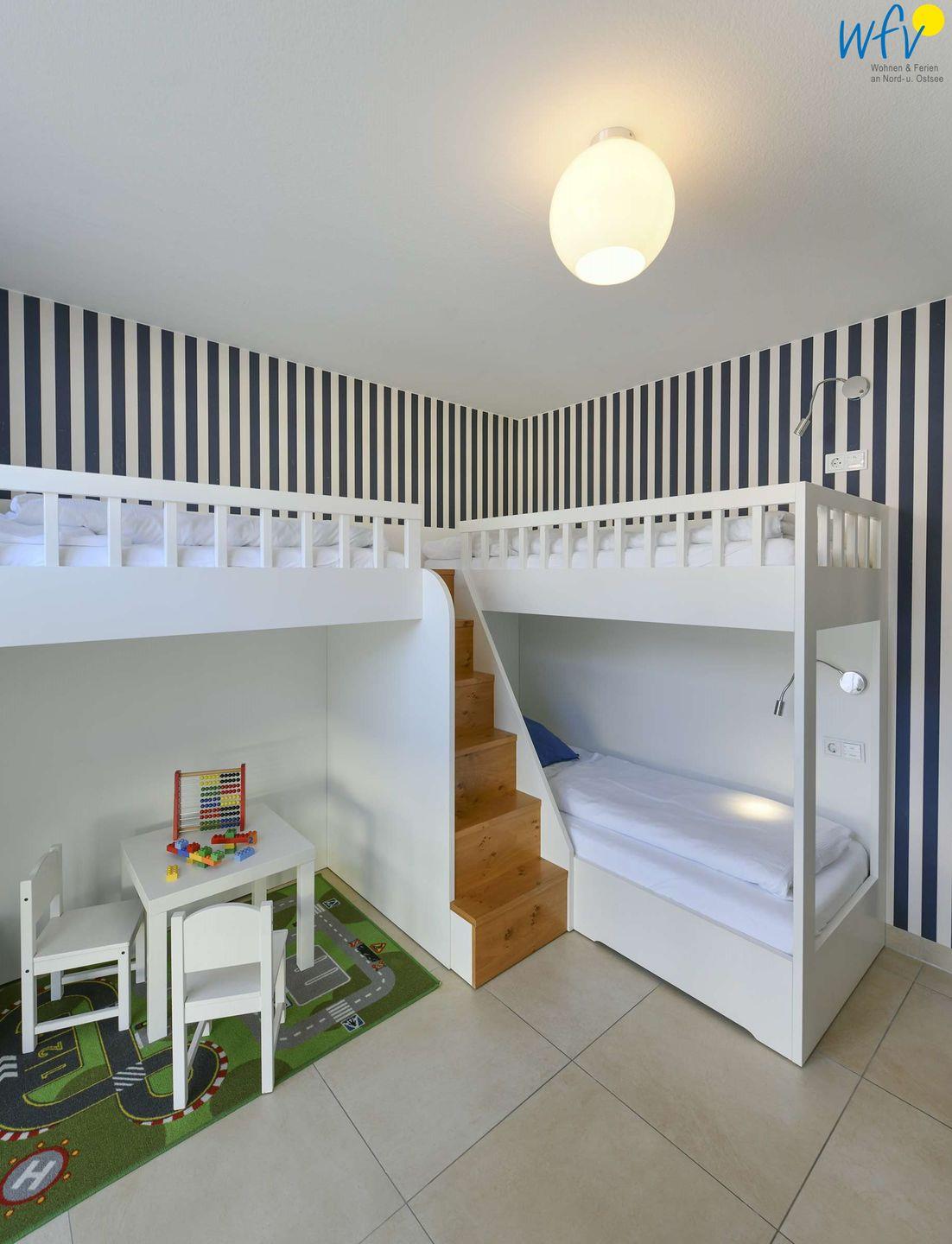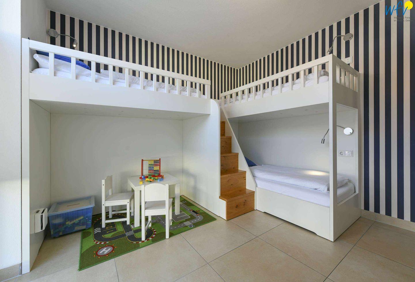 Zwei separate Schlafzimmer mit jeweiligem LED-Fernseher, maßgefertigten Möbeln und allergikergerechter Ausstattung ermöglichen Ihnen den wohlverdienten Schlaf, den Sie im Urlaub haben sollten! Im zweiten Schlafzimmer befindet sich eine begehbare Treppe zwischen den beiden Oberbetten. Auch ein kleiner Spielbereich ist bereits eingerichtet. Das erste Oberbett hat die Größe von 1,70 x 0,80 Metern und ist somit nur für unsere kleinen Gäste gedacht. Die beiden anderen Betten haben Standardmaße. Beide Schlafzimmer lassen sich durch blickdichte Vorhänge fast komplett abdunkeln. Kinderbett und Kinderhochstuhl gehören in dieser Ferienwohnung zur festen Ausstattung (ohne weitere Kosten).