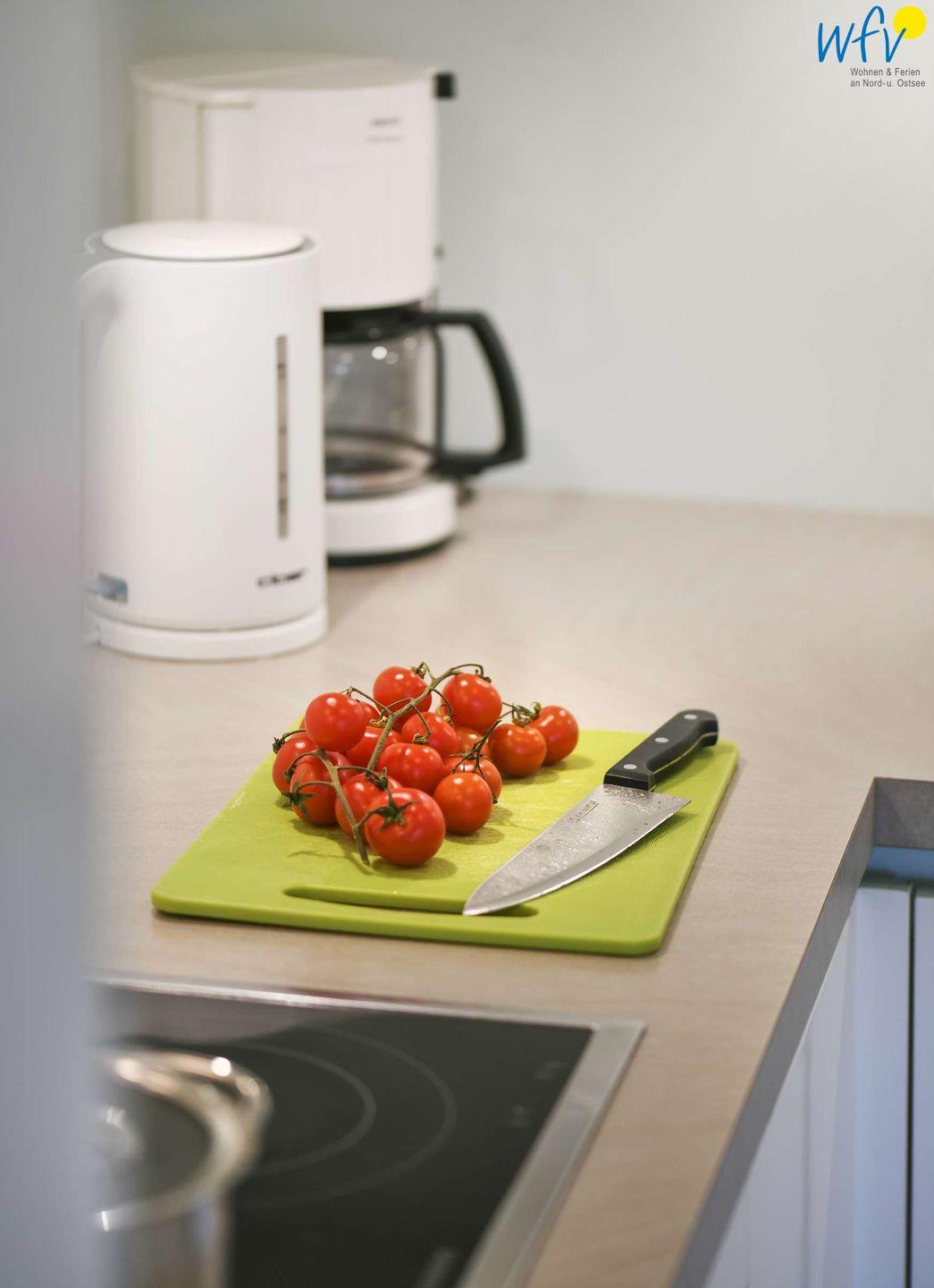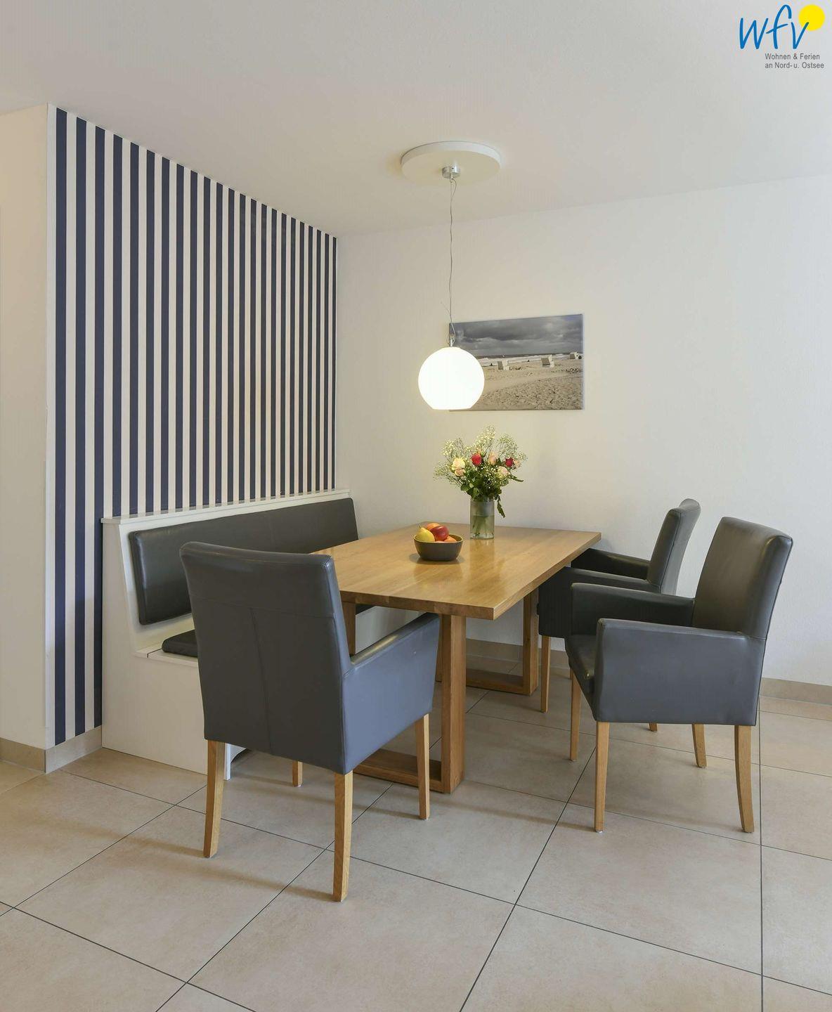 Geschirrspüler, Backofen, Kühlschrank mit Gefrierfach und Mikrowelle in der voll ausgestatteten Küche garantieren Ihnen eine bequeme Selbstverpflegung. Selbstverständlich verfügt die Küche auch über diverse Kleingeräte wie Toaster, Kaffeemaschine, Eierkocher, Wasserkocher und ein Handrührgerät. In dem gemütlichen Essbereich können Sie bereits beim Frühstück die Ruhe und Entspannung in Ihrem Wangerooge-Urlaub genießen!