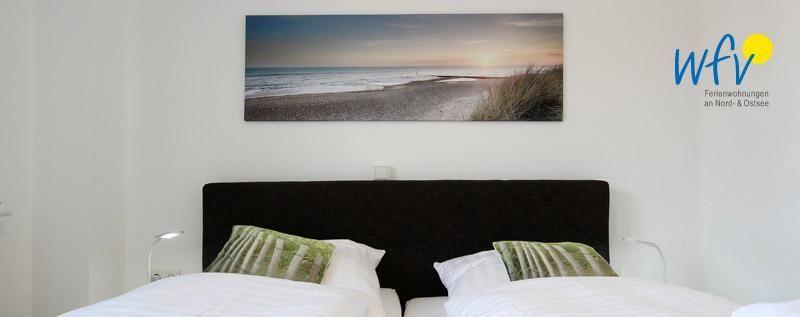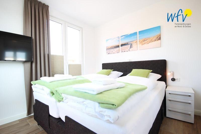 Diese hochwertige, moderne Ferienwohnung befindet sich im 1. OG und bietet auf 65 m² Wohnfläche Platz für fünf Personen. Zwei separate Schlafzimmer mit komfortablen Doppelbetten (Boxspringbetten) garantieren angenehme Rückzugsmöglichkeiten. Eine fünfte Person findet auf der ausziehbaren Couch im Wohnraum eine gemütliche Nachtruhe.