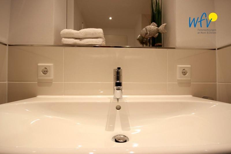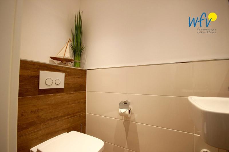 Das moderne Badezimmer mit barrierefreier Dusche bietet ebenfalls Komfort! Für angenehme Ausweichmöglichkeiten bei einem Aufenthalt mit mehreren Personen verfügt die Ferienwohnung zusätzlich über ein Gäste-WC.