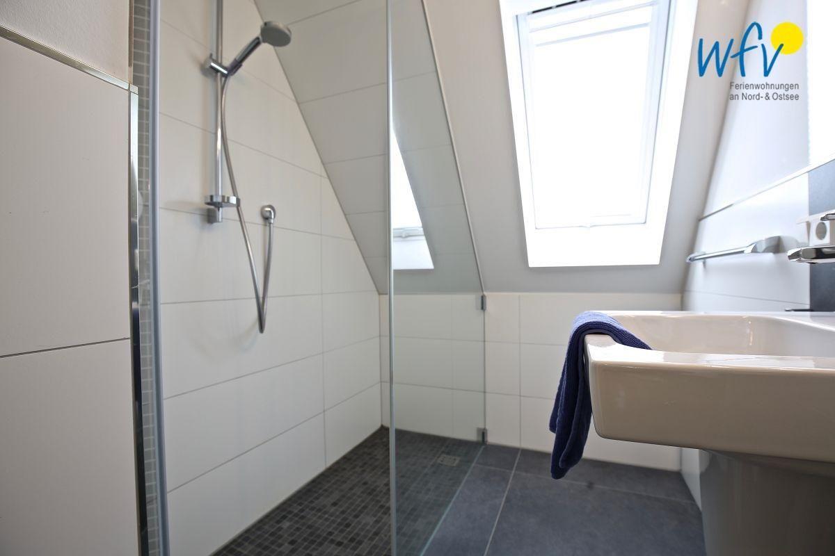 Auch das moderne Badezimmer mit natürlicher Beleuchtung und ebenerdiger Dusche lädt zum Wohlfühlen ein. Zudem befindet sich im Dachgeschoss eine Sauna, in der Sie herrlich relaxen können!