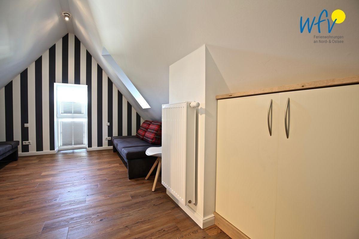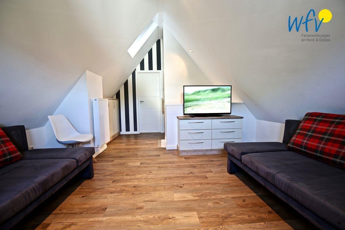 Im Dachgeschoss befindet sich ein weiteres separates Schlafzimmer mit zwei Einzelbetten ( 1,70m ) sowie eine Galerie mit zwei hochwertigen Schlafsofas ( 1,70m ) und einem Flatscreen.