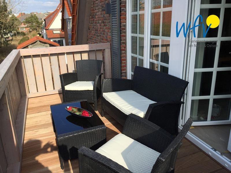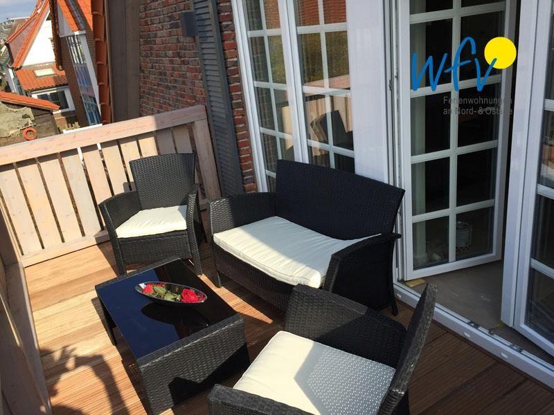 Auf dem sonnigen Süd-Balkon erwarten Sie entspannte Stunden an der frischen Nordseeluft! Hochwertige Gartenmöbel laden zum gemütlichen Beisammensitzen, Lesen und Ausruhen ein...