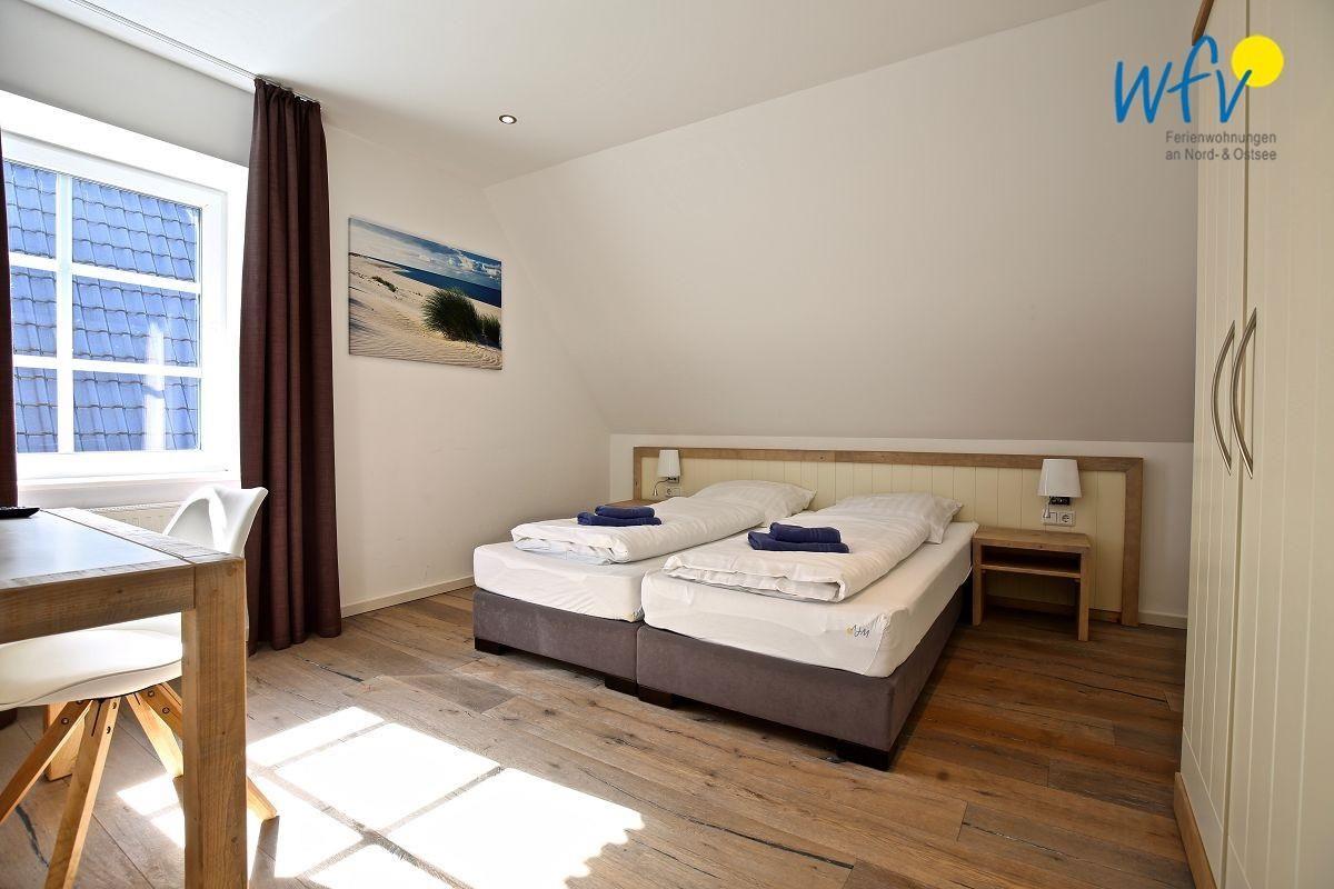 Das separate Schlafzimmer im Obergeschoss ist mit einem modernen Boxspringbett ( 1,80m ) ausgestattet. Vom Bett aus können Sie fernsehen.