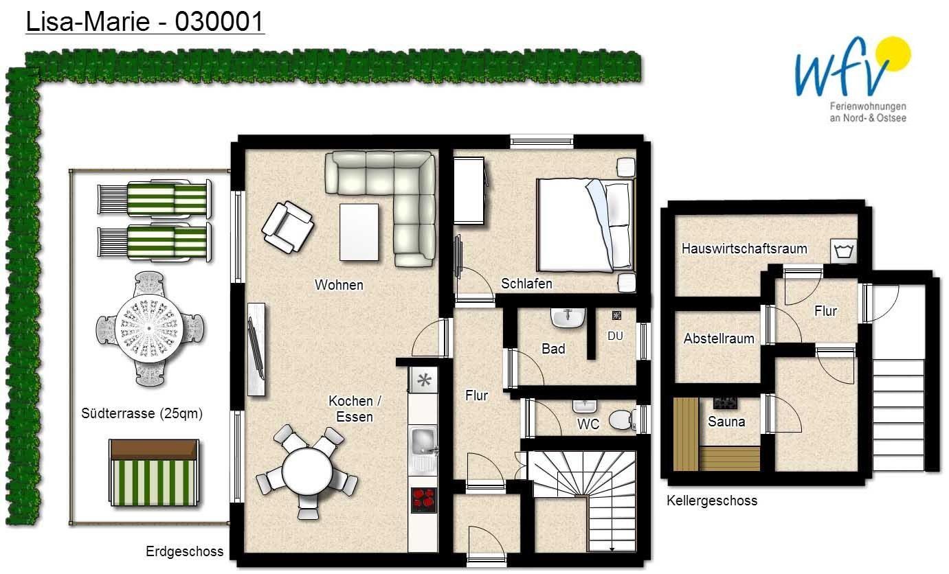 Auch für wohltuende Verwöhn-Momente ist gesorgt: die Wangerooger Ferienwohnung verfügt über eine wohnungseigene Sauna (im Kellergeschoss; sep. Eingang) sowie über eine große Süd-Terrasse mit Garten und eigenem Strandkorb. Mit der gesamten Familie werden Sie sich hier wunderbar erholen können!