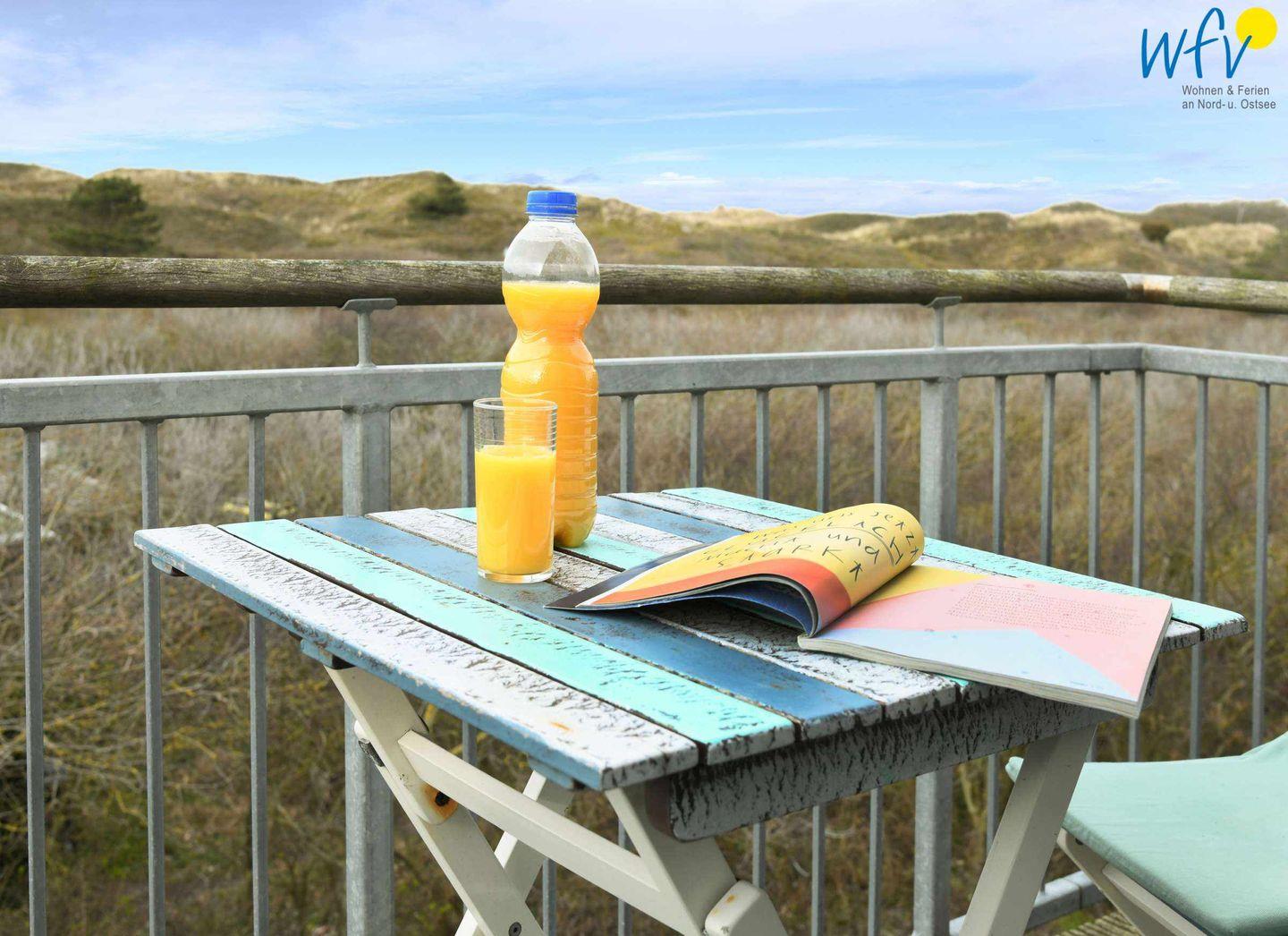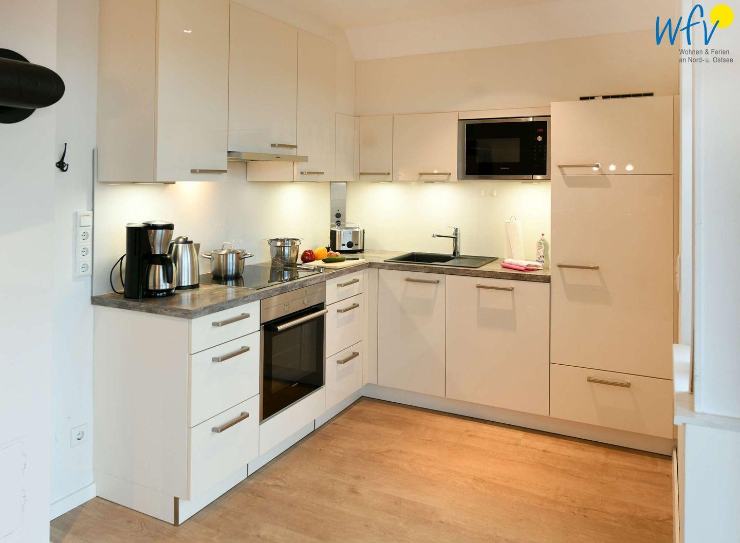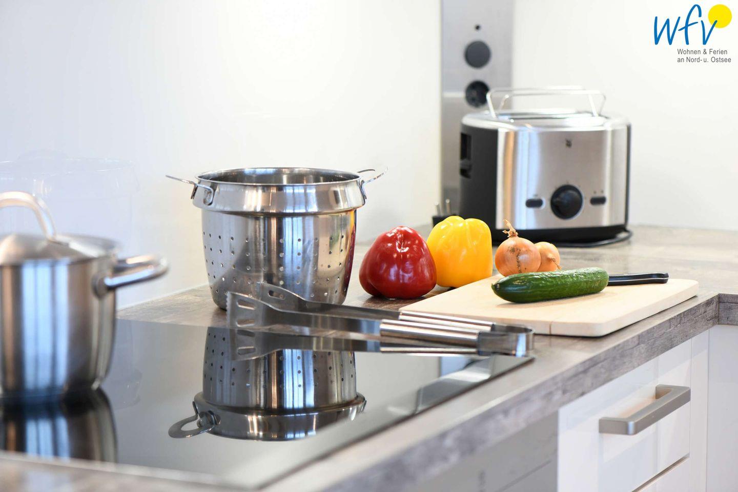 Hoher Wohnkomfort erwartet Sie auch in der modernen Wohnküche mit Kühlschrank & integriertem 4-Sterne (17l) Gefrierfach, Backofen, Induktionsherd, Mikrowelle und Geschirrspüler. Oder möchten Sie beim Abendessen noch etwas Nordseeluft schnuppern? Auf der großen Terrasse mit Gartenmöbeln und Strandkorb können Sie wunderbar den Urlaubstag ausklingen lassen und den herrlichen Dünenblick genießen.