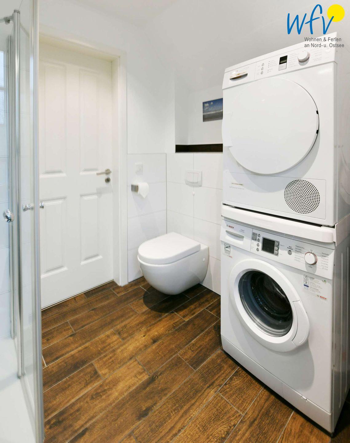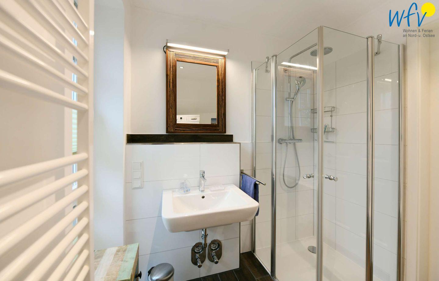 Das elegante Tageslichtbad mit Dusche, Waschbecken, Spiegel, WC, Föhn und Handtuchheizung sorgt für weiteren Wohnkomfort. Hier stehen Ihnen außerdem Waschmaschine und Trockner zur Verfügung.