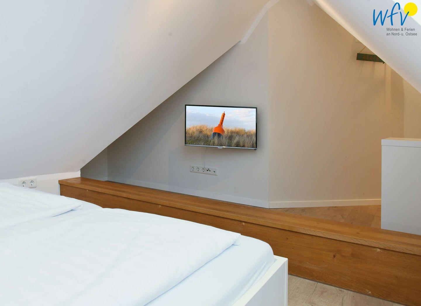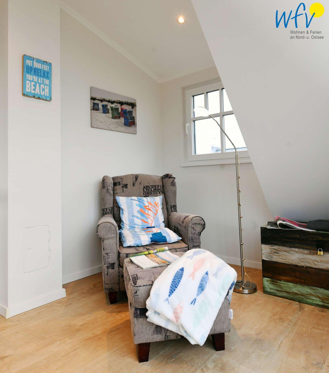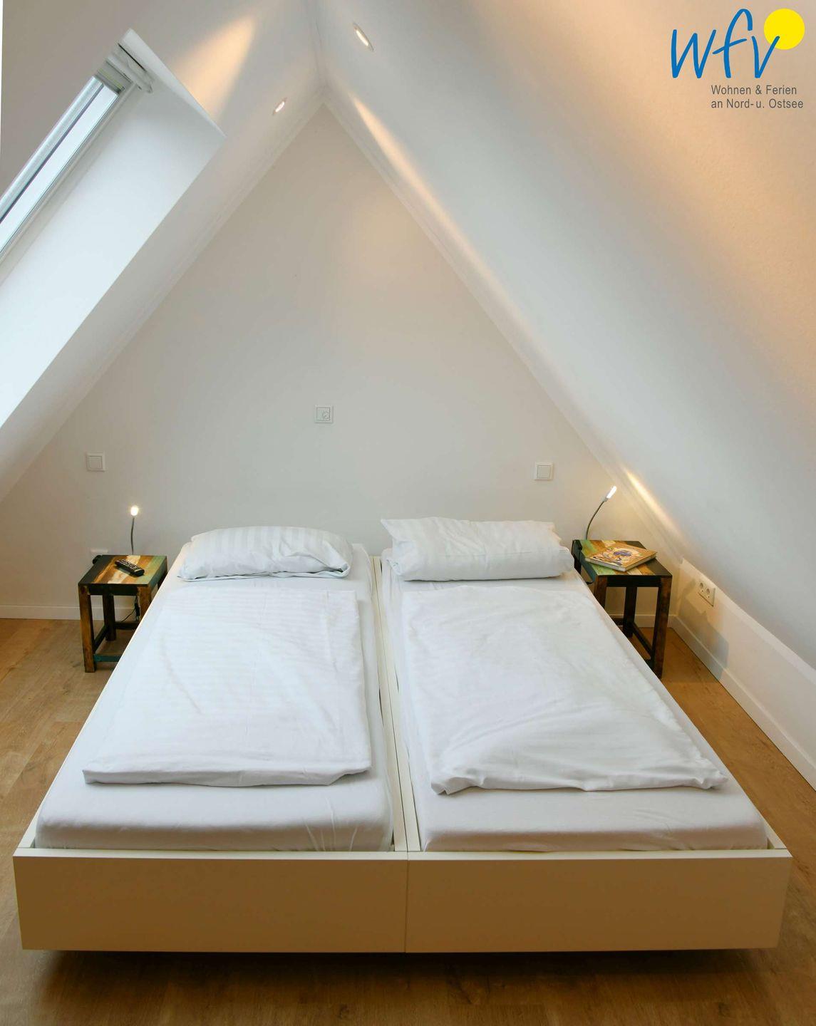 Zwei separate Schlafzimmer bieten Ihnen angenehme Rückzugsmöglichkeiten. Eines der Schlafzimmer (OG) ist mit einem Doppelbett (Boxbett 180 x 200 cm) sowie mit einem TV und einem Kleiderschrank ausgestattet. Das andere Schlafzimmer befindet sich im Dachgeschoss und verfügt über zwei zusammenschiebbare Einzelbetten (je 90 x 200 cm), ein TV und eine Kommode. Angrenzend erwartet Sie hier ein zusätzlicher gemütlicher Wohnbereich mit Leseecke und Balkon.