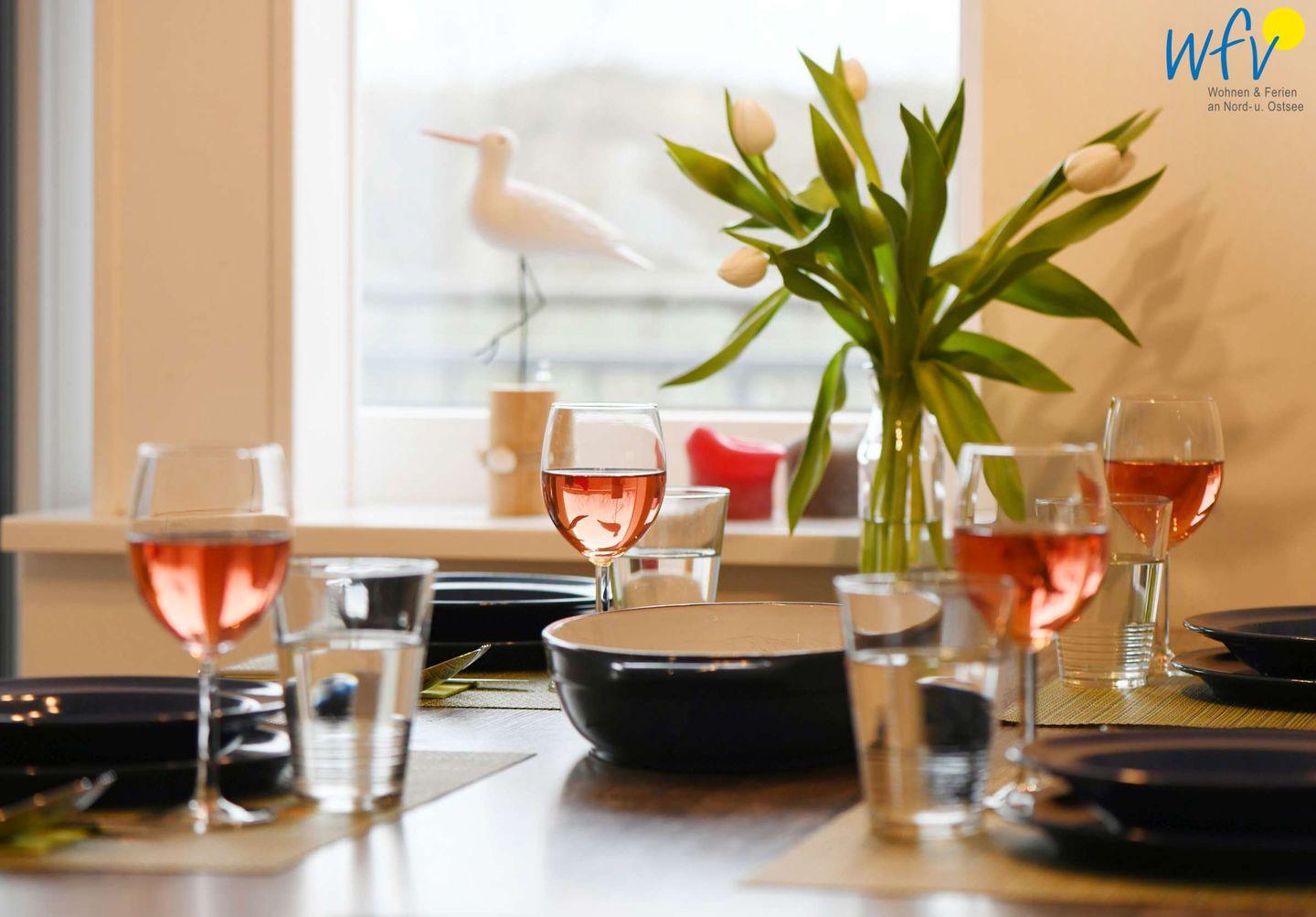 Eine moderne Einrichtung in harmonischen Farben vermittelt auf Anhieb eine Wohlfühlatmosphäre. Maritime Accessoires sorgen für die entsprechende Nordseenote in Ihrem Urlaub am Meer. Nach der Fahrradtour oder dem Strandtag lädt der offene Wohnraum mit einem großen Esstisch sowie einer Couchecke mit TV, Radio, DVD-Player und CD-Player zu entspannten Stunden ein. An kühleren Tagen wird es am Kaminofen sehr behaglich.