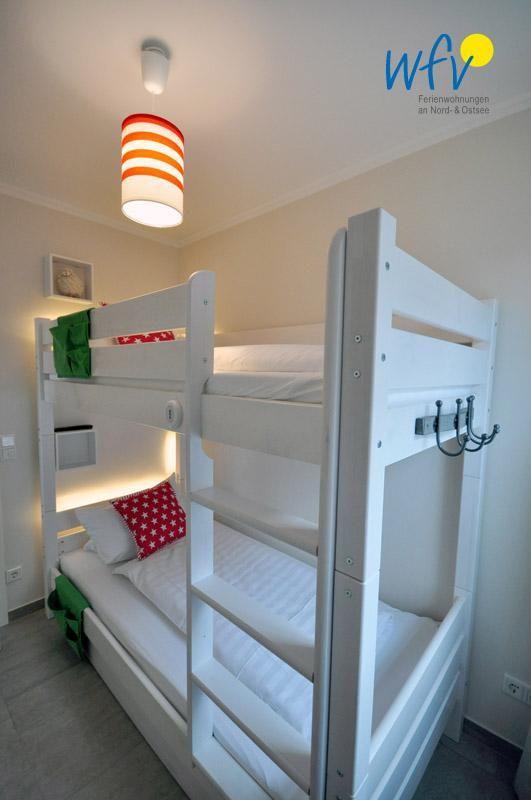 Wenn es auf der Insel Zeit zum Schlafen wird, warten zwei gemütliche separate Schlafzimmer auf Sie. Das Elternschlafzimmer ist mit einem Doppelbett (2,00 m x 1.80 m) ausgestattet, das Kinderzimmer mit einem Etagenbett (2,00 m x 0,90 m). In beiden Zimmern hängt ein TV.