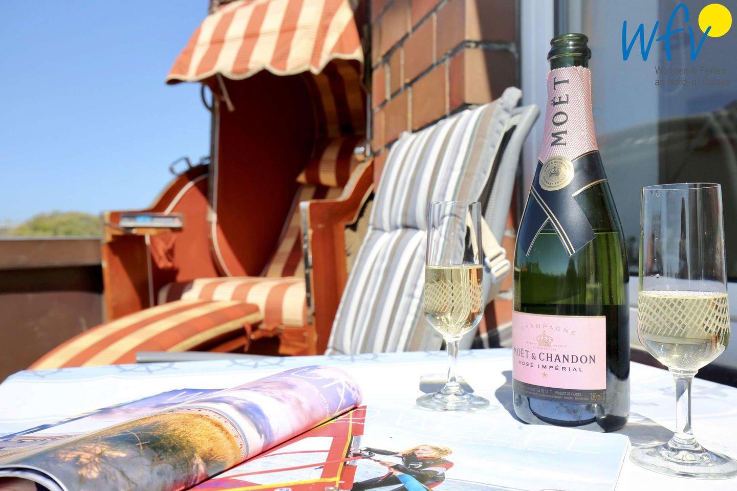 Genießen Sie herrlich sonnige Sonnenstunden auf dem Balkon der Ferienwohnung auf Wangerooge! Gemütlich ein gutes Buch lesen, entspannt die Seele baumeln lassen oder einfach nur die würzige Nordseeluft schnuppern - das ist pure Erholung. Besonders in dem gemütlichen Strandkorb auf der Balkon-Terrasse!