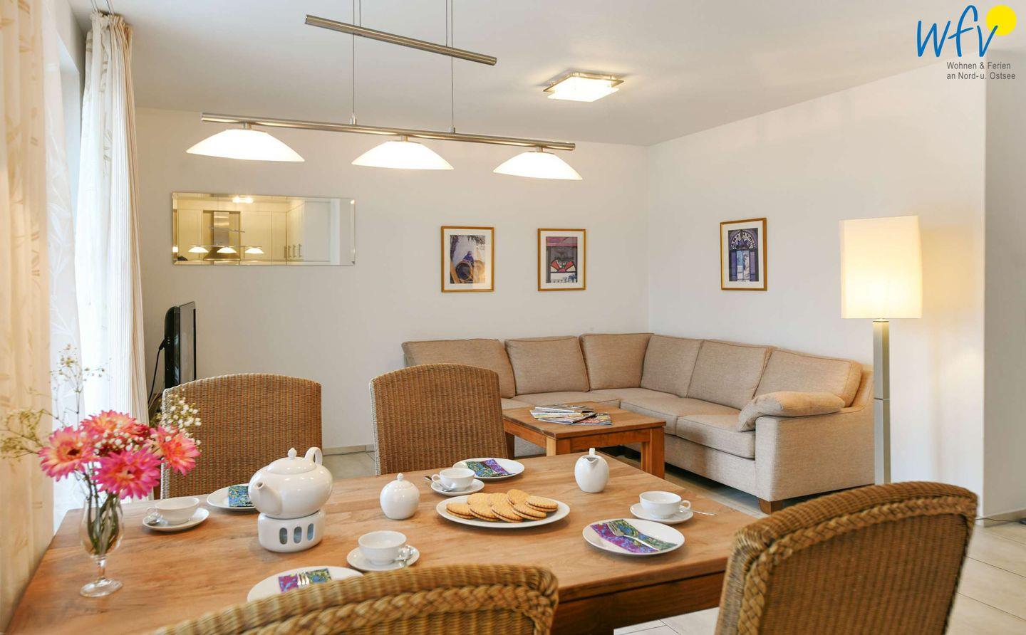 Die gemütliche Couchecke im Wohnbereich lädt zur gemeinsamen Auszeit ein – ebenso wie der große Esstisch. Eine moderne und stilvolle Möblierung, eine gute technische Ausstattung mit TV, Radio, DVD-und CD-Player sowie kostenloses WLAN bieten Ihnen Wohnkomfort auf hohem Niveau.