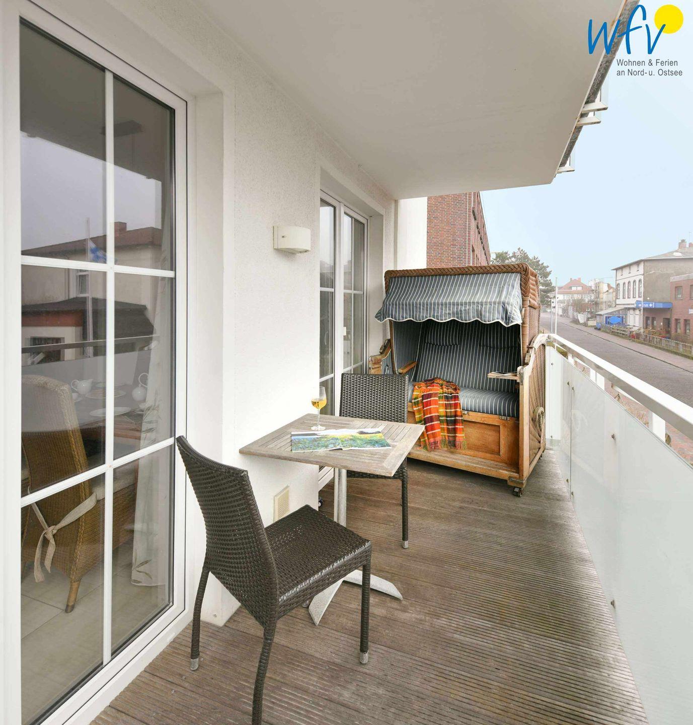 Sich in der eigenen Sauna nach einem ausgiebigen Strandspaziergang zu entspannen, lässt ein herrliches Urlaubsgefühl aufkommen! Oder Sie genießen ein Sonnenbad auf dem Balkon! Hübsche Holzmöbel sowie ein Sonnenschirm und ein bequemer Strandkorb machen den Balkon der Ferienwohnung zu einer absoluten Relax-Oase.