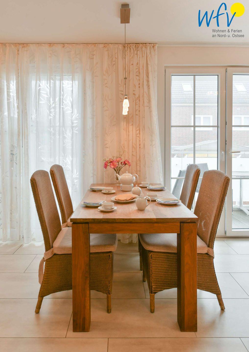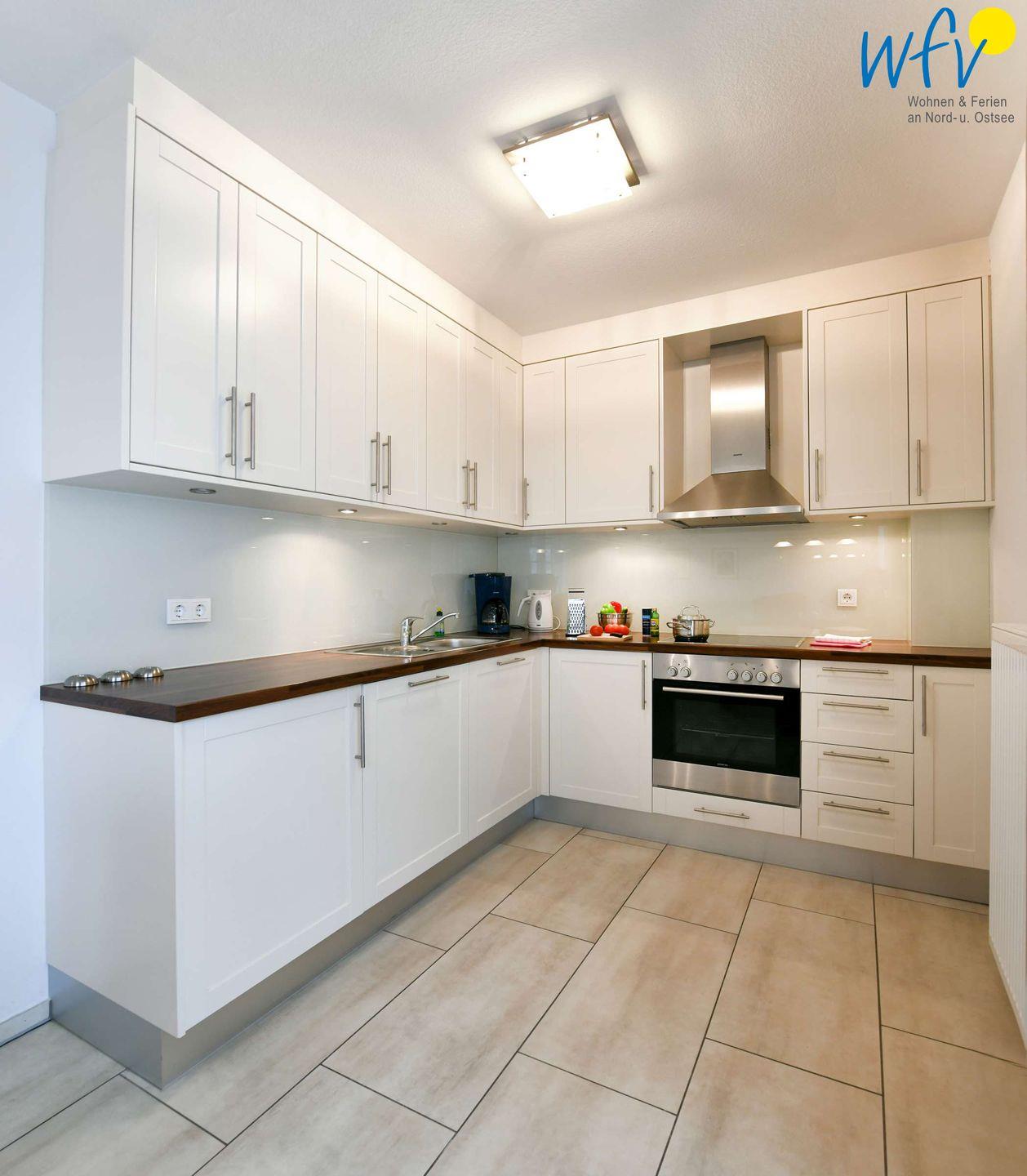 Wir garantieren Ihnen eine bequeme Selbstverpflegung in Ihrem Wangerooge-Urlaub! Die komfortable Einbauküche verfügt u.a. über einen Backofen mit Ceranfeld, eine Mikrowelle und eine Spülmaschine. Diverse Kleingeräte wie Toaster, Wasserkocher und Kaffeemaschine sind selbstverständlich ebenfalls vorhanden.