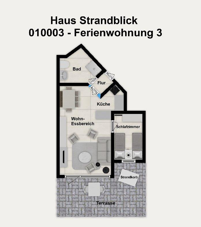 Die Ferienwohnung verfügt über einen Wohnraum mit integrierter Küche, ein separates Schlafzimmer und ein Bad. Herrlich entspannen können Sie besonders in dem lichtdurchfluteten Wohnzimmer mit Couchecke, TV und zusätzlichem Essbereich.