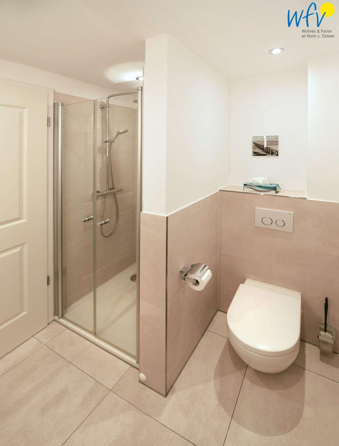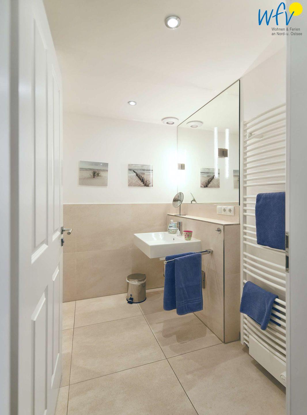 Hohen Wohnkomfort bietet Ihnen auch das moderne Bad mit großer begehbarer Dusche mit Brause und Regenschauerarmatur sowie WC, Waschbecken, großem Spiegel, Handtuchheizkörper und Fußbodenheizung.