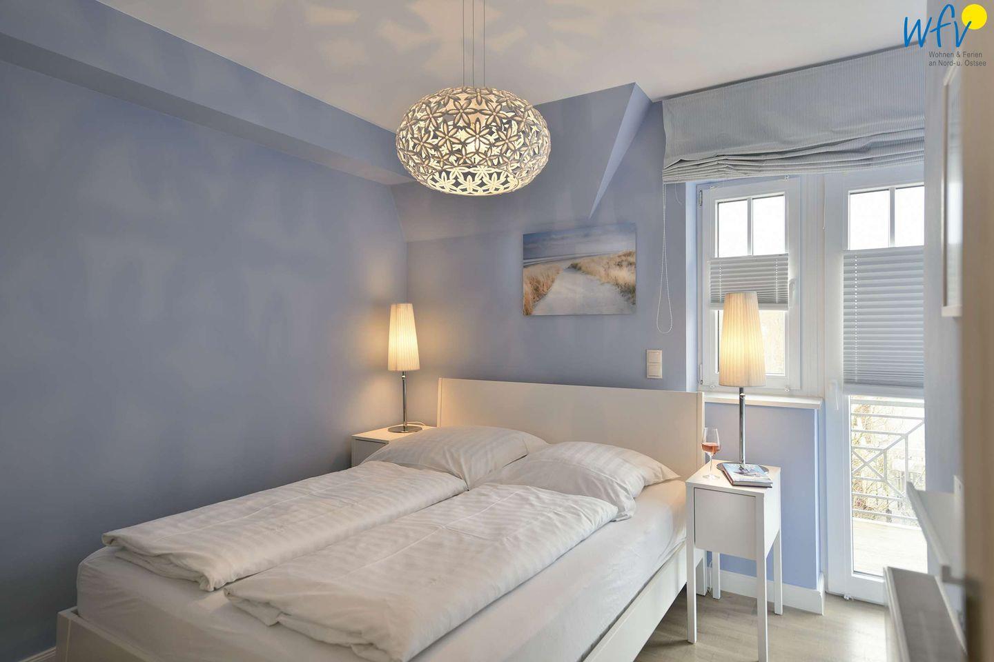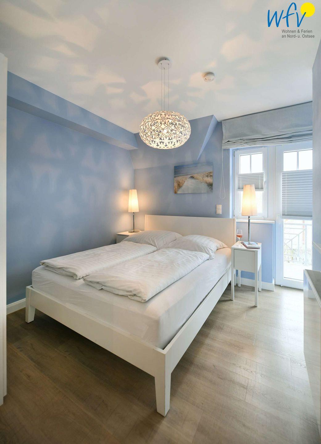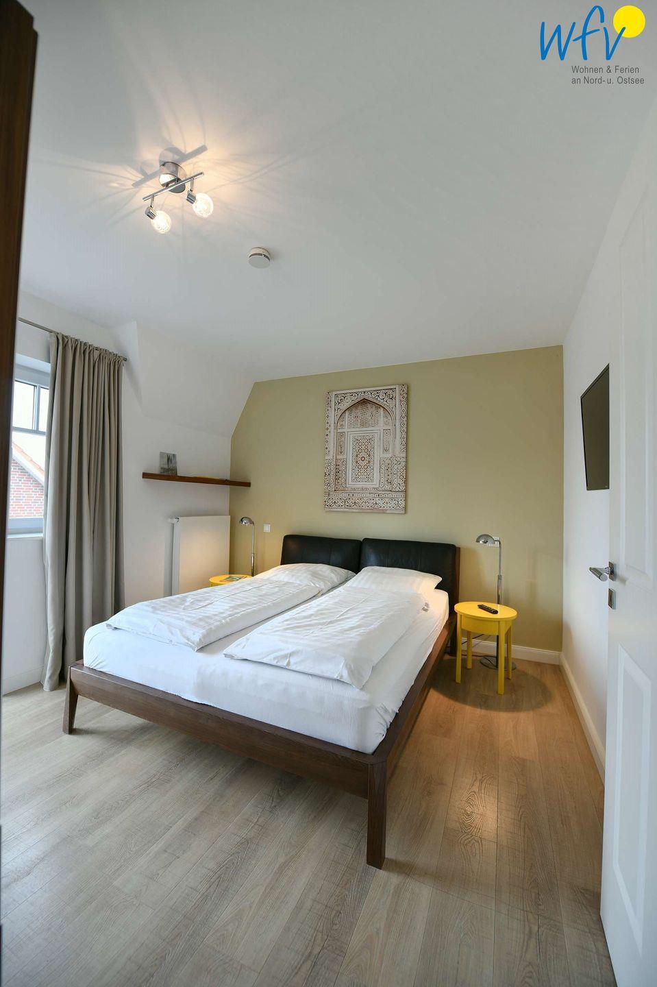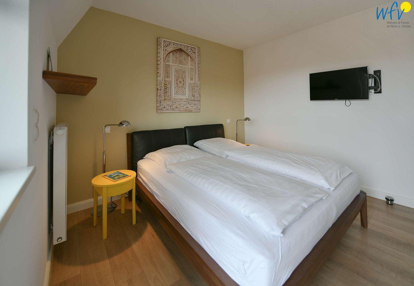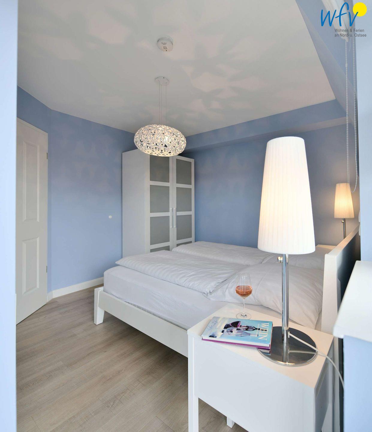 Auf der unteren Ebene der Ferienwohnung befinden sich die zwei separaten Schlafzimmer. Beide sind jeweils mit einem hochwertigen Doppelbett (160 x 200 cm + 140 x 200 cm) mit komfortablen Taschenfederkernmatratzen eingerichtet. Durch einen modernen LED-Fernseher kann auch von hier aus ferngesehen werden. Ihre Urlaubsgarderobe findet Platz im Kleiderschrank. Von beiden Schlafzimmern aus haben Sie Zugang zum Balkon.