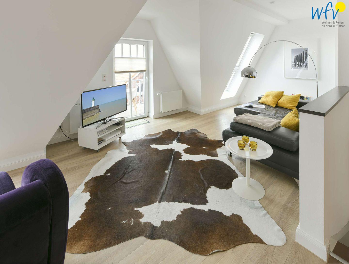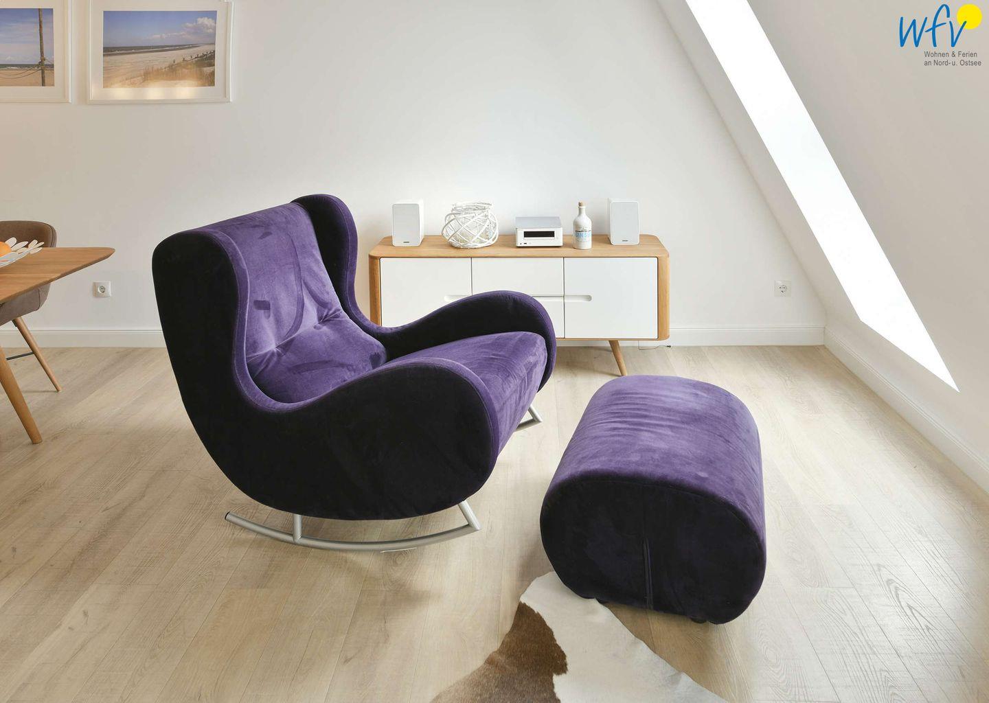 Herrlich entspannen können Sie auf der zweiten Ebene in dem großzügigen und lichtdurchfluteten Wohnraum mit Couchecke, integrierter Küche und Zugang zum zweiten Balkon. Fernsehen, Musik hören, ein gutes Buch lesen, Gesellschaftsspiele spielen oder vom Smartphone aus surfen geht hier ganz wunderbar! Es gibt einen 40 Zoll Samsung LED TV (Satelliten-/Kabel-TV), einen DVD-Player mit kleiner DVD-Sammlung, eine Stereoanlage, diverse Brettspiele und ein paar ausgewählte Bücher. Zudem empfangen Sie freies WLAN. Besonders toll ist der große Relaxsessel mit Blick auf den Leuchtturm!