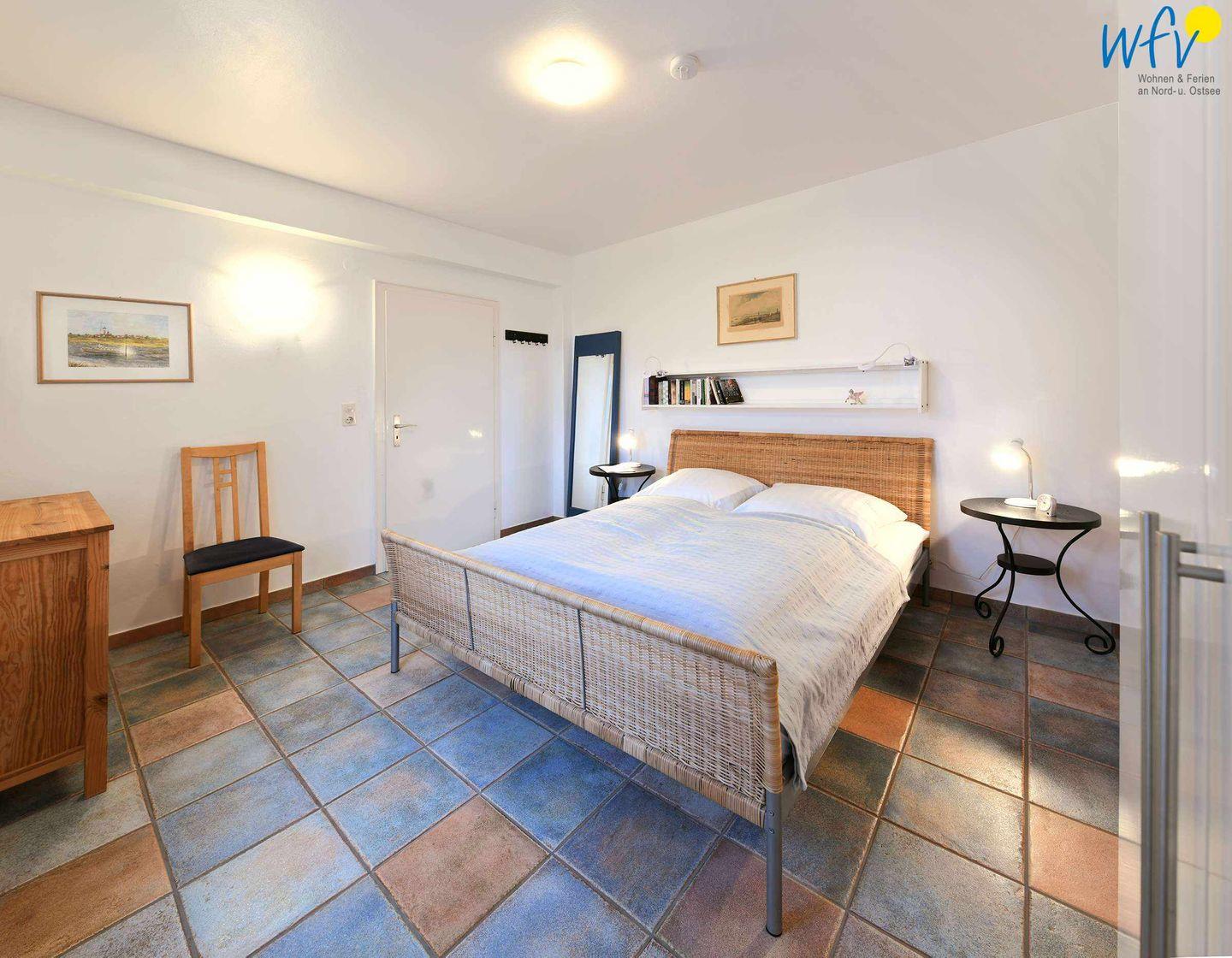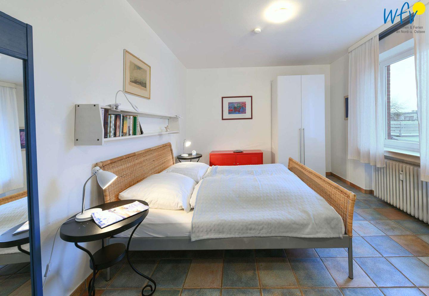 Das Schlafzimmer der Ferienwohnung auf Wangerooge ist mit einem bequemen Doppelbett ausgestattet.