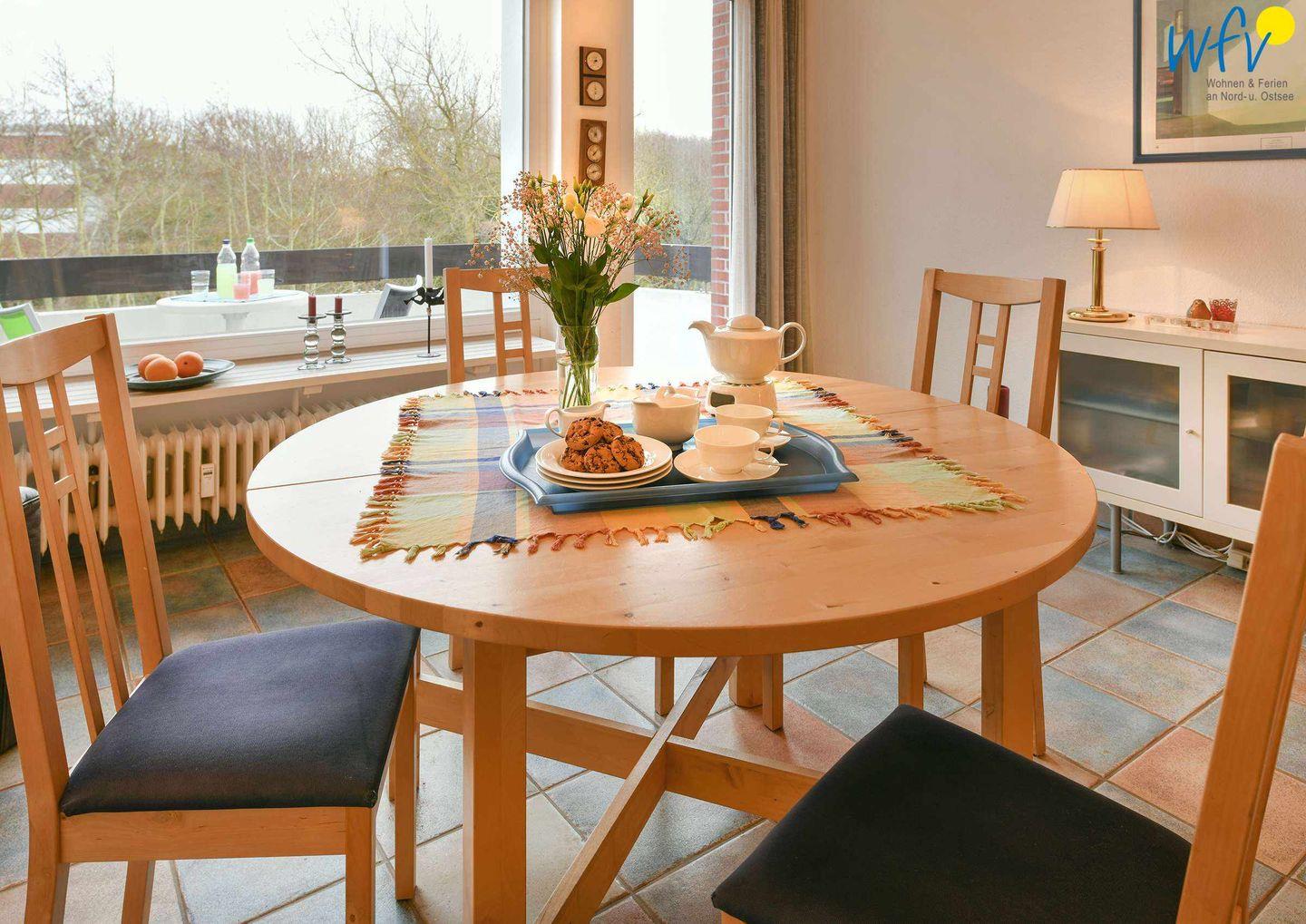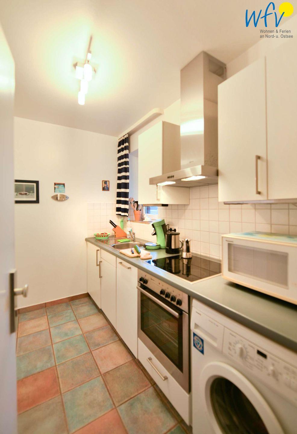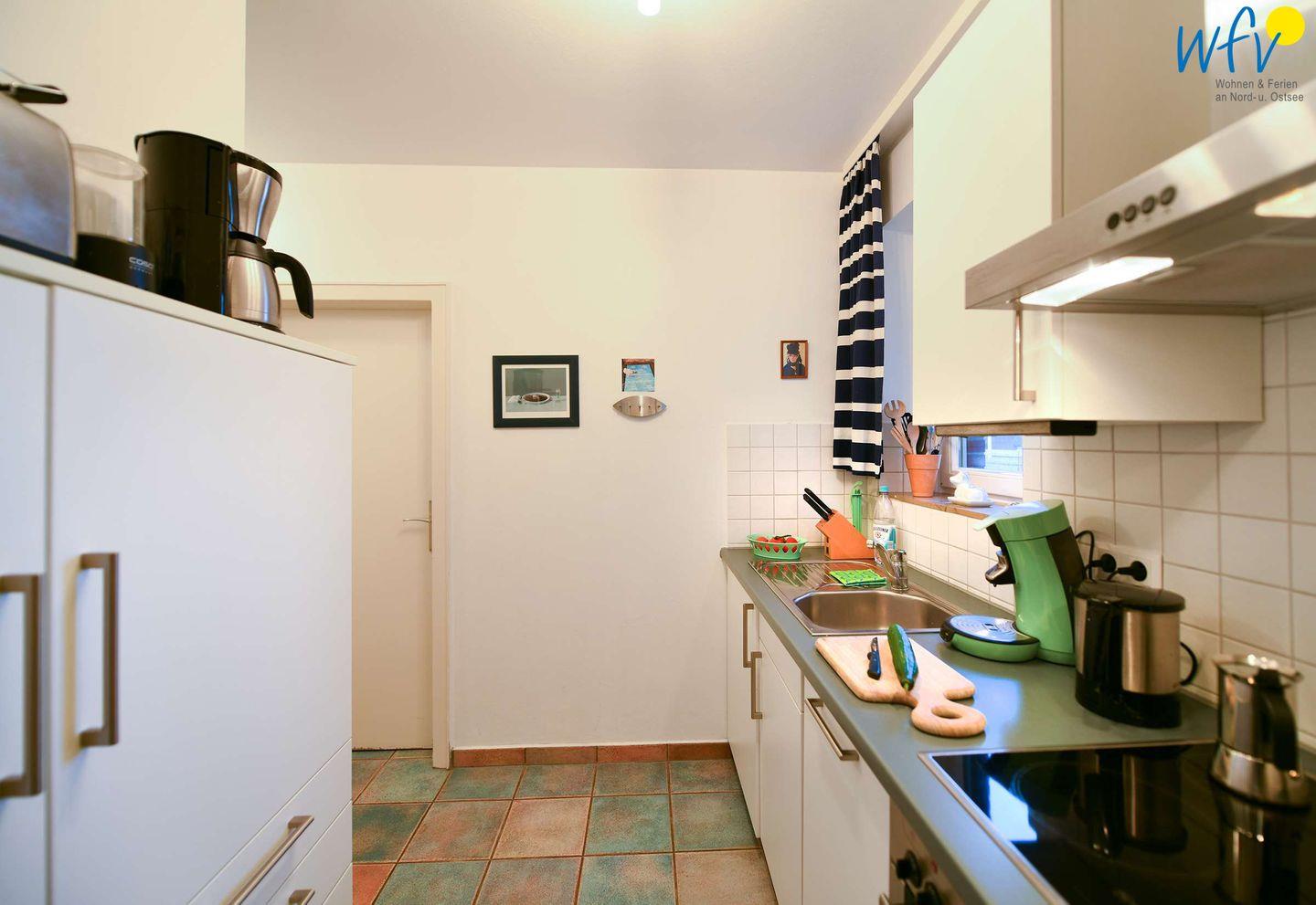 Für eine angenehme Selbstverpflegung in Ihrem Wangerooge-Urlaub verfügt die moderne separate Küche über einen 4-Plattenherd, einen Backofen, einen Kühlschrank, einen Geschirrspüler und eine Mikrowelle.
