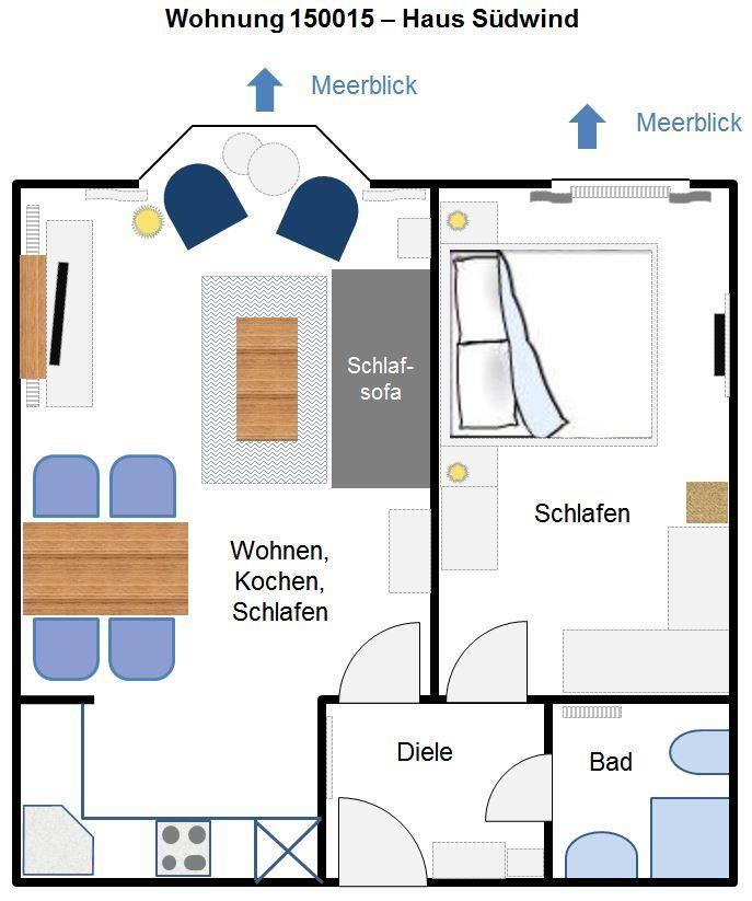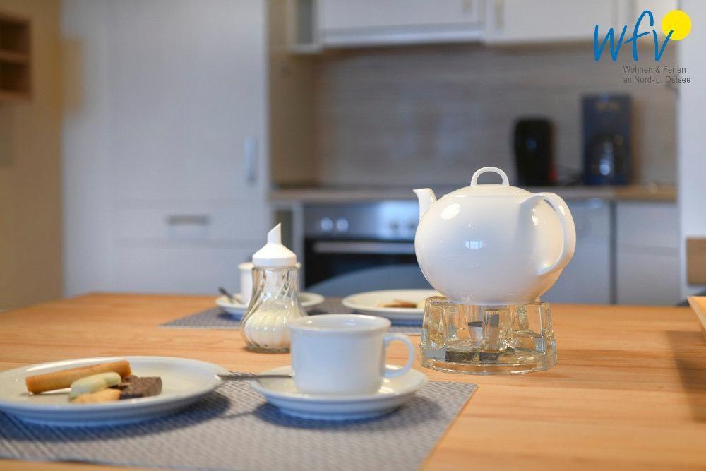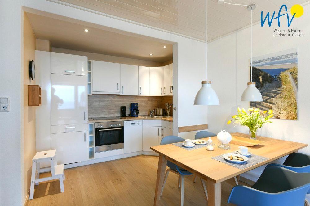 Die im Wohnraum integrierte Küchenzeile ist geräumig und sehr gut ausgestattet. So macht es im Urlaub richtig Spaß, gemeinsam zu kochen! Mit Herd, Backofen und Mikrowelle lassen sich leckere Gerichte zaubern, den Abwasch erledigt die Spülmaschine. Das Essen gibt`s bei uns inklusive Meerblick: vom Esstisch aus genießen Sie eine herrliche Aussicht auf die Nordsee!