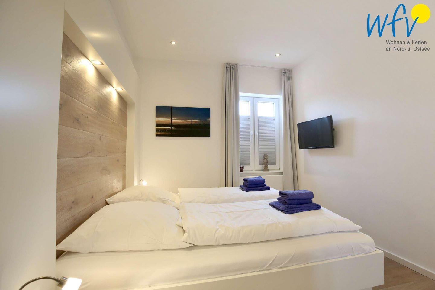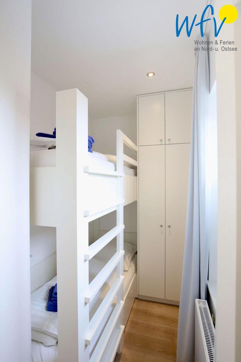 Das Schlafzimmer der Ferienwohnung ist mit einem Doppelbett und einem Flat-TV ausgestattet. Im Kinderzimmer befindet sich ein Etagenbett.