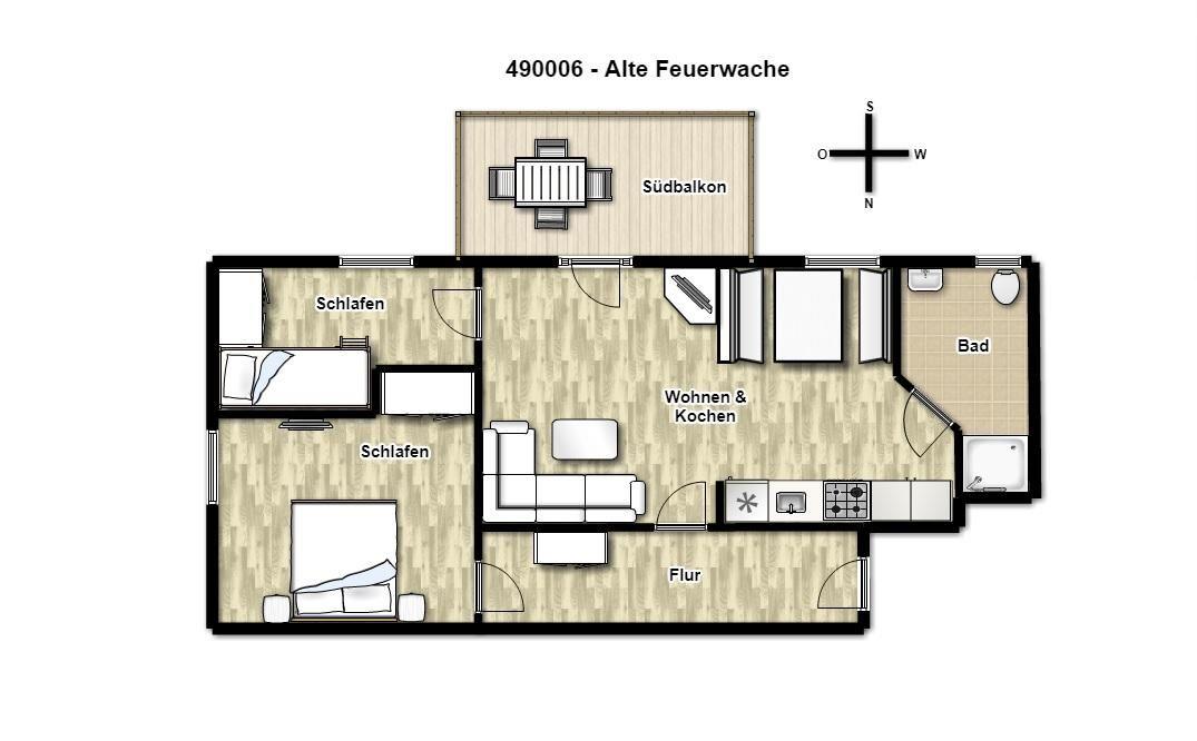 Helle Räume und eine moderne, hochwertige Ausstattung erwarten Sie in unserer Ferienwohnung in der "Alten Feuerwache"! Zwei separate Schlafzimmer, eine voll ausgestattete Küche, ein großer Wohnraum, ein Badezimmer und ein Südbalkon bieten viel Platz und angenehme Aufteilungsmöglichkeiten für bis zu vier Personen.