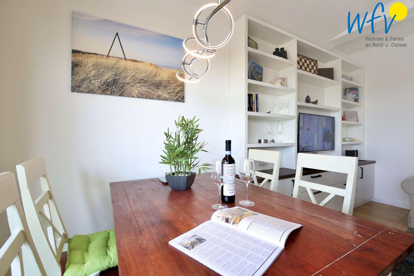 Der Wohnraum ist unter anderem mit einer Couch und einem Sessel ausgestattet und lädt zu gemütlichen Filmabenden ein! Hierfür stehen Ihnen ein modernes TV mit Amazon Fire Stick, eine Bose Musikbox, eine PlayStation 4 mit diversen Spielen sowie ein DVD-Player und ein Blu-ray-Player zur Verfügung. Für die weitere Abendunterhaltung ist mit einer Reihe von Gesellschaftsspielen (Poker, Backgammon, Schach, Activity, Looping Louie und vieles mehr) gesorgt. Auch bei schlechterem Wetter können Sie hier also nach Herzenslust entspannen!