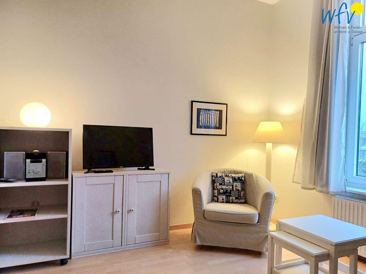 Im Wohnraum lädt ein Essbereich sowie eine Couchecke mit TV und CD-Player zu gemeinsamen Mahlzeiten, zum Filme schauen und zum Musik hören ein. Hier können Sie nach dem Strandtag oder in den Abendstunden ausgiebig entspannen.