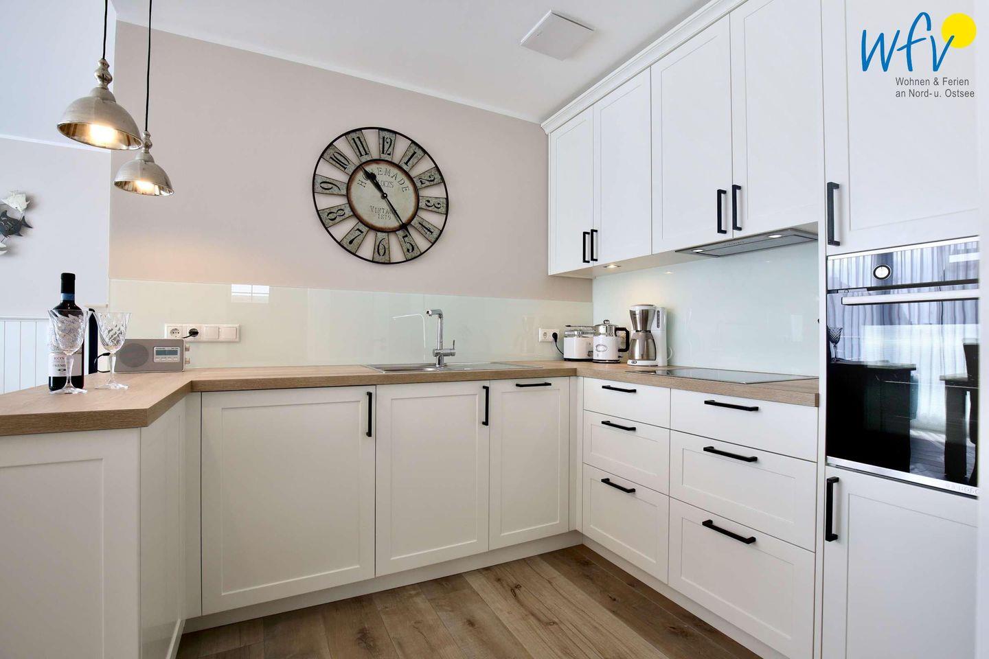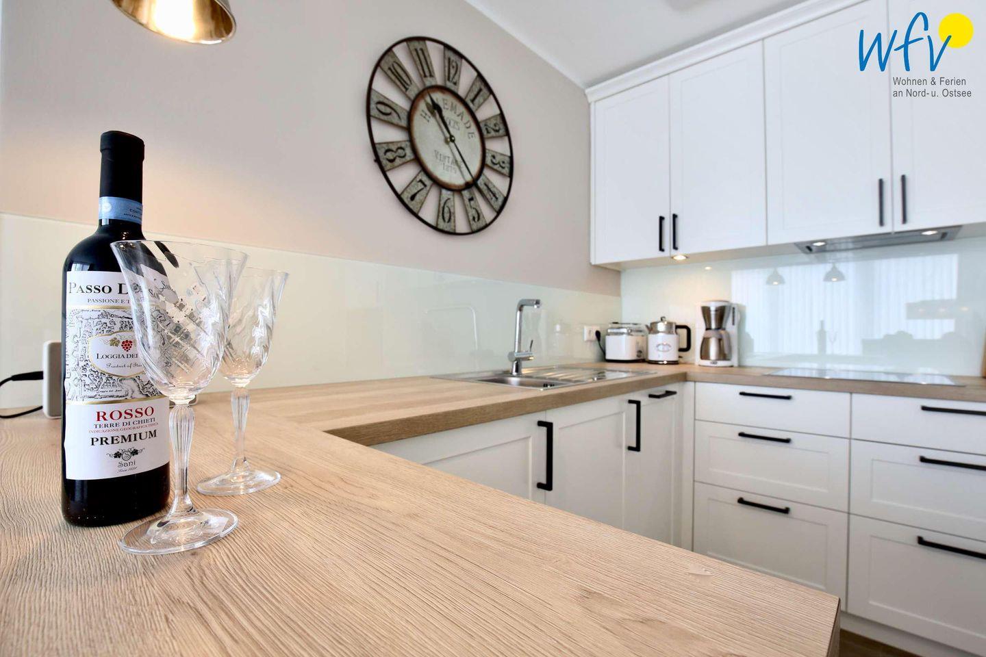 Damit Sie sich in Ihrem Wangerooge-Urlaub bequem selbst verpflegen können, verfügt die Ferienwohnung "Strandliebe" über eine gut ausgestattete Küche - u.a. mit Ceranherd, Backofen und Geschirrspüler sowie Kaffeemaschine, Wasserkocher, Toaster und Kaffee-Vollautomat (Kapseln).