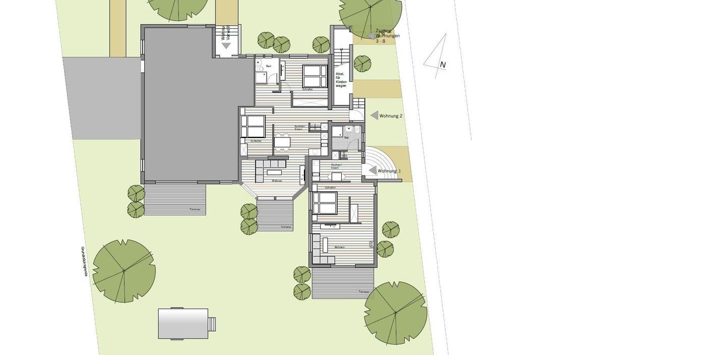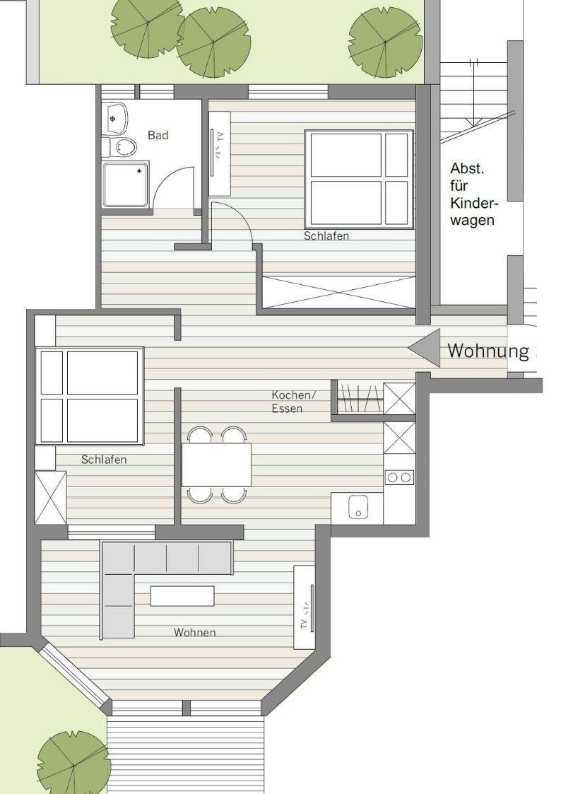 Die Wohnung 2 befindet sich im Erdgeschoss und verfügt über einen großzügigen Wohnraum, zwei separate Schlafzimmer, eine Küche, ein Duschbad und eine Terrasse.
