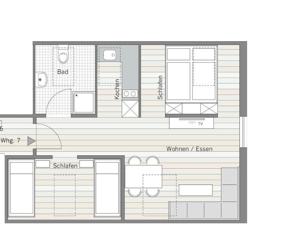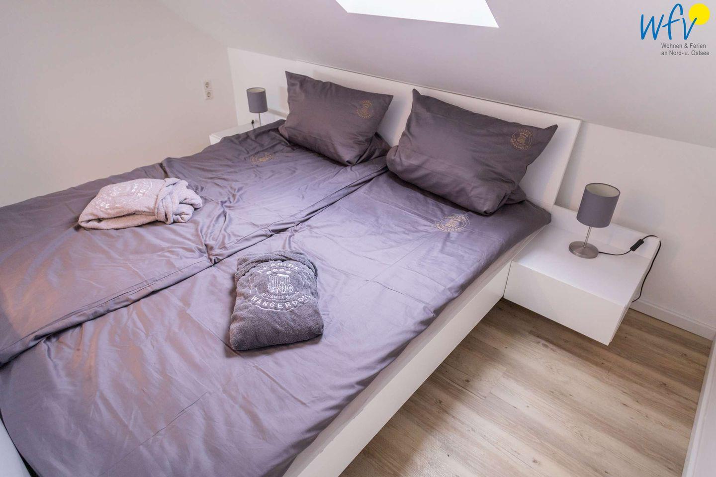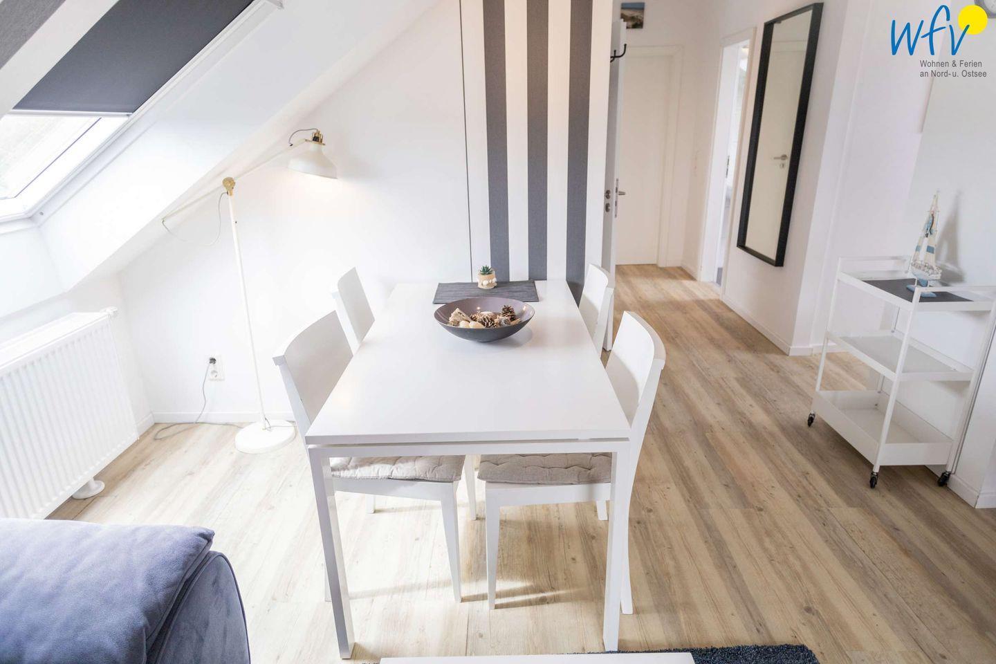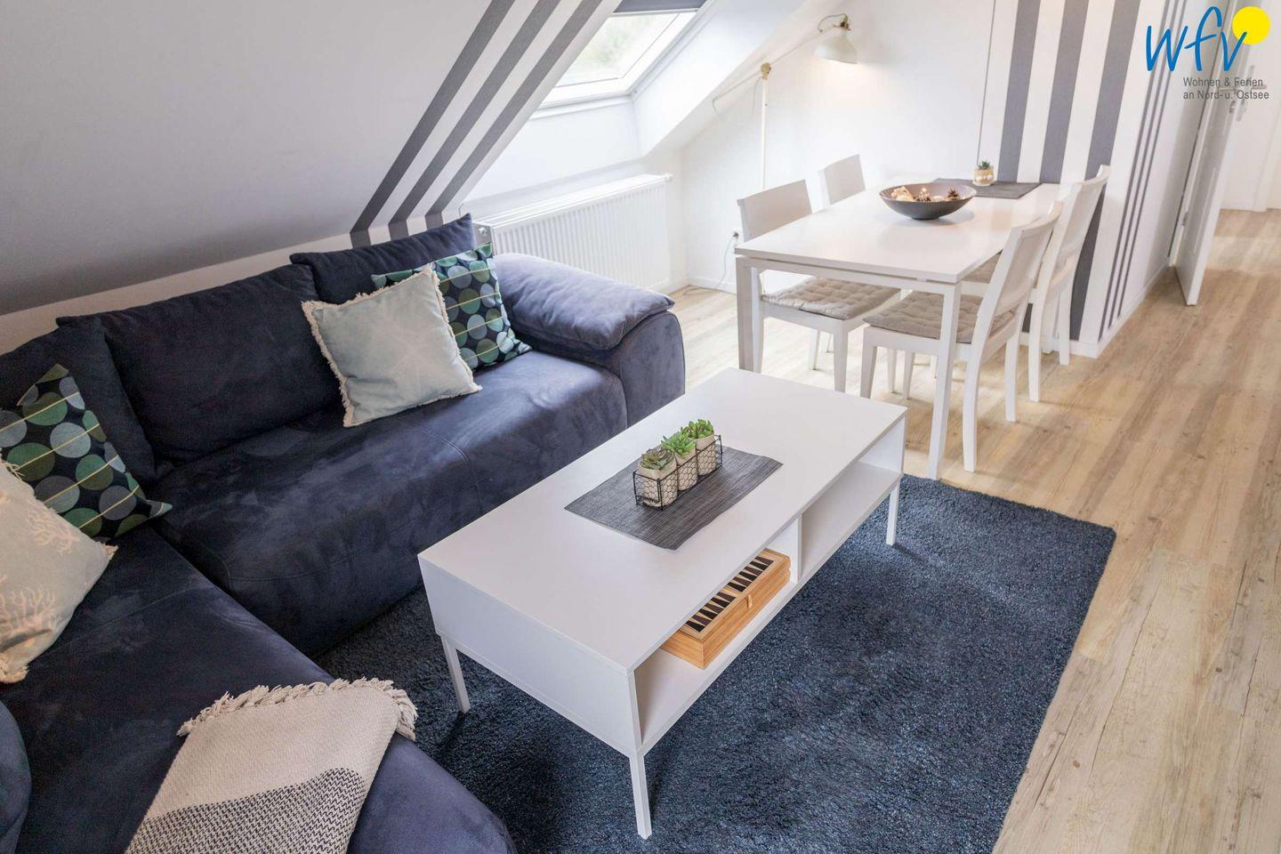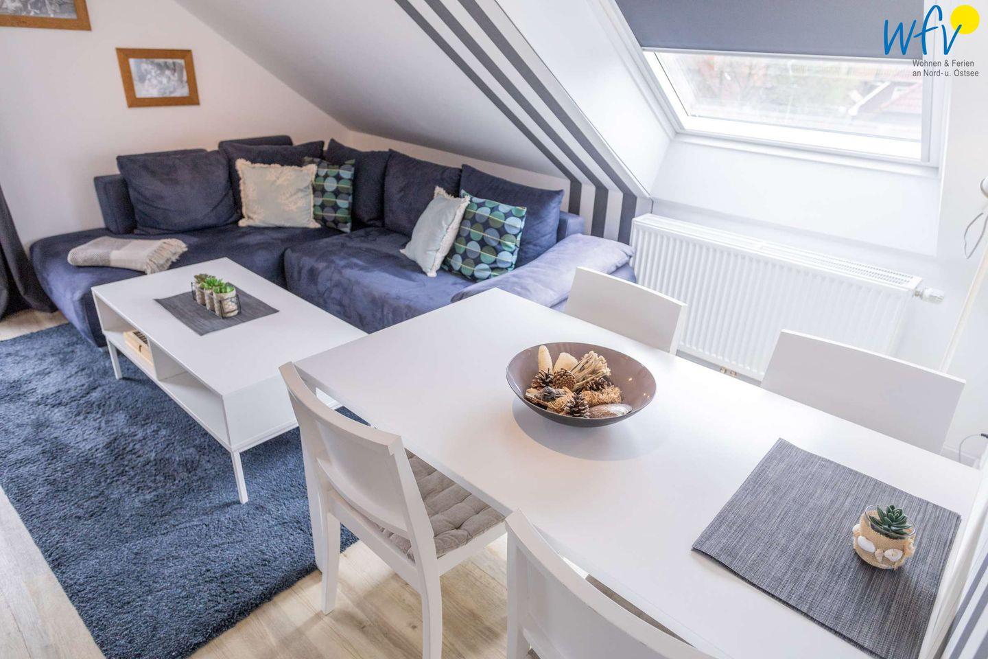 Die Wohnung 5 befindet sich im Dachgeschoss und verfügt über einen großzügigen Wohnraum mit Couchecke, Esstisch und Doppelbett sowie über ein separates Schlafzimmer, eine Küche und ein Duschbad.