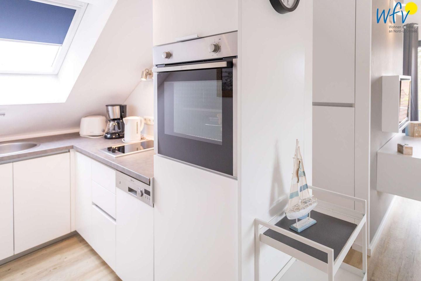Eine moderne Küche macht das Kochen zum Kinderspiel in Ihrem Urlaub! Sie verfügt u.a. über Herd, Backofen, Kühlschrank mit Gefrierfach, Mikrowelle und Geschirrspüler sowie Kaffeemaschine, Wasserkocher, Toaster und Mixer.