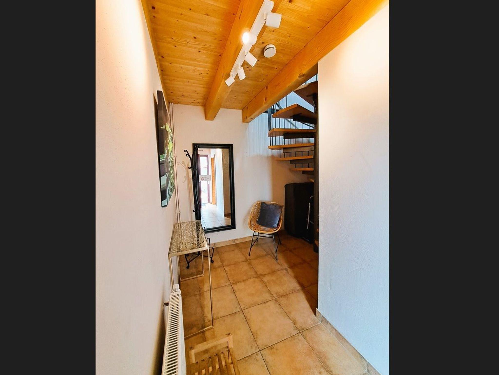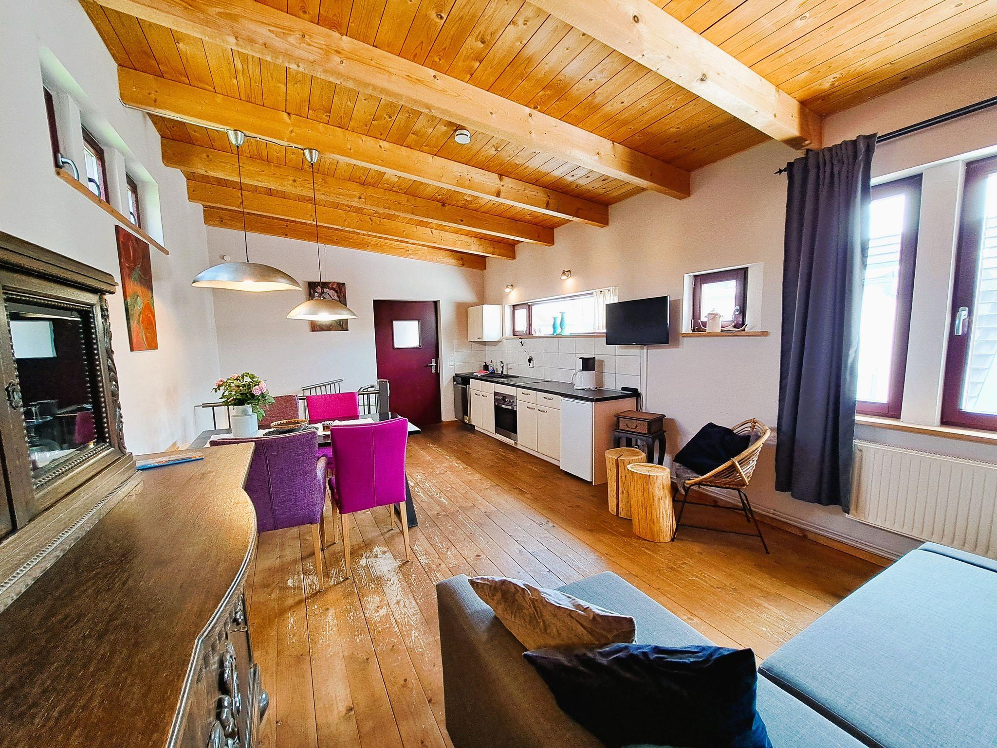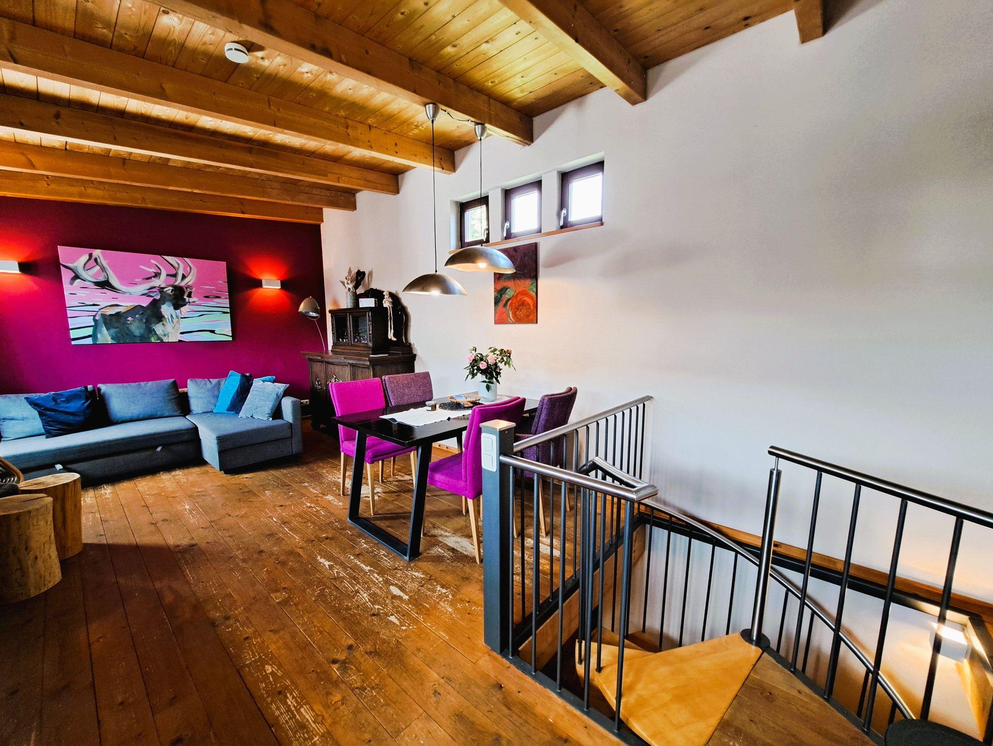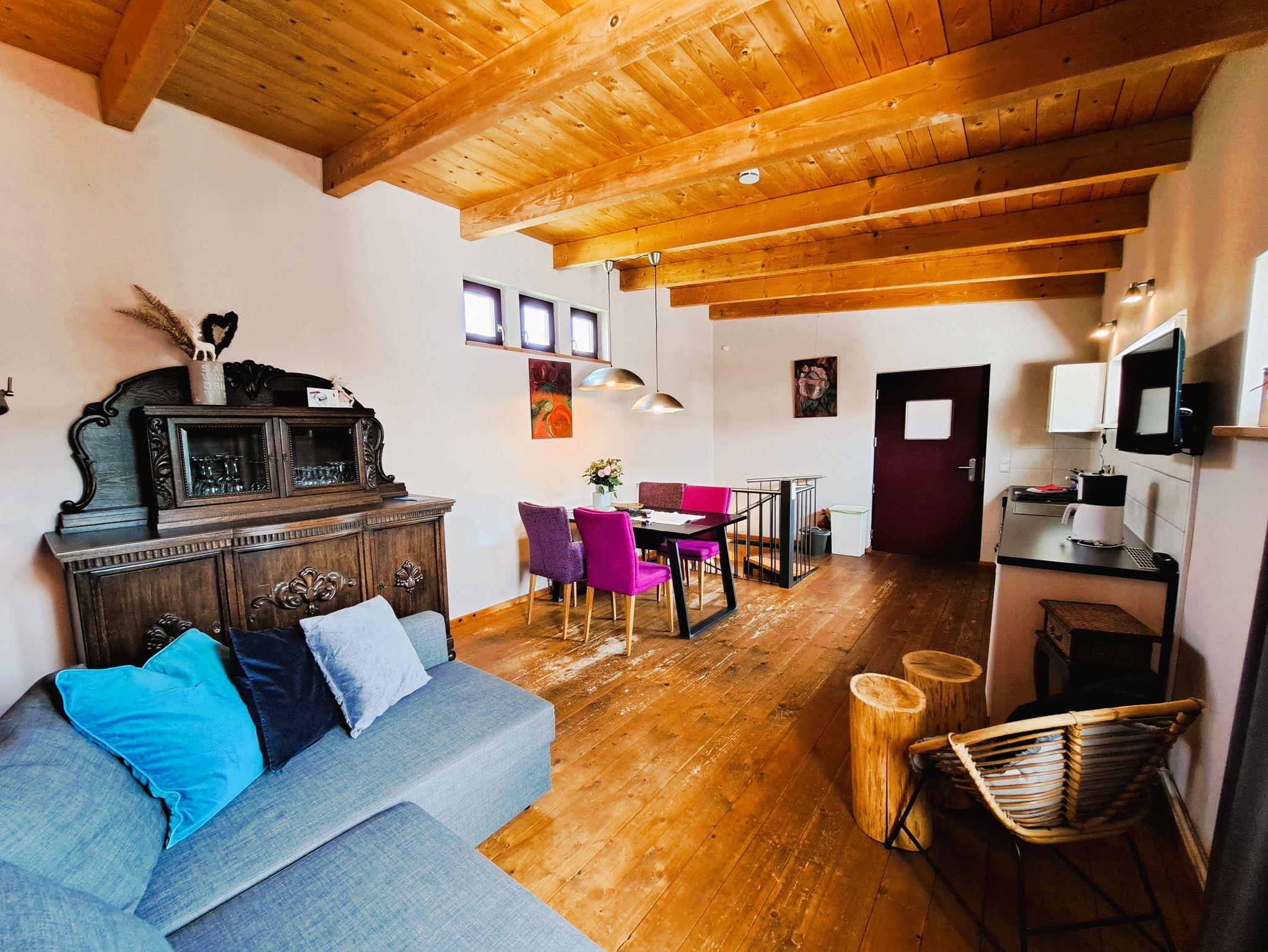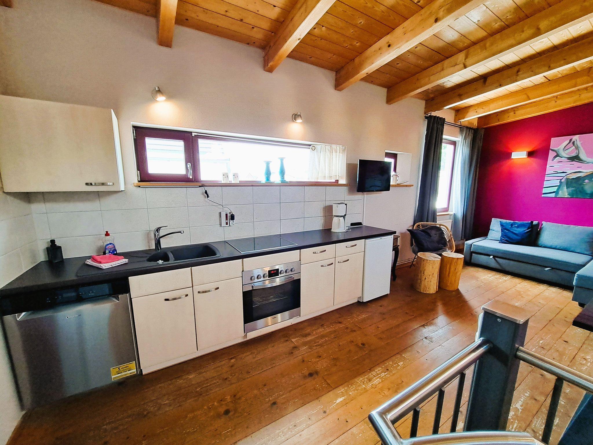 Über die Wendeltreppe gelangen Sie in das Obergeschoss, wo ein großzügiges Wohnzimmer mit offener Küche auf Sie wartet. Eine gemütliche Couchlandschaft, ein Esstisch und ein TV laden zum Verweilen und Entspannen ein. Die Küche ist mit allen wichtigen technischen Geräten ausgestattet, sodass Sie sich wie zu Hause fühlen können.