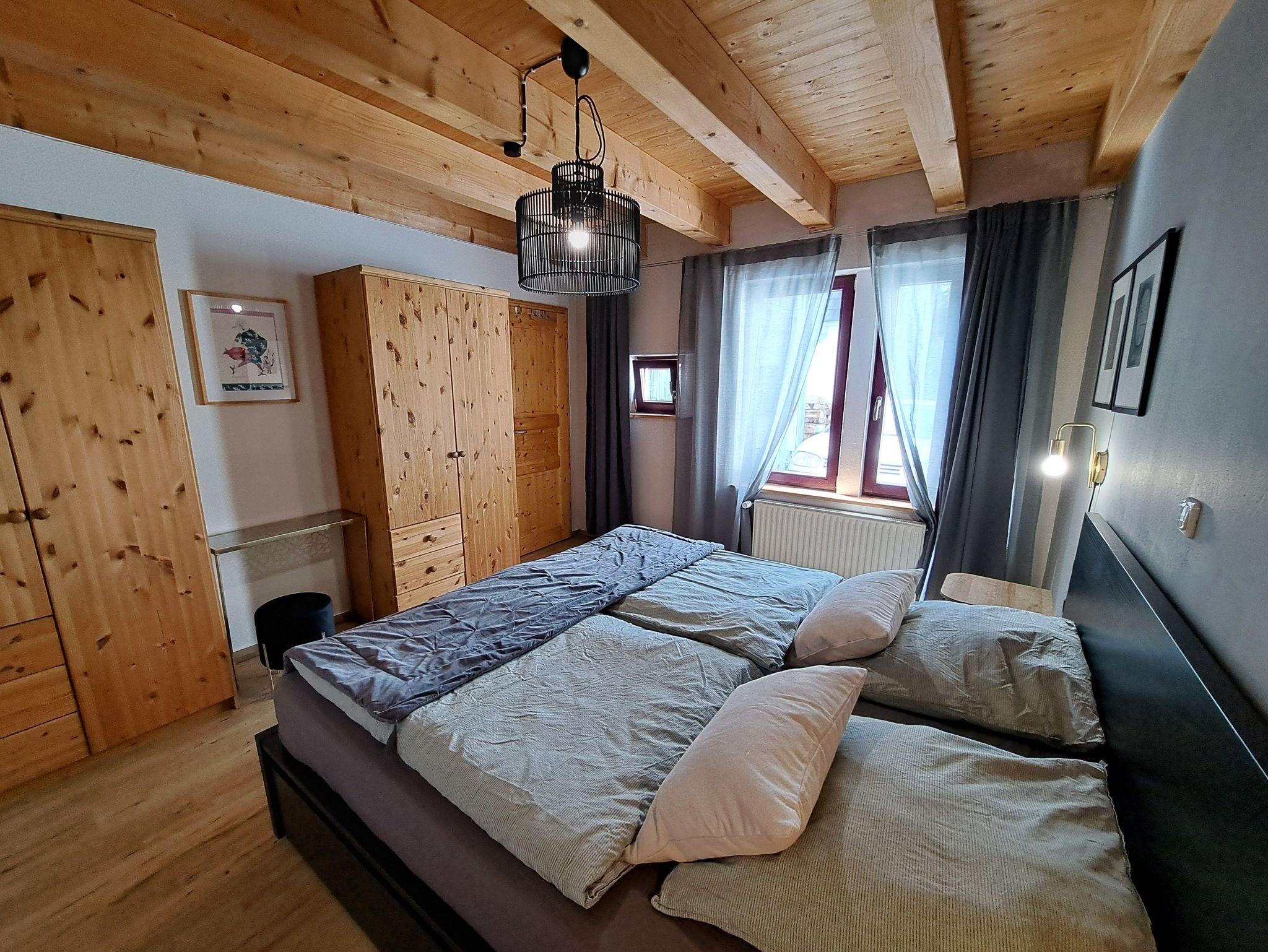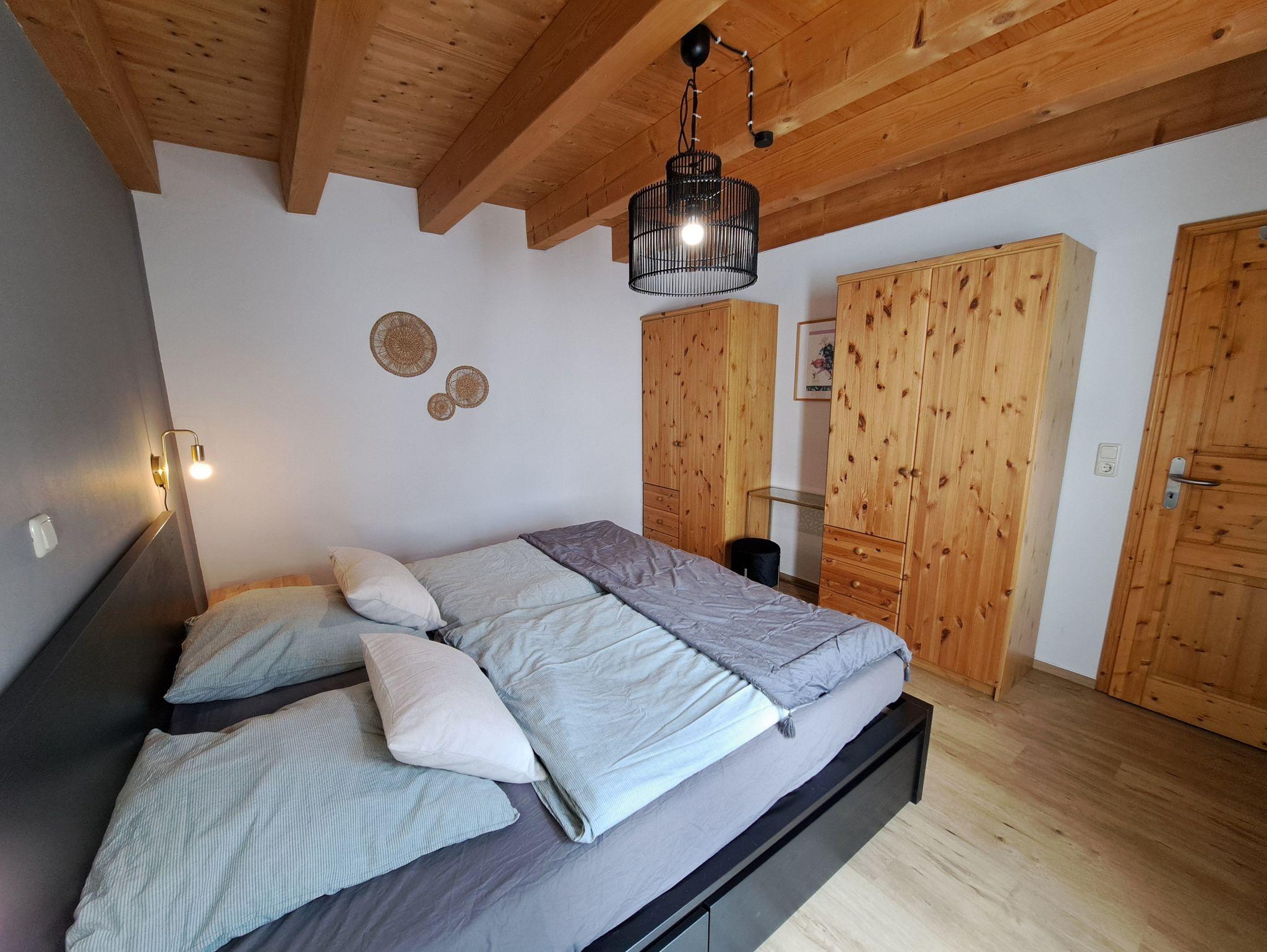 Die Ferienwohnung Träumling empfängt Sie im Erdgeschoss mit einem einladenden Flur, der mit einer Garderobe und einem Treppenaufgang zum Obergeschoss ausgestattet ist. Im Erdgeschoss befindet sich zudem ein gemütliches Schlafzimmer mit einem komfortablen Doppelbett, Nachttischen, Verdunklungsmöglichkeiten und einem geräumigen Kleiderschrank. Das helle Tageslichtbad bietet eine Dusche und ein WC.