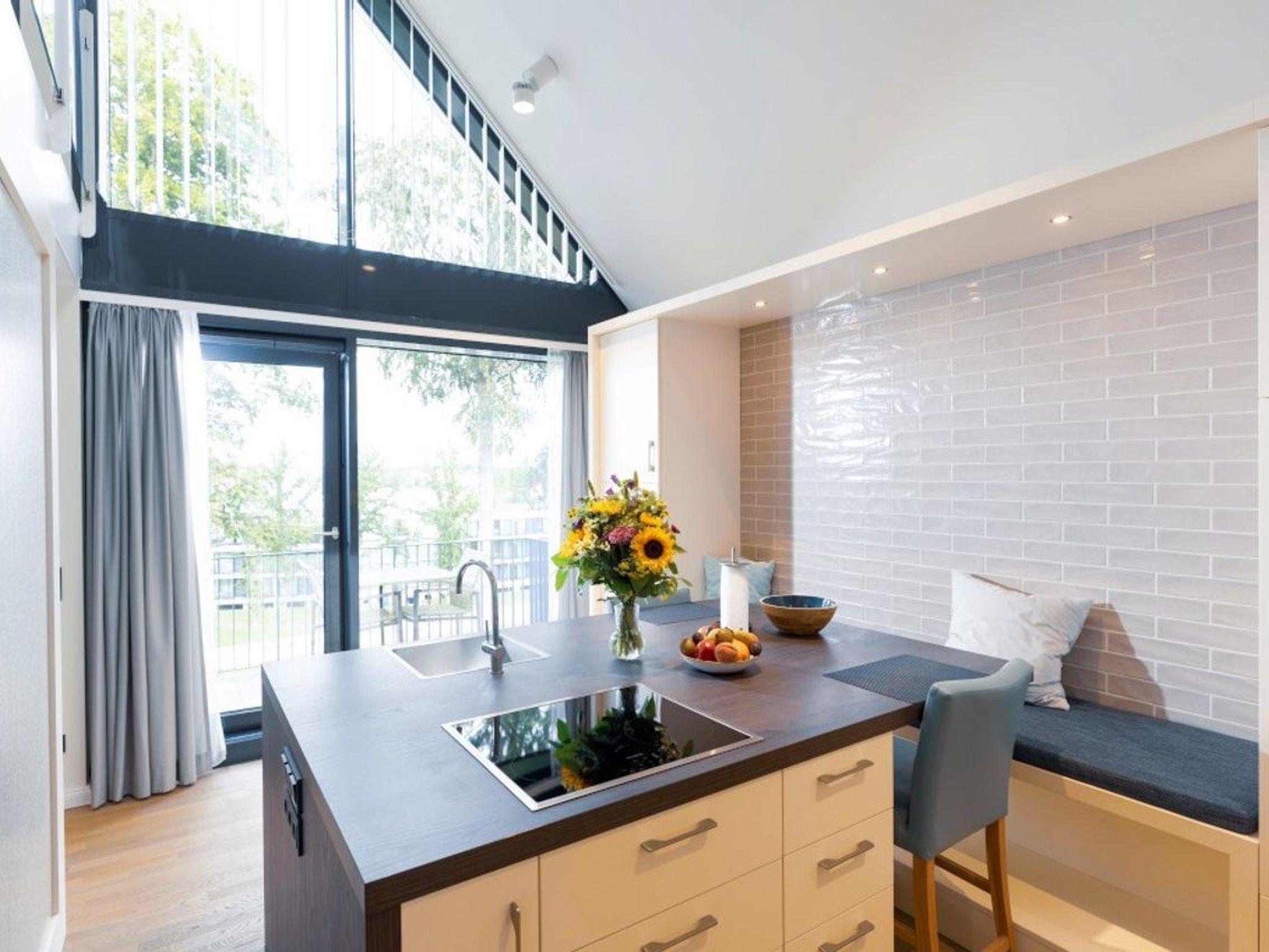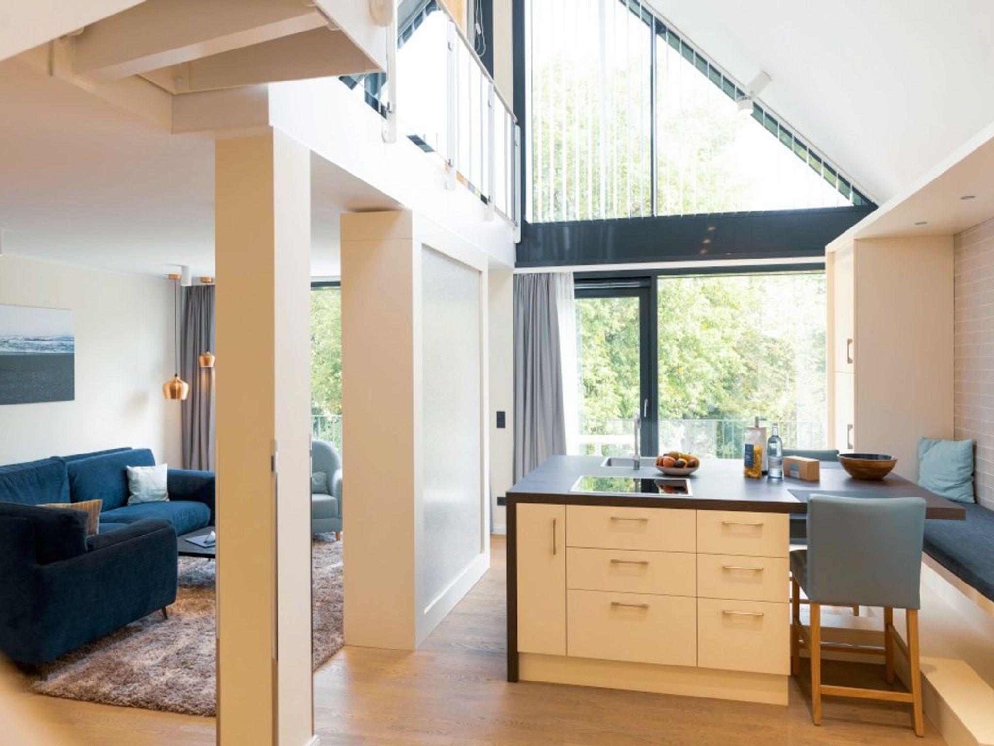Die eleganten Kompass Maisonette Suiten mit Müritzblick und einer Größe von 71 qm erwarten Sie mitten im Herzen der Mecklenburgischen Seenplatte. Dank attraktiver Lage und auf hohem Niveau stilvoll eingerichtet, bietet diese Unterkunft mit Wohn- und Essbereich, einem Schlafzimmer auf der Galerie mit Badezimmer en Suite sowie eigenem Balkon einen komfortablen Aufenthalt. Die Suite verfügt über eine Kücheninsel mit zwei Barhockern und Sitzbank sowie ein Gäste WC. Alle angebenen Preise sind AB-Preise und richten sich nach länge und Jahreszeit des Aufenthalts.