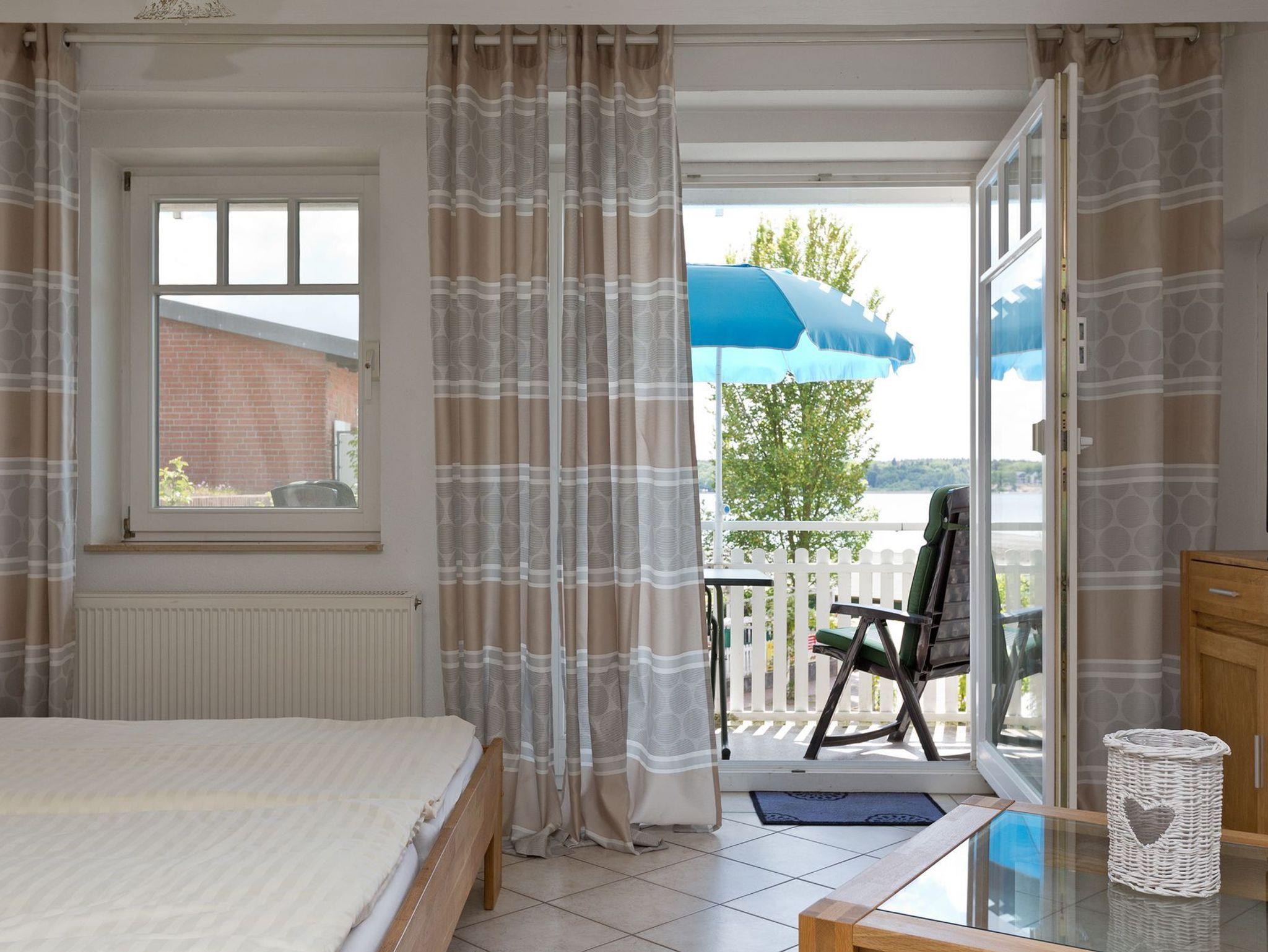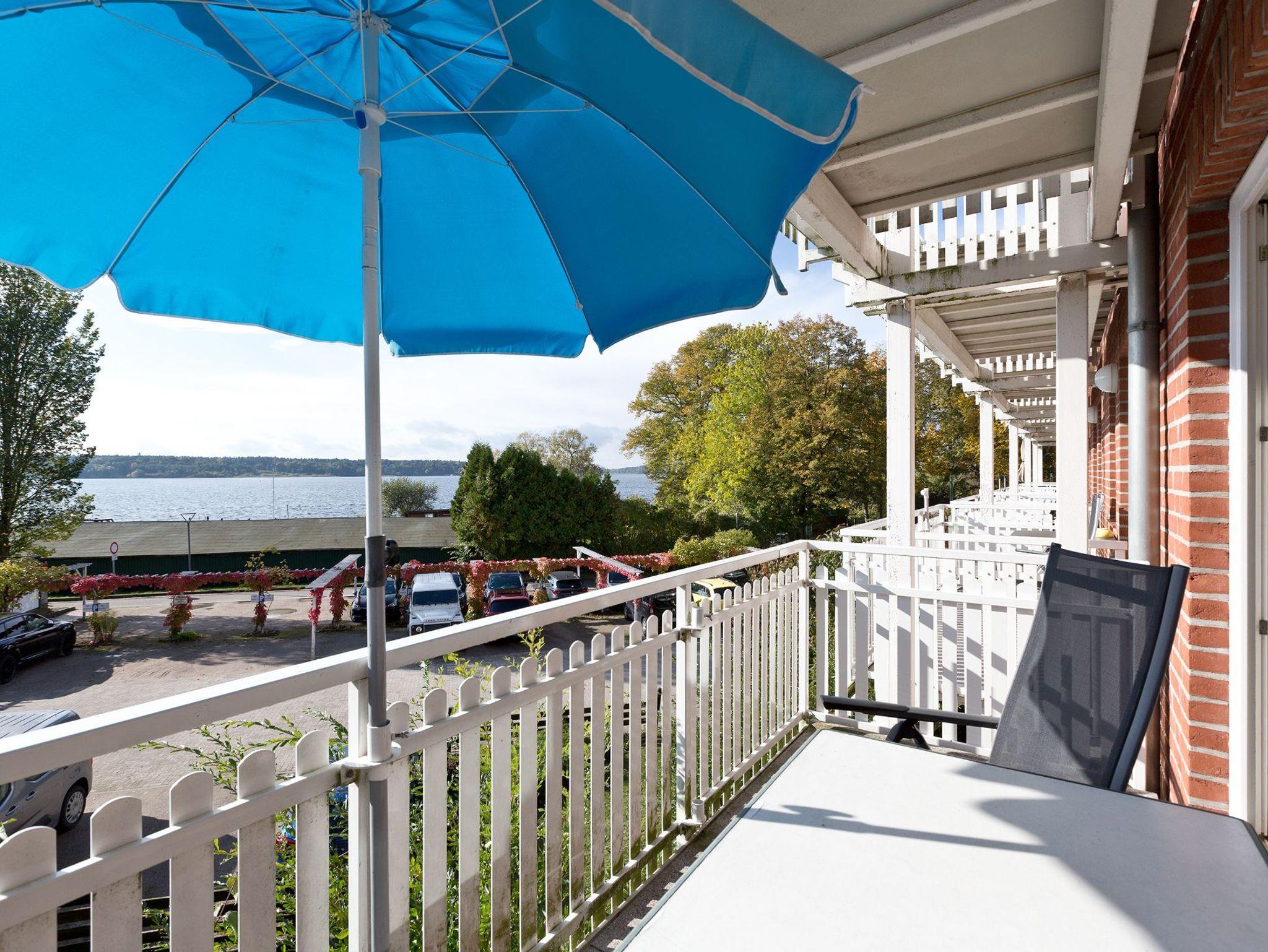 Die schöne Balkon bietet einen schönen Blick auf die Müritz und ist mit einem Sonnenschirm und Balkonmöbeln ausgestattet.