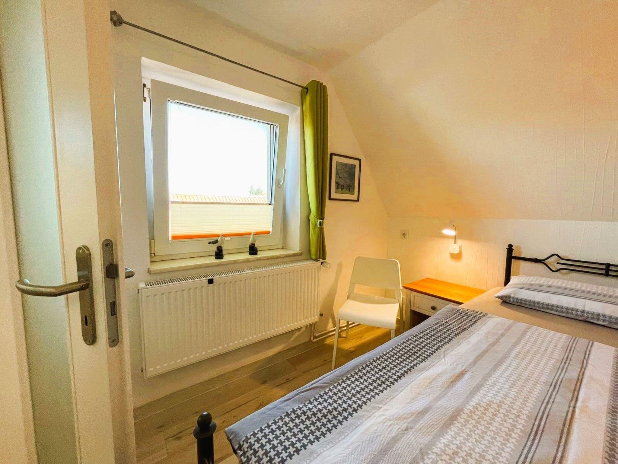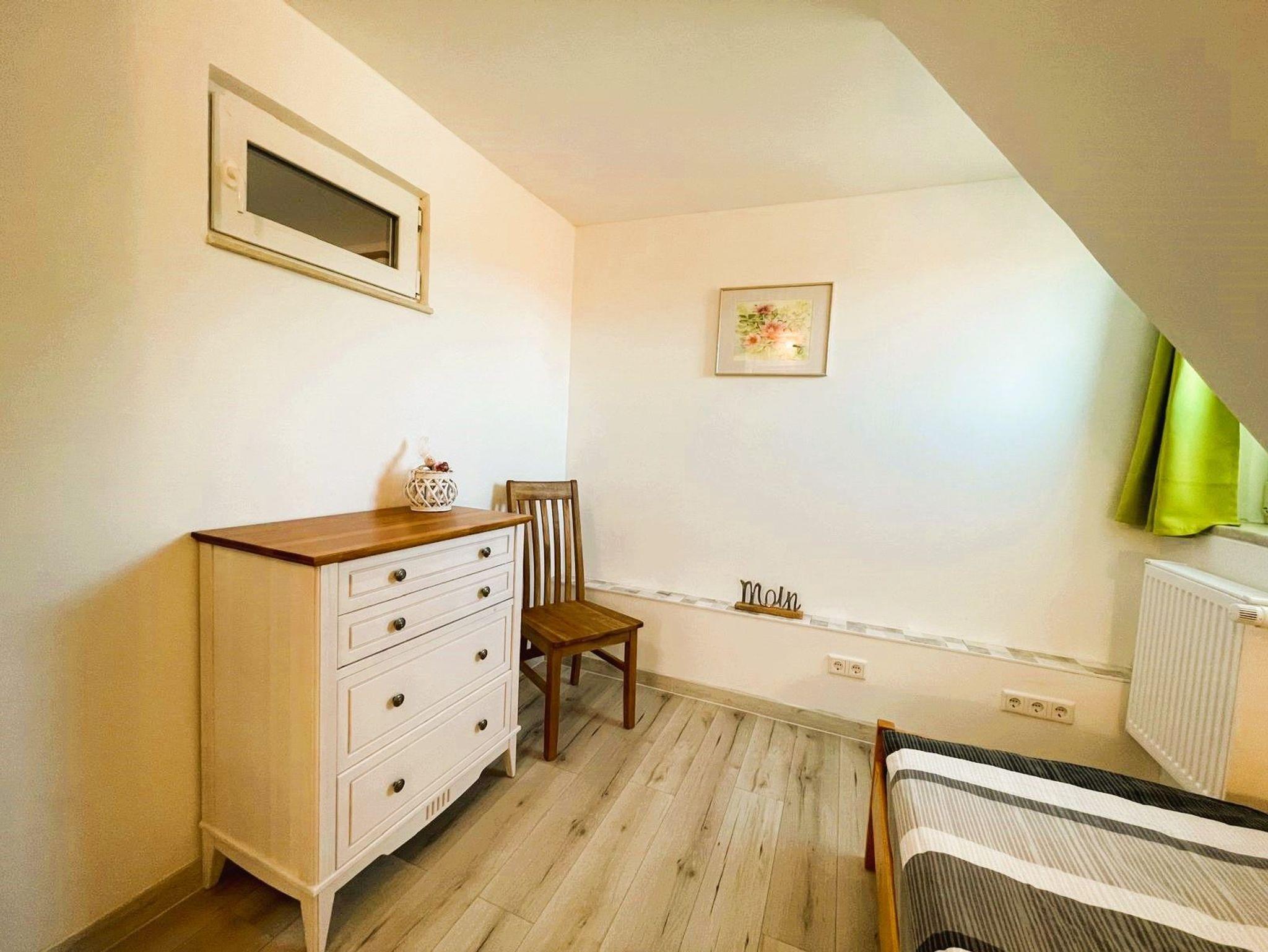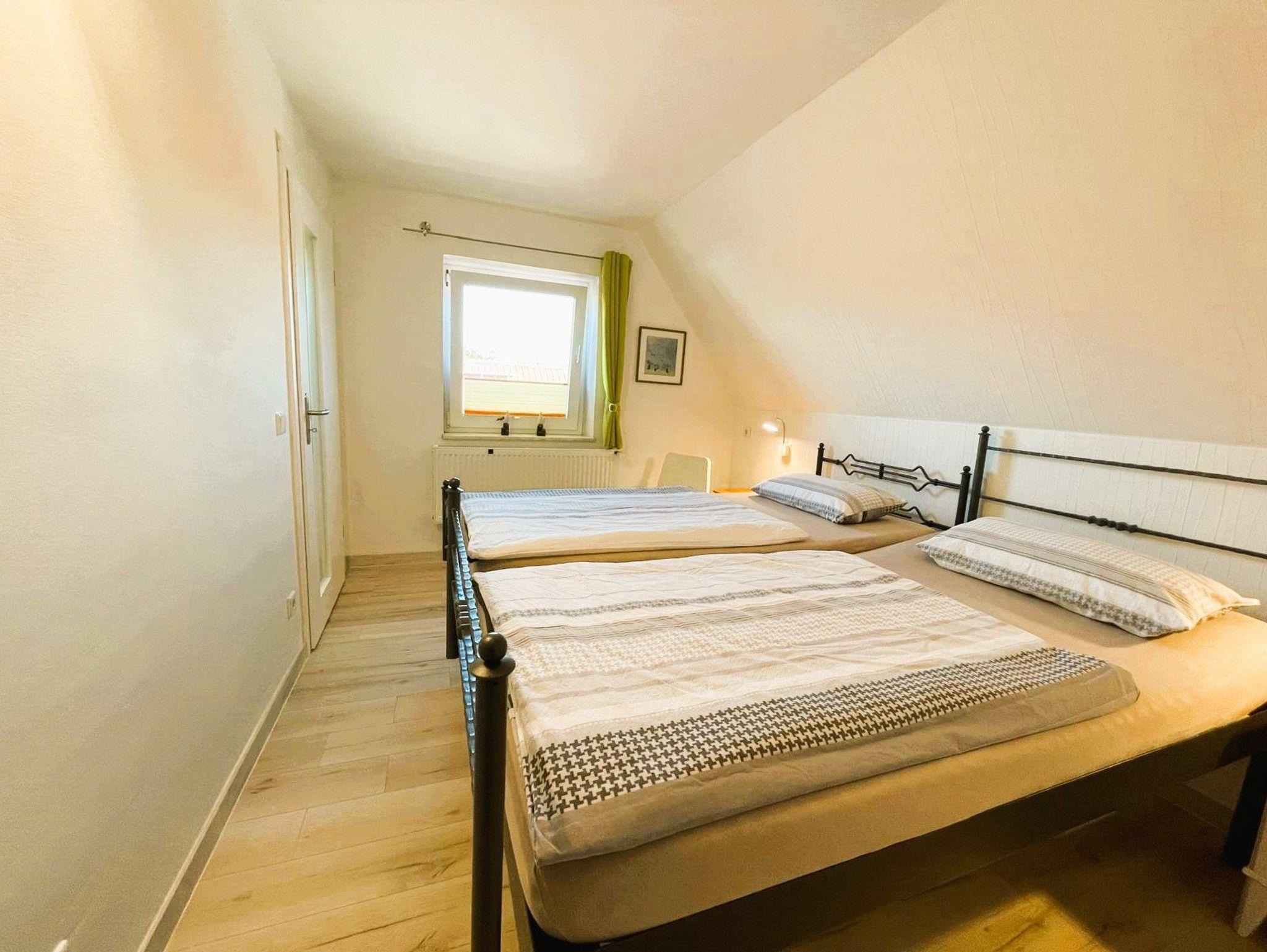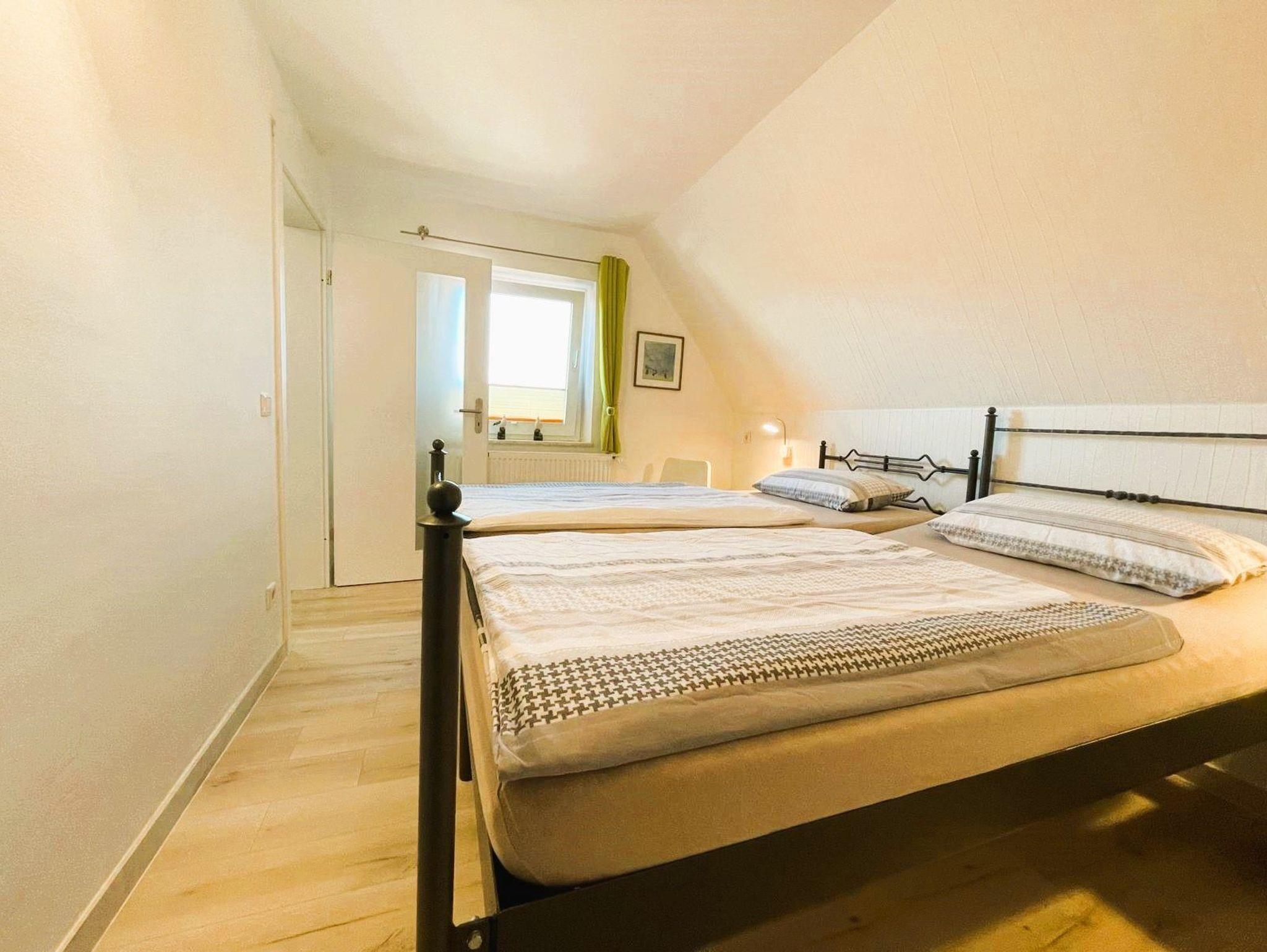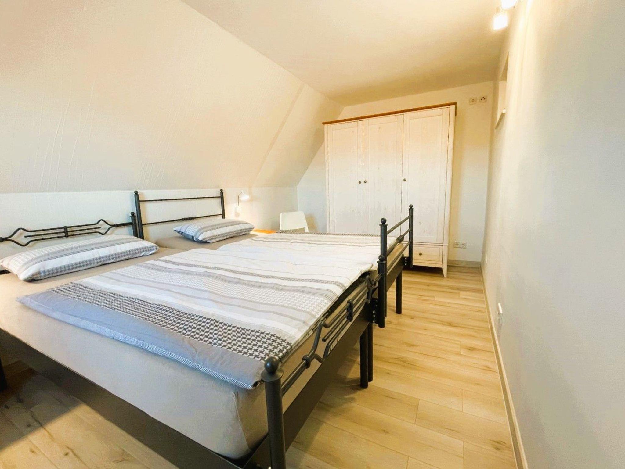 Das Tageslichtbad auf gleicher Ebene begeistert mit einer ebenerdigen Dusche, einem praktischen Waschtisch und WC. Im Obergeschoss finden Sie zwei liebevoll eingerichtete Schlafzimmer: eines mit einem gemütlichen Doppelbett, das andere mit einem Einzelbett. Beide Zimmer sind mit Kleiderablagen und Nachttischlampen ausgestattet, um Ihren Aufenthalt so angenehm wie möglich zu gestalten.