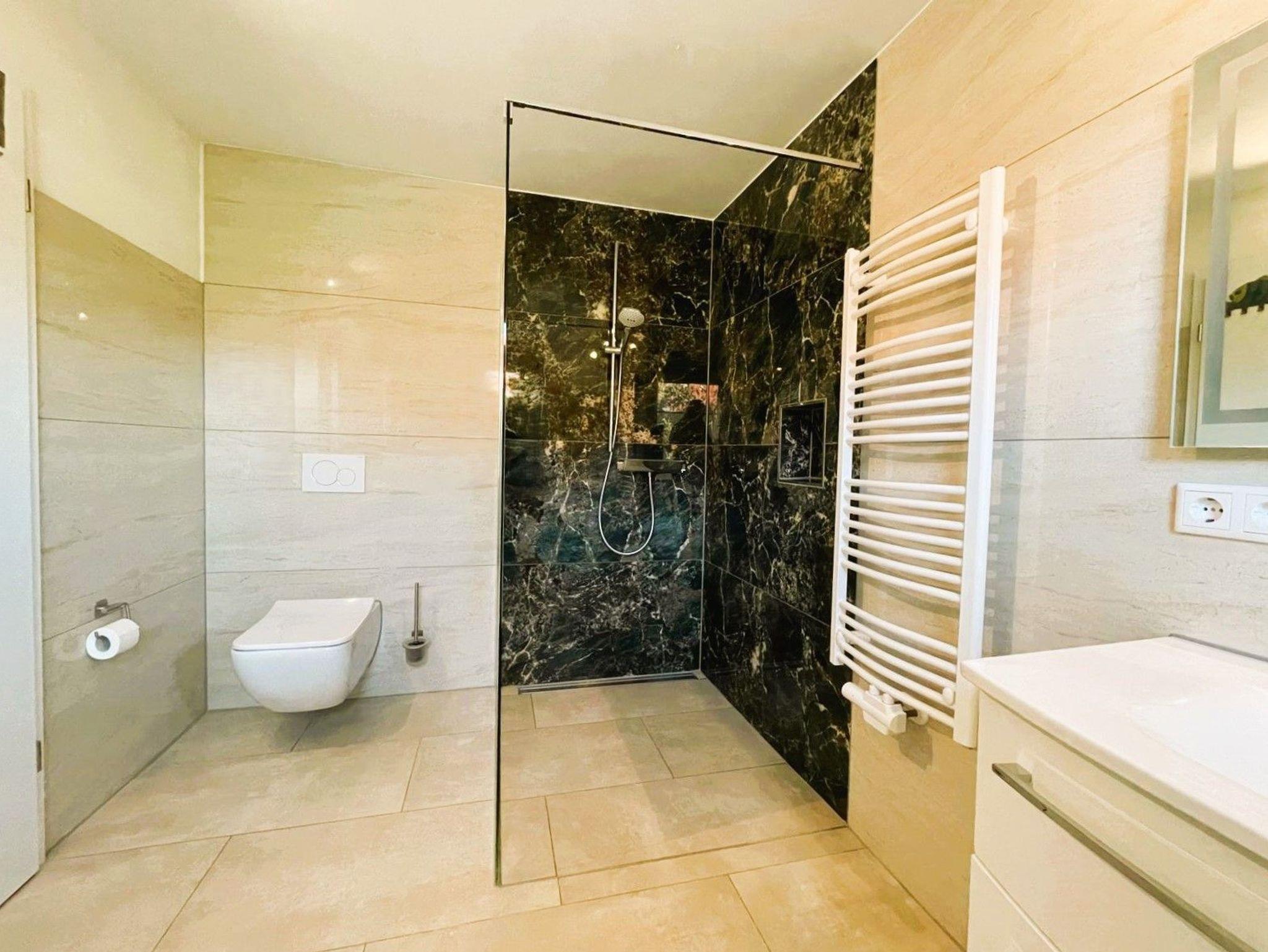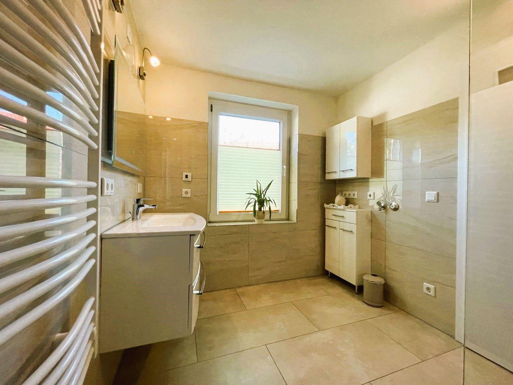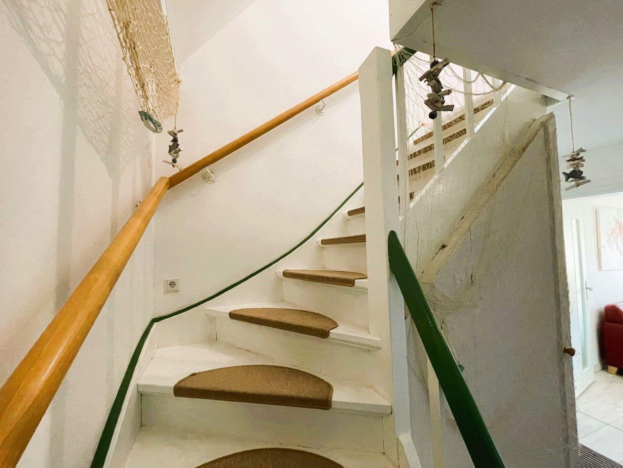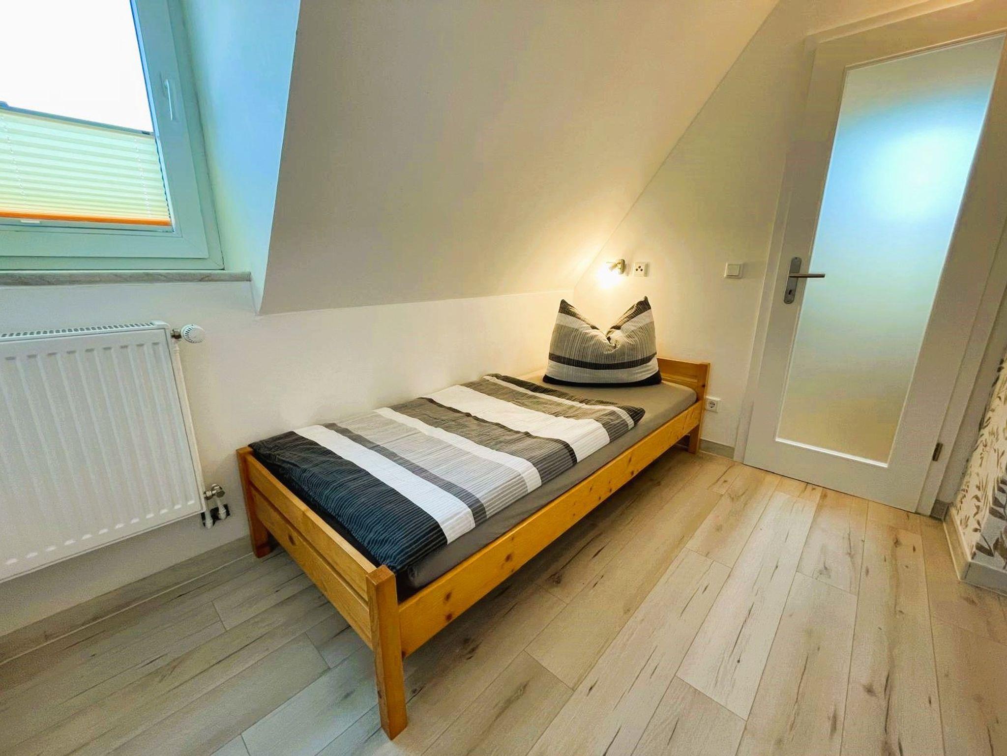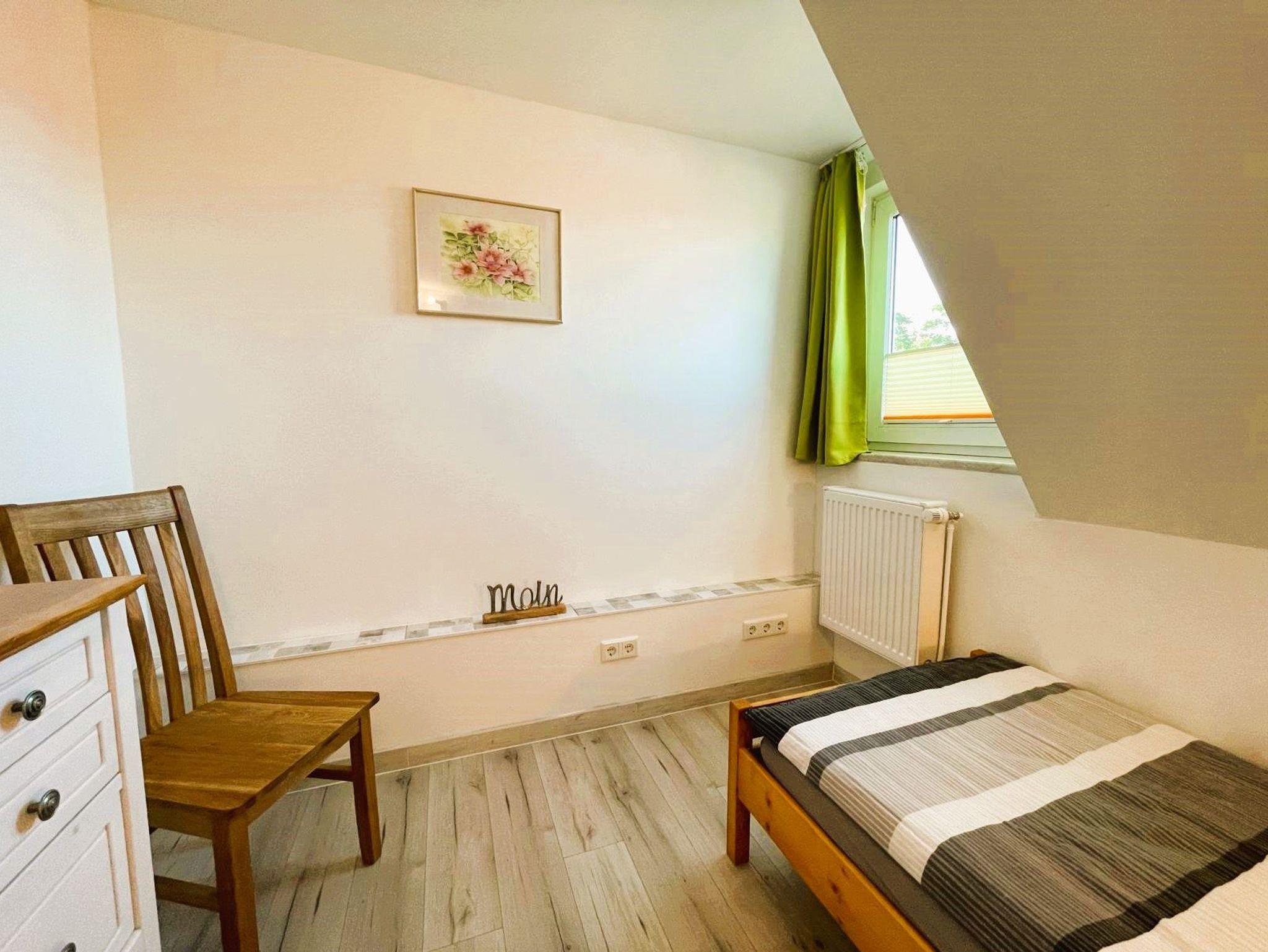 Das Tageslichtbad auf gleicher Ebene begeistert mit einer ebenerdigen Dusche, einem praktischen Waschtisch und WC. Im Obergeschoss finden Sie zwei liebevoll eingerichtete Schlafzimmer: eines mit einem gemütlichen Doppelbett, das andere mit einem Einzelbett. Beide Zimmer sind mit Kleiderablagen und Nachttischlampen ausgestattet, um Ihren Aufenthalt so angenehm wie möglich zu gestalten.